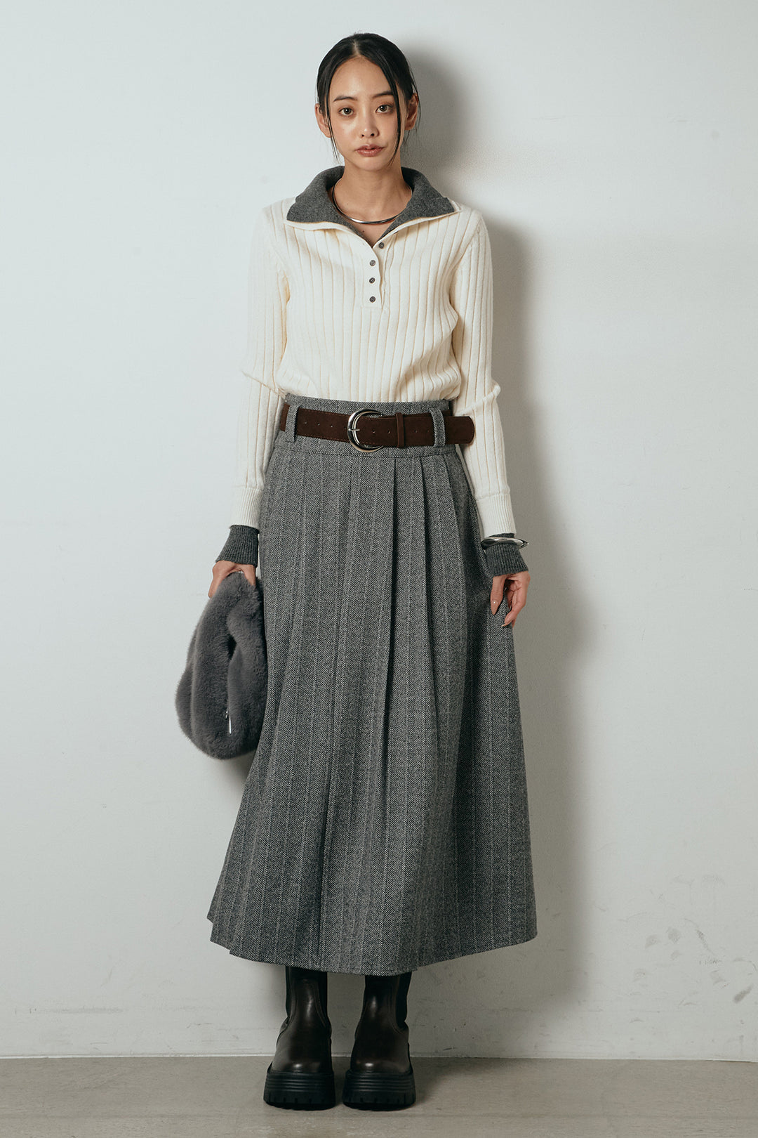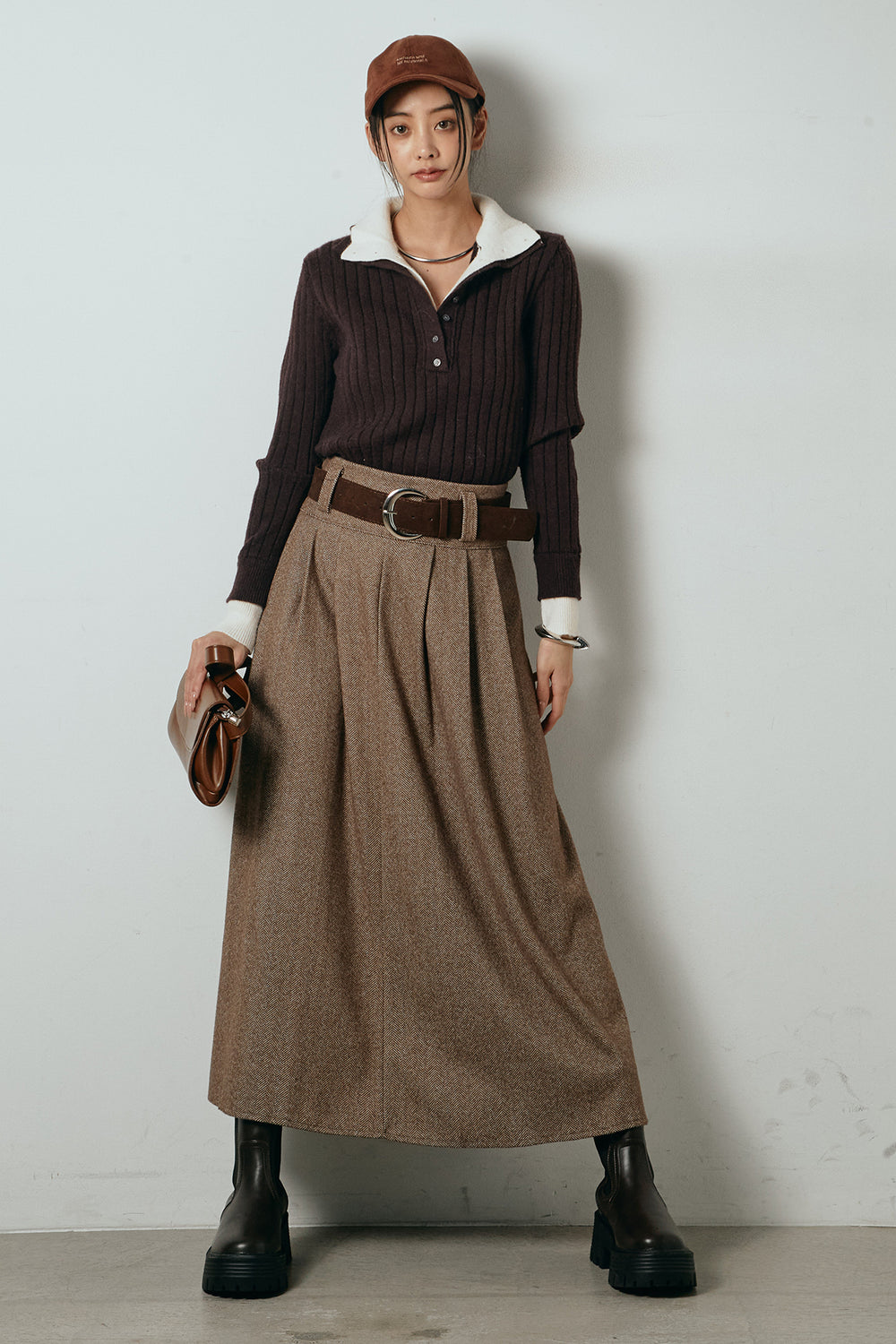 [SET]レイヤード風リブニットトップス+太ベルト付きヘリンボーンプリーツスカート(2set)