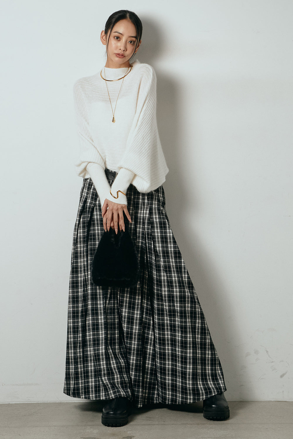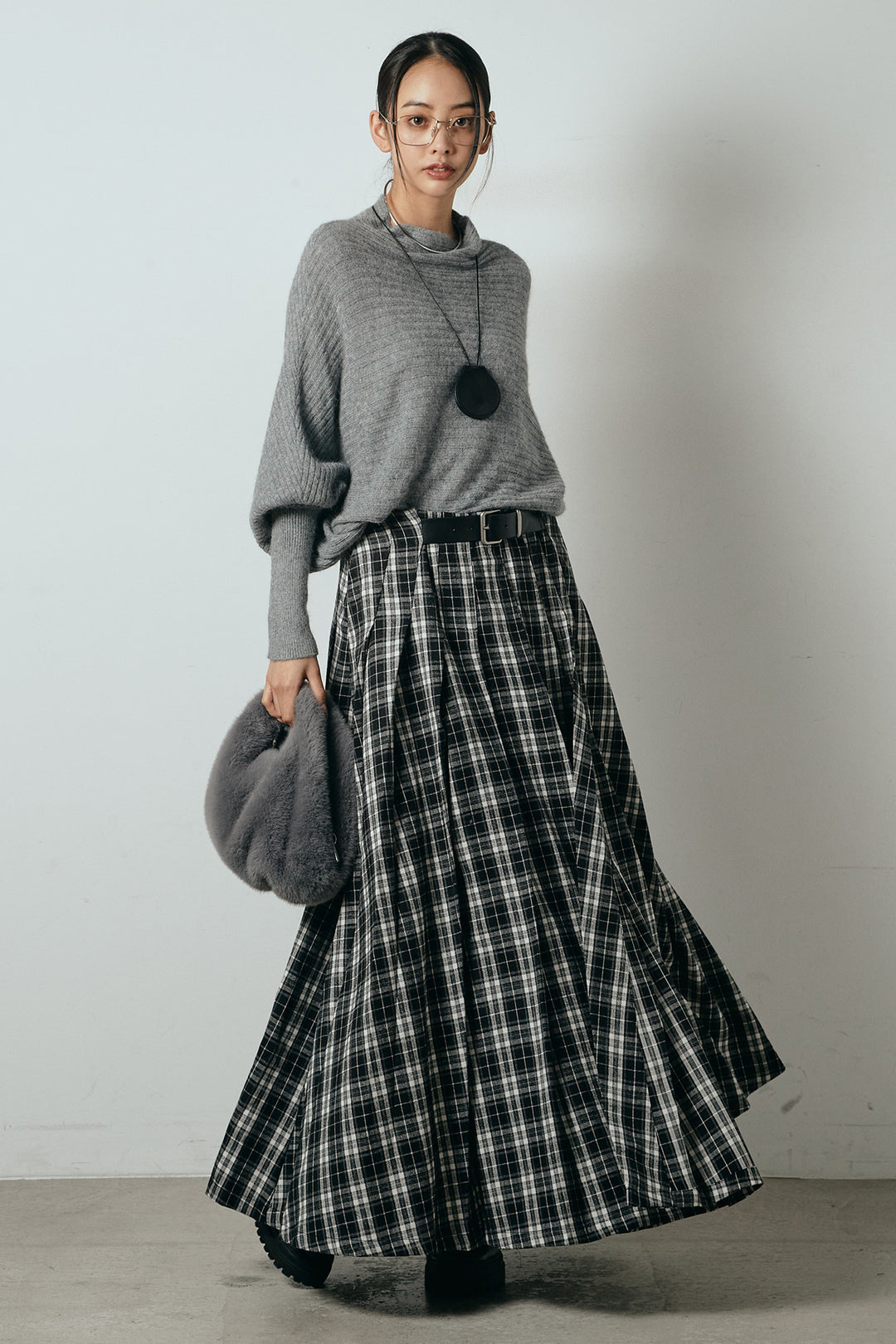 [SET]ポンチョシルエット透かしニットトップス+ベルト付きタータンチェックプリーツスカート(2set)