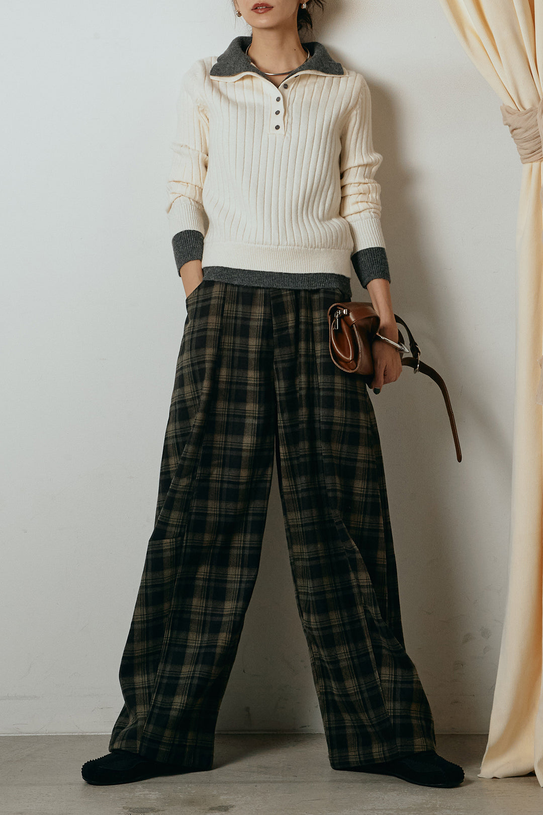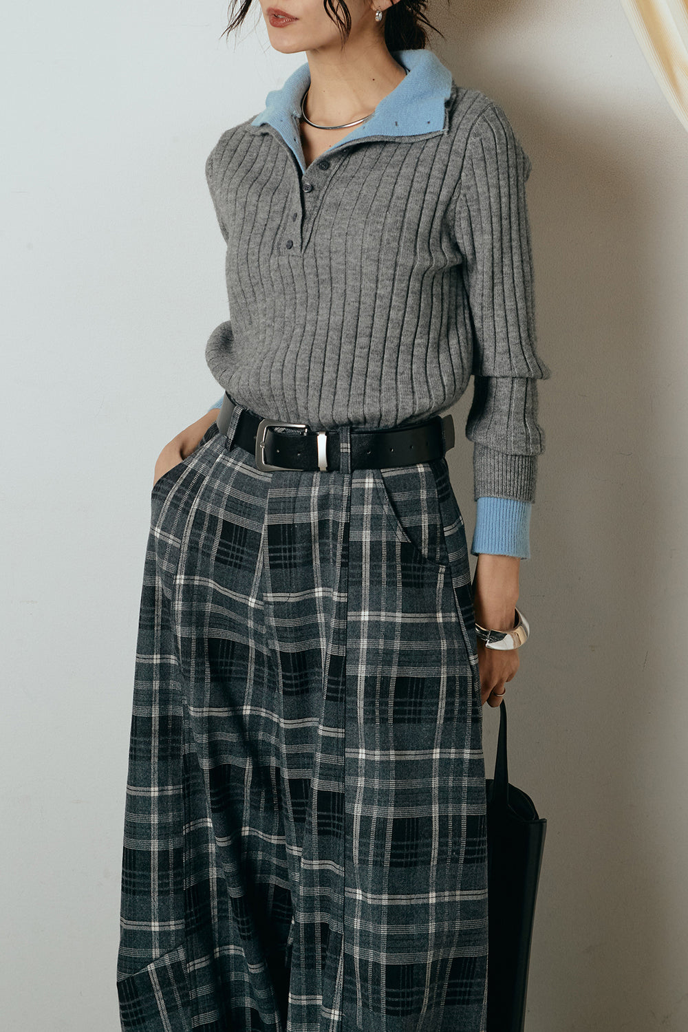 [SET]レイヤード風リブニットトップス+ベルト付きタータンチェックカーブワイドパンツ(2set)