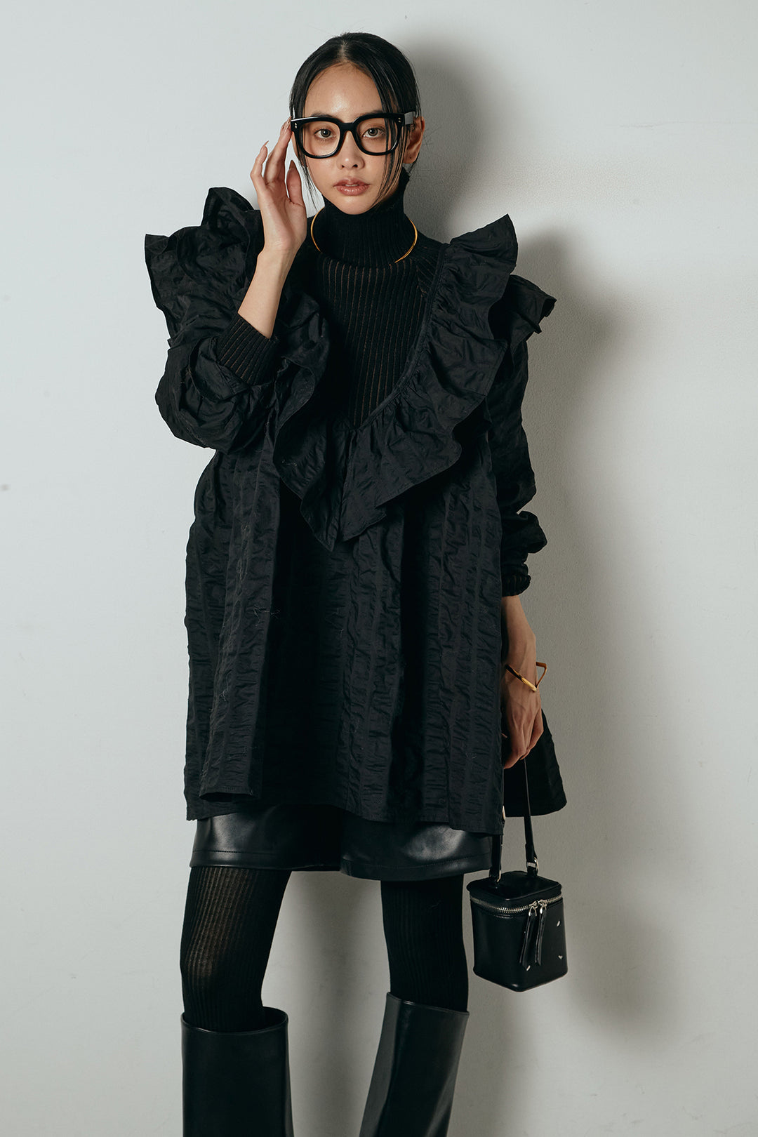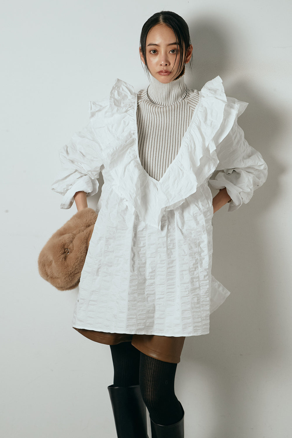 [SET]Vネックフリルカラーブラウス+リブニットシームレスタートルプルオーバー(2set)
