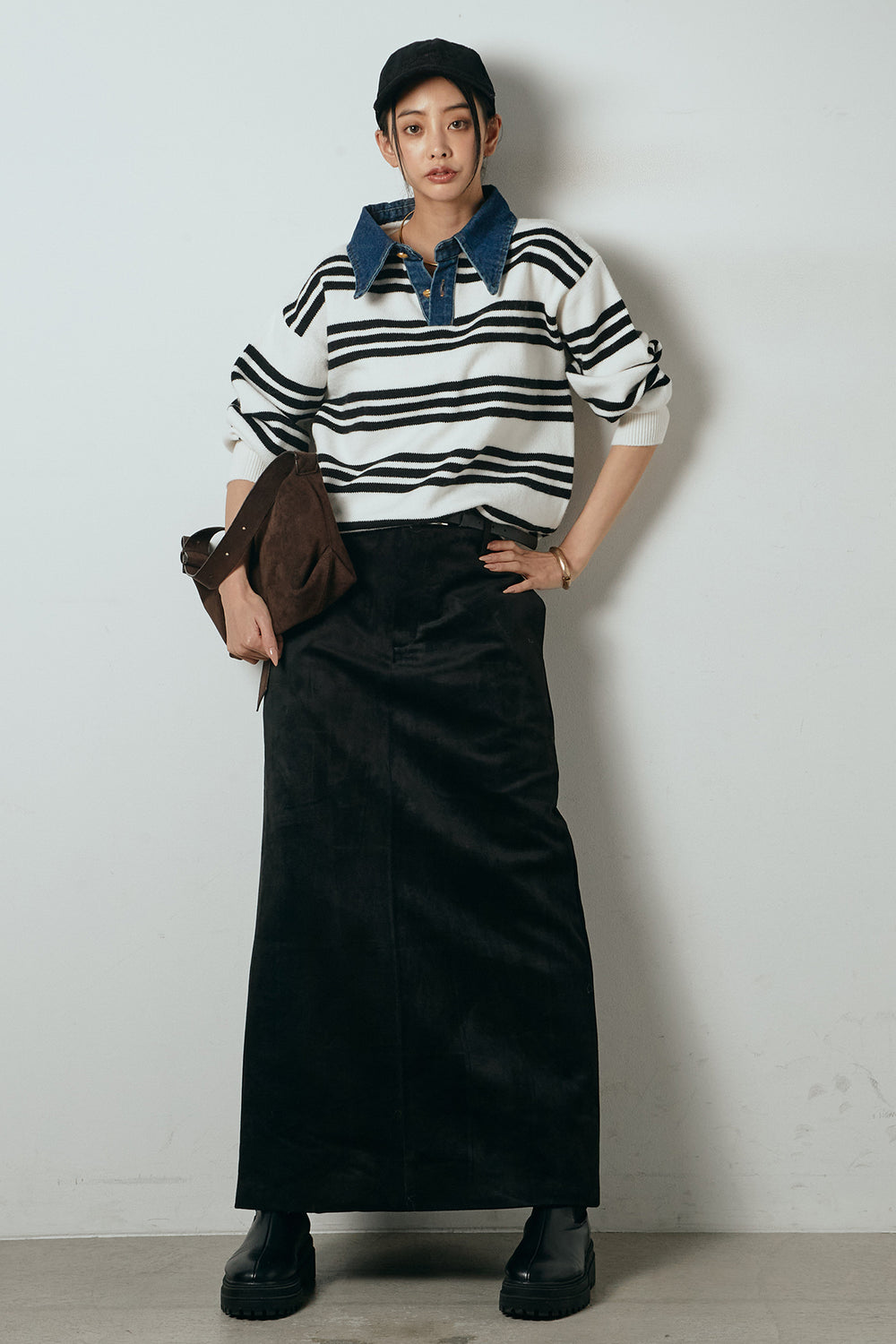 [SET]デニムレイヤード風ランダムボーダーニットプルオーバー+エコスウェードワイドスカート(2set)