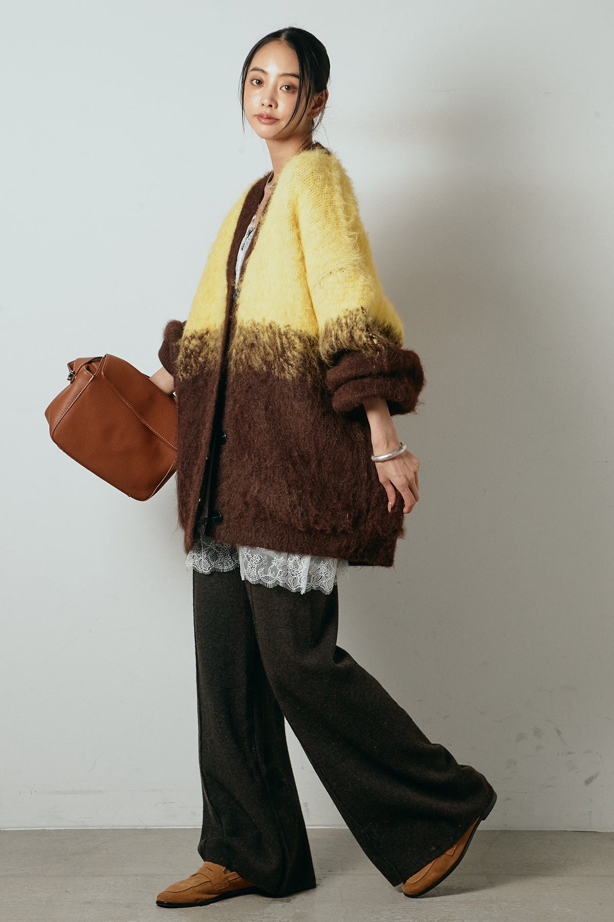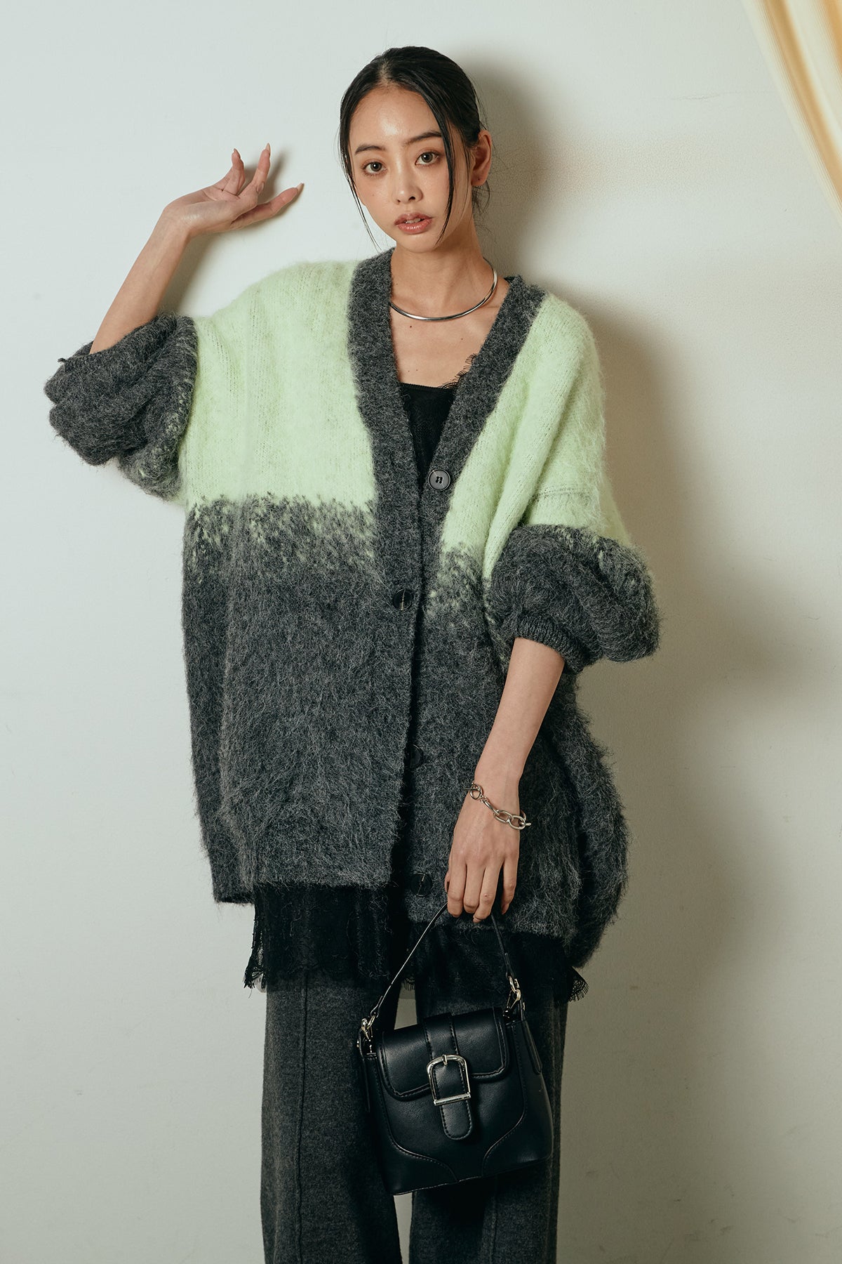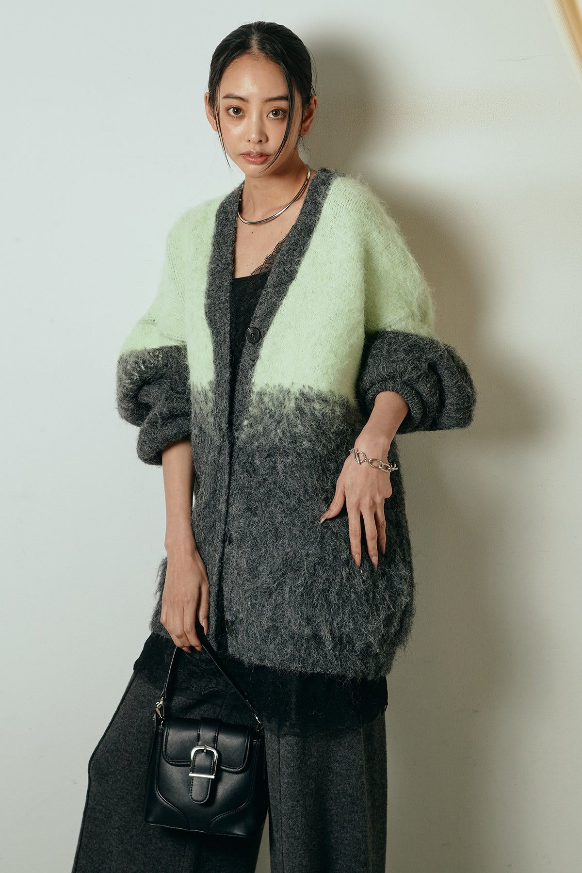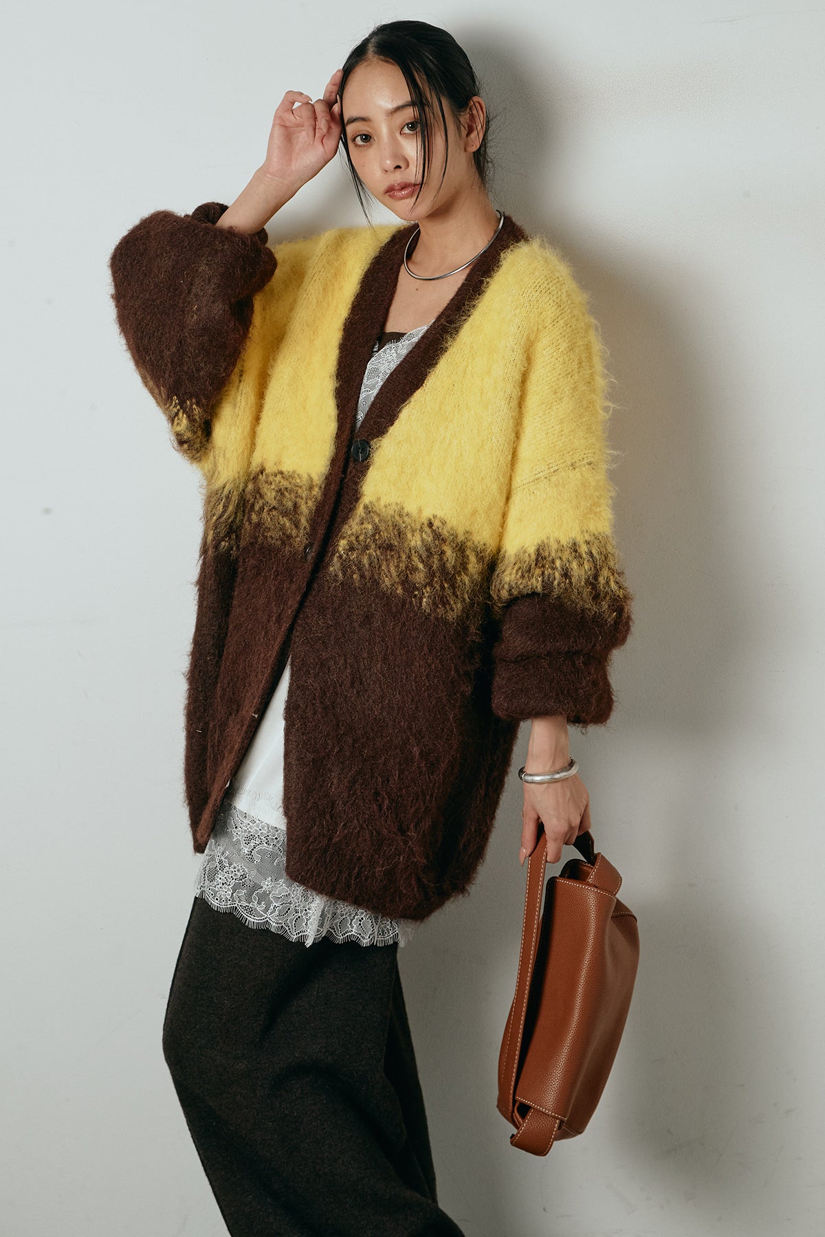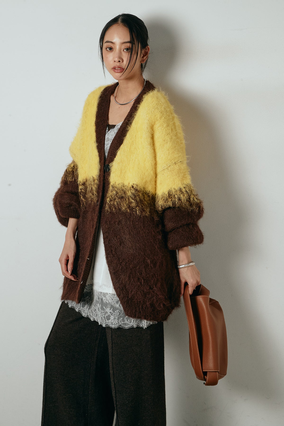 起毛感のある素材にグラデーションデザインを取り入れたニットカーディガン。 自然な色の切り替えがあり、シンプルなスタイリングでも程よくアクセントになります。 ゆとりのあるシルエットで、インナーを選ばず羽織りやすいデザイン。 デイリー使いから外出まで、幅広く取り入れやすい一着です。