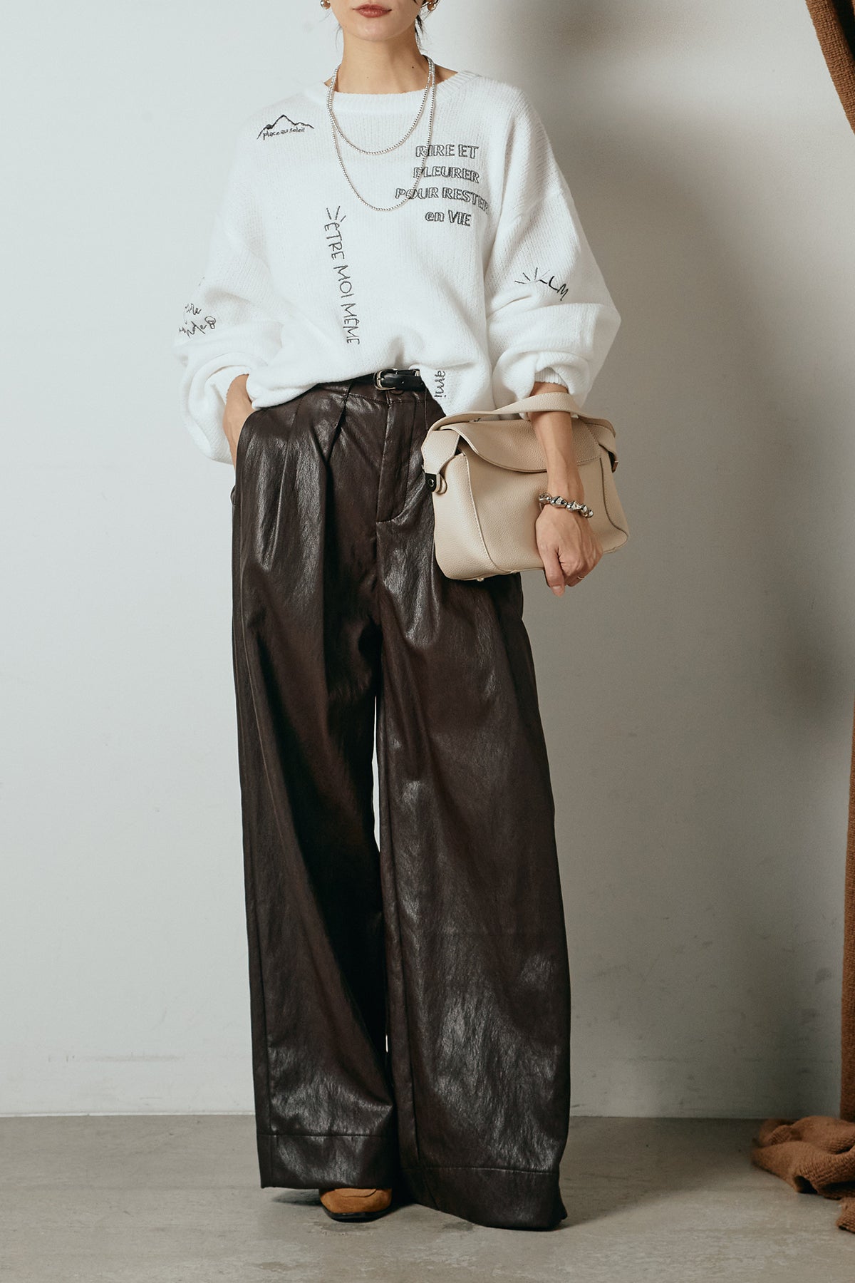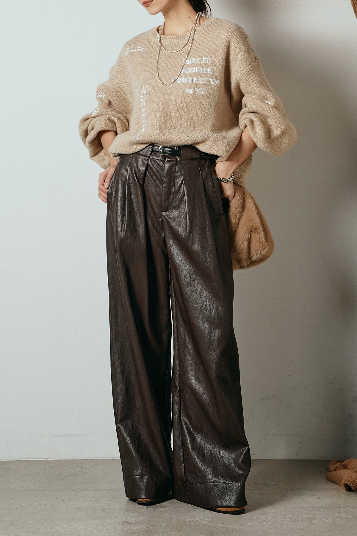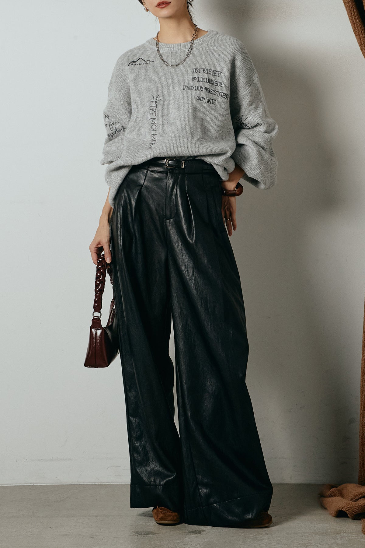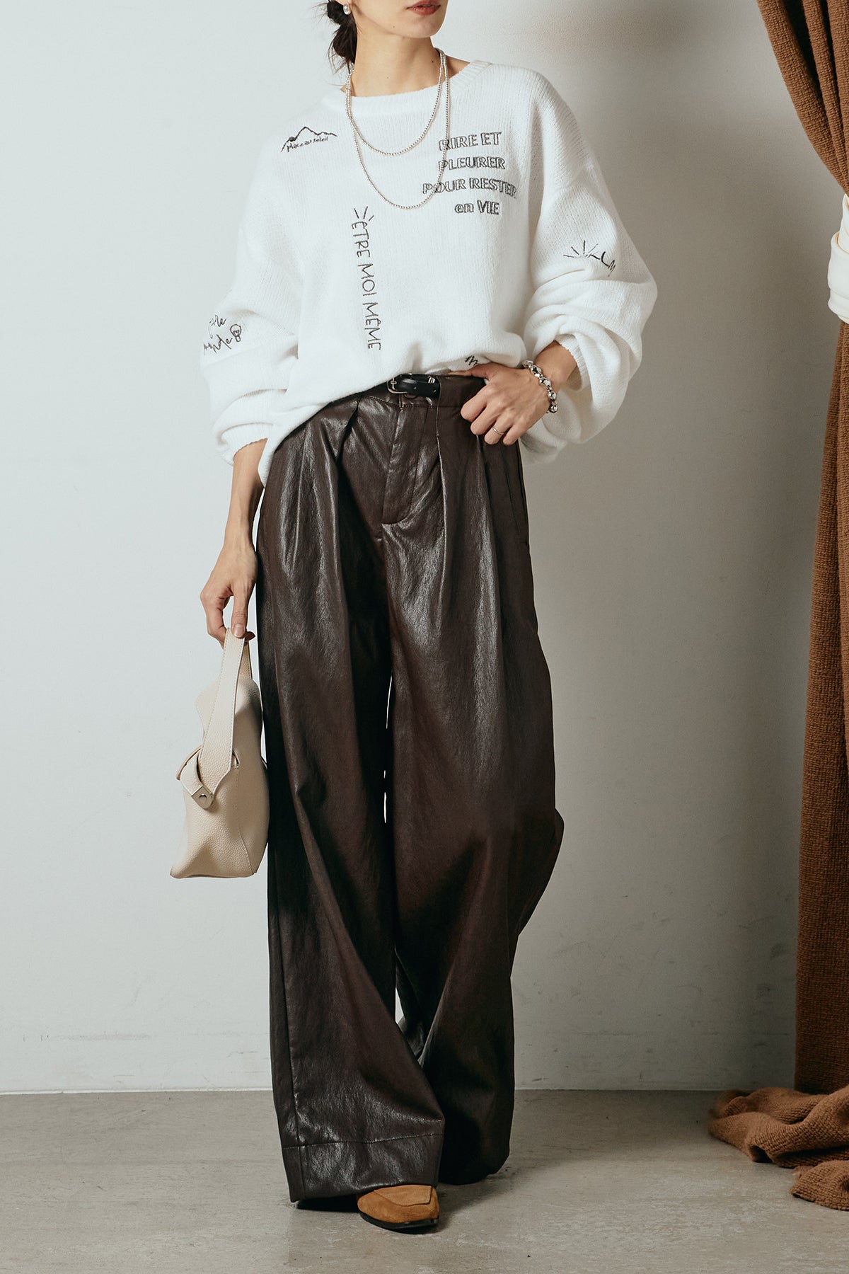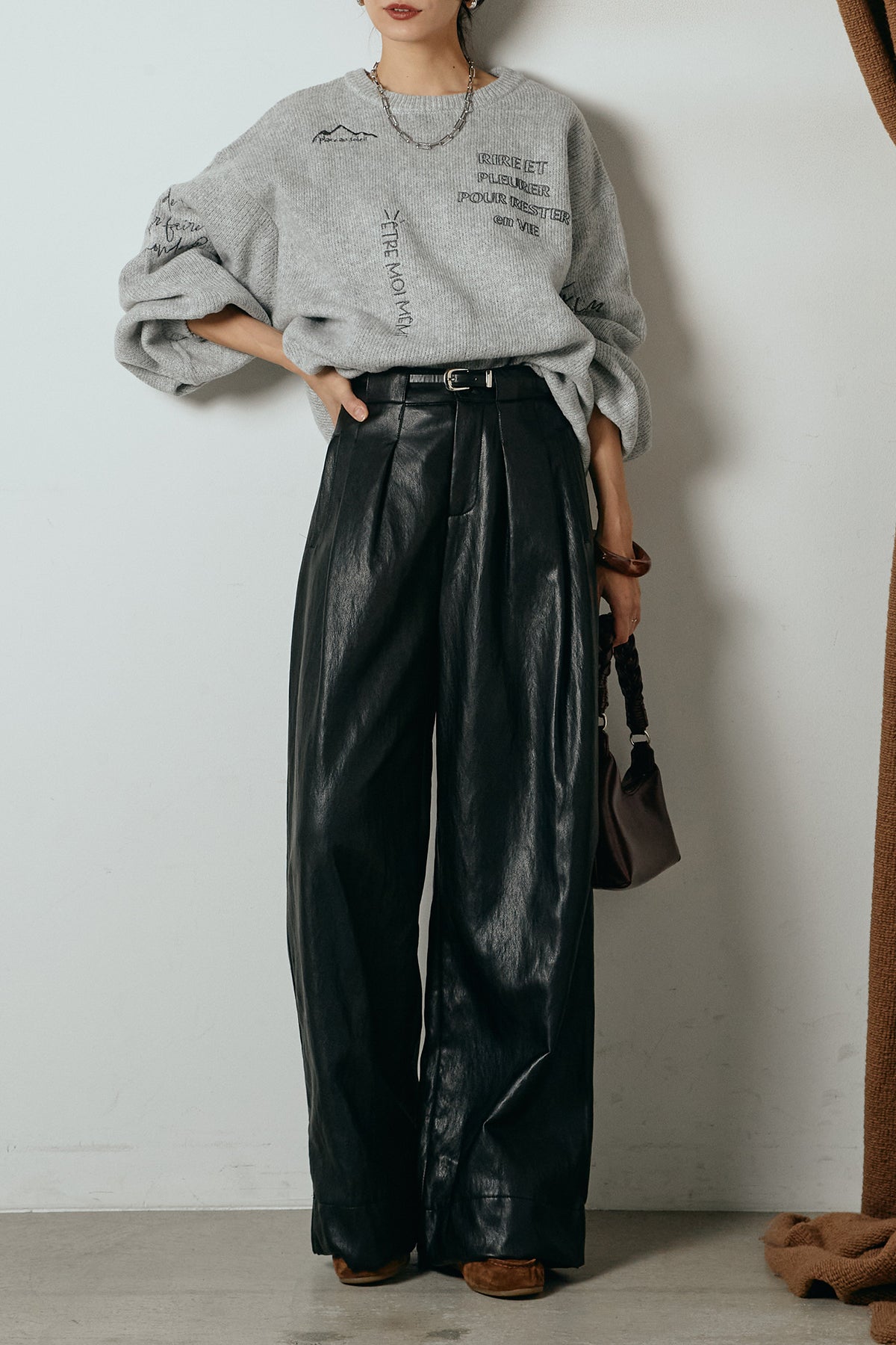 [SET]刺繍ロゴランダムデザインニットトップス+ベルト付きレザーライクタックパンツ(2set)