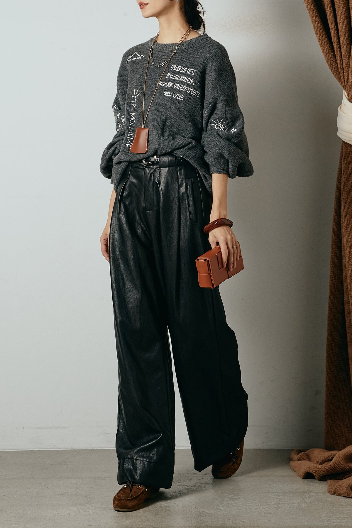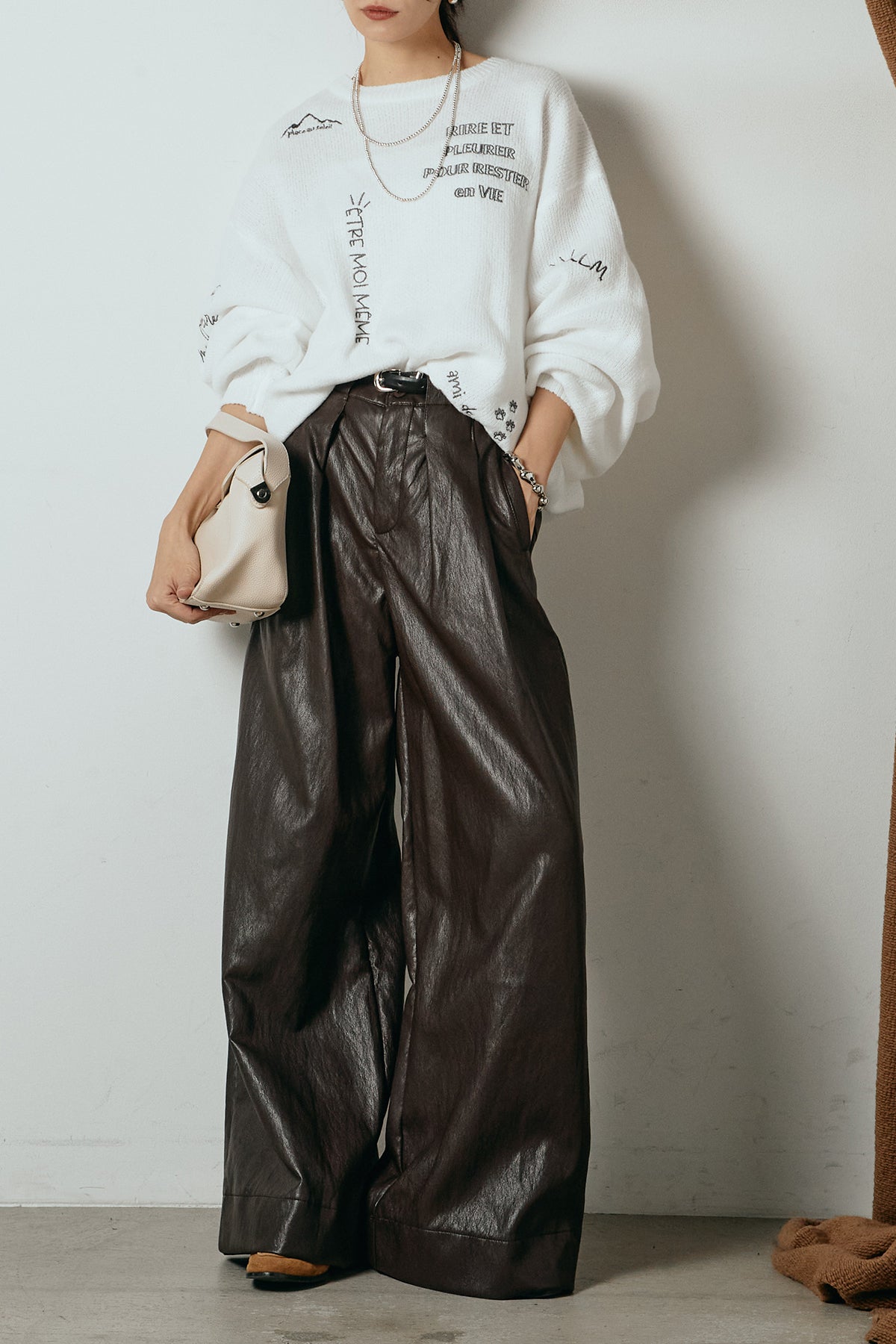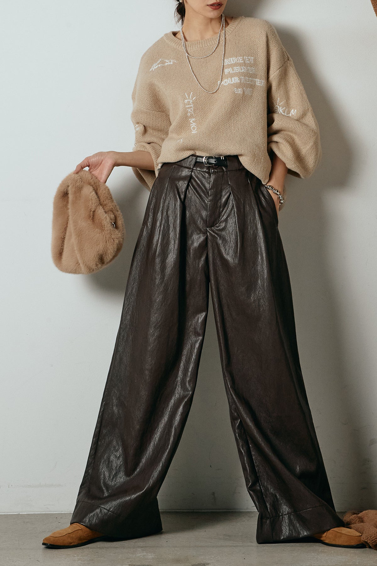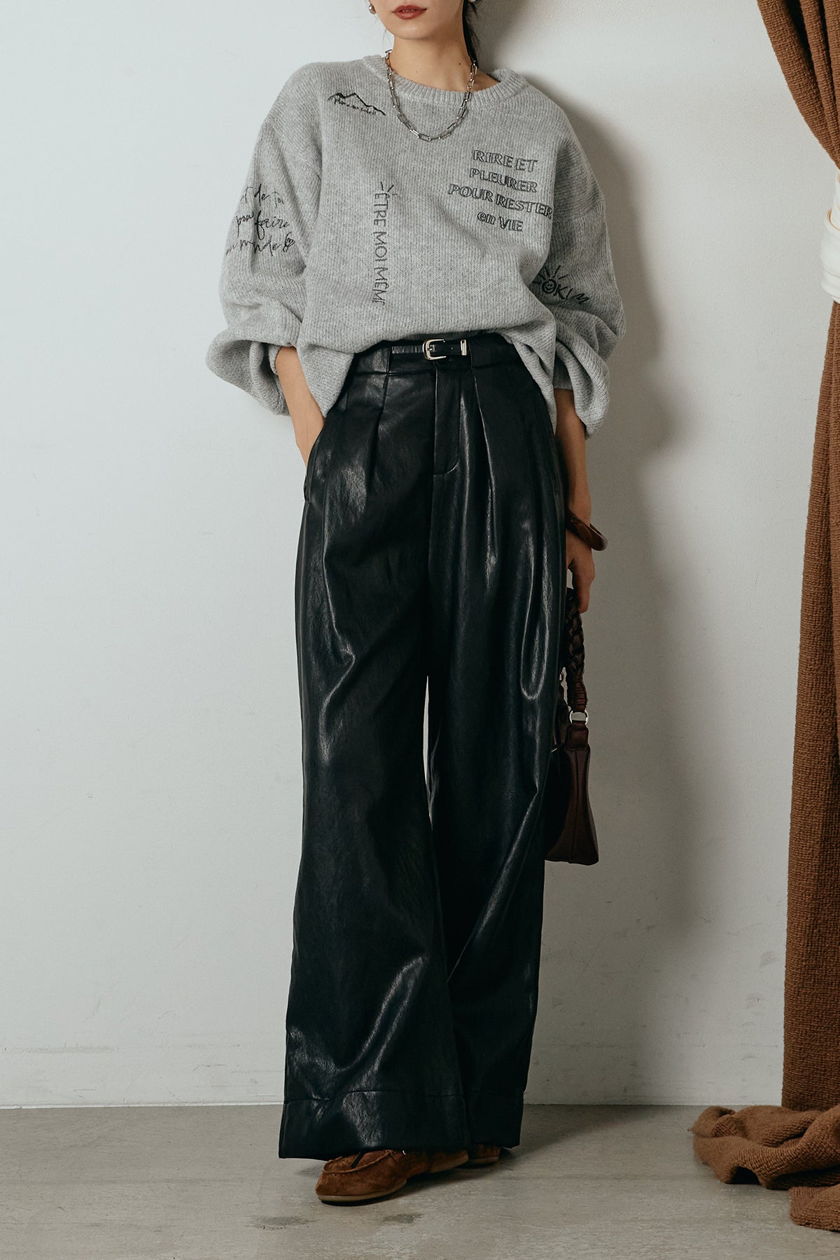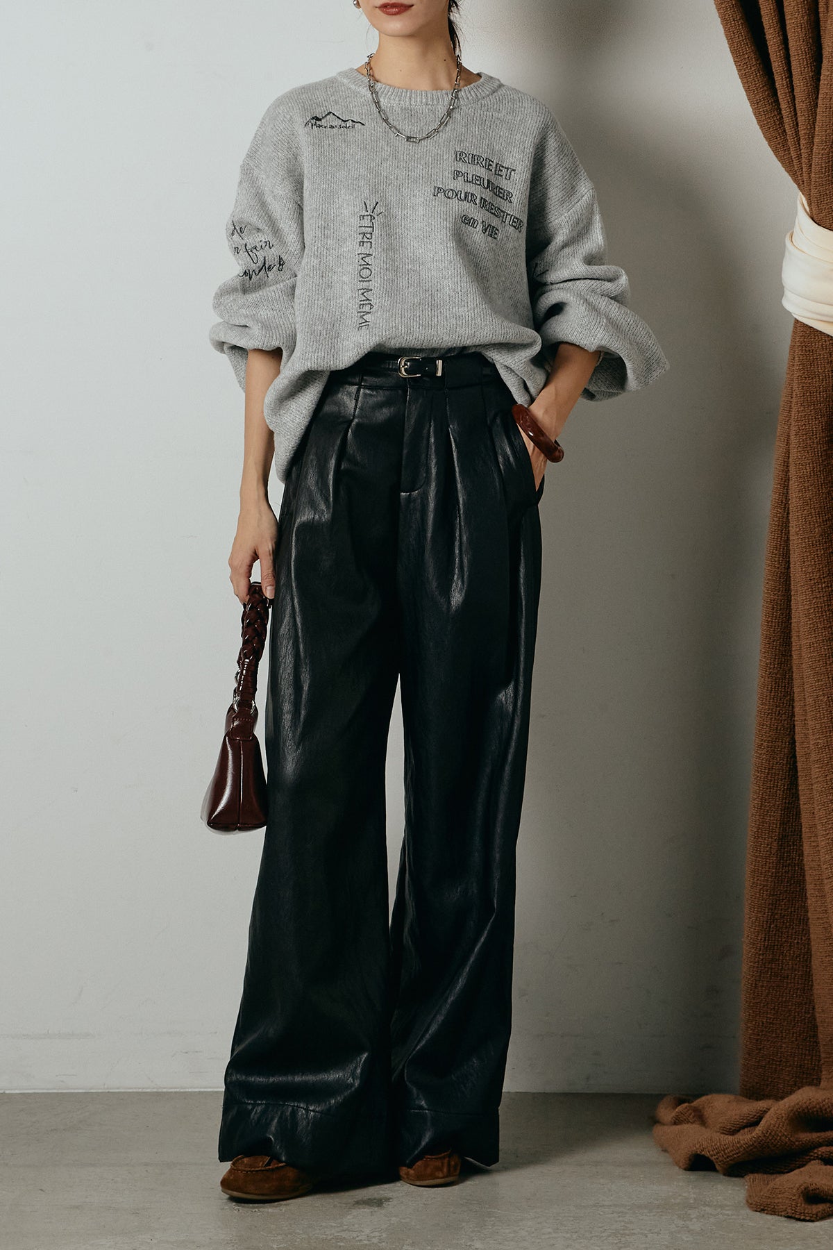 [SET]刺繍ロゴランダムデザインニットトップス+ベルト付きレザーライクタックパンツ(2set)