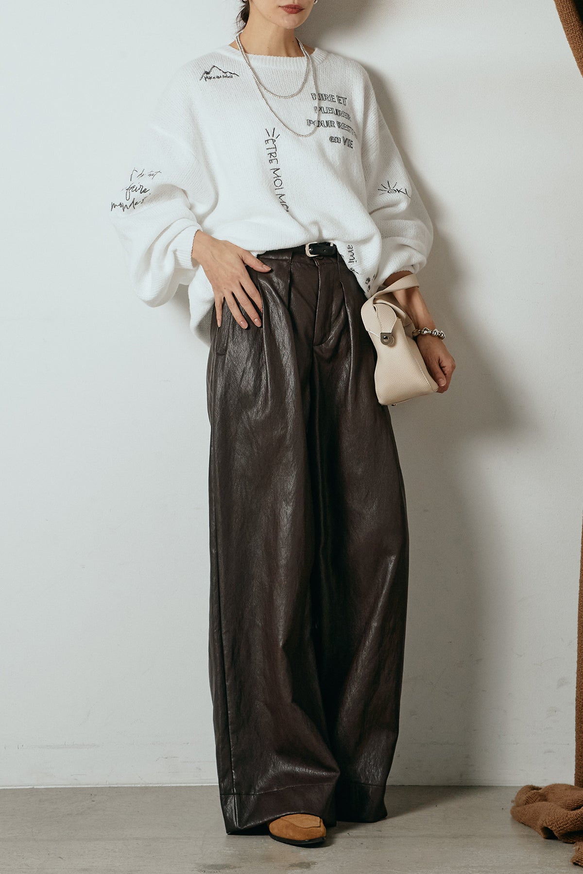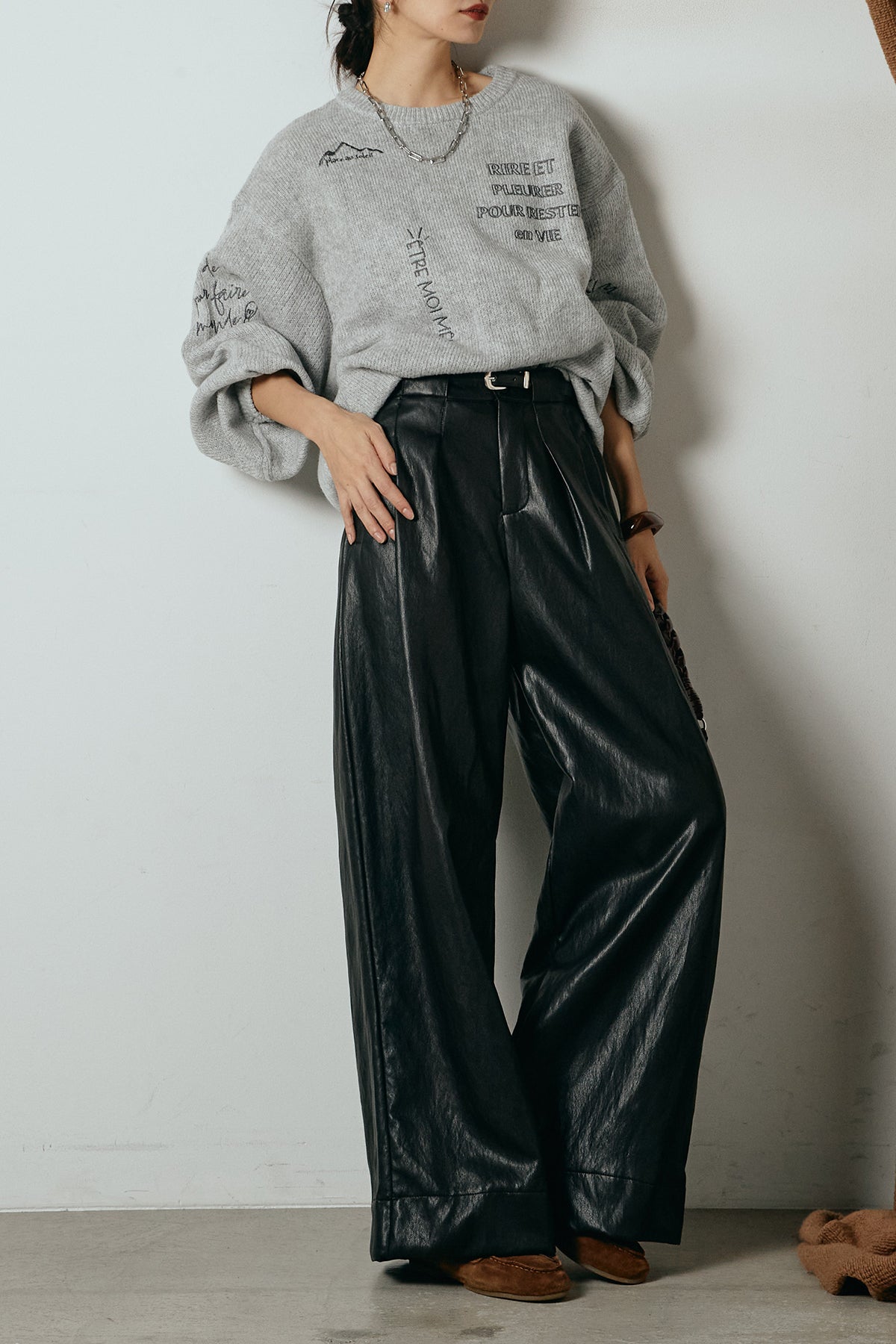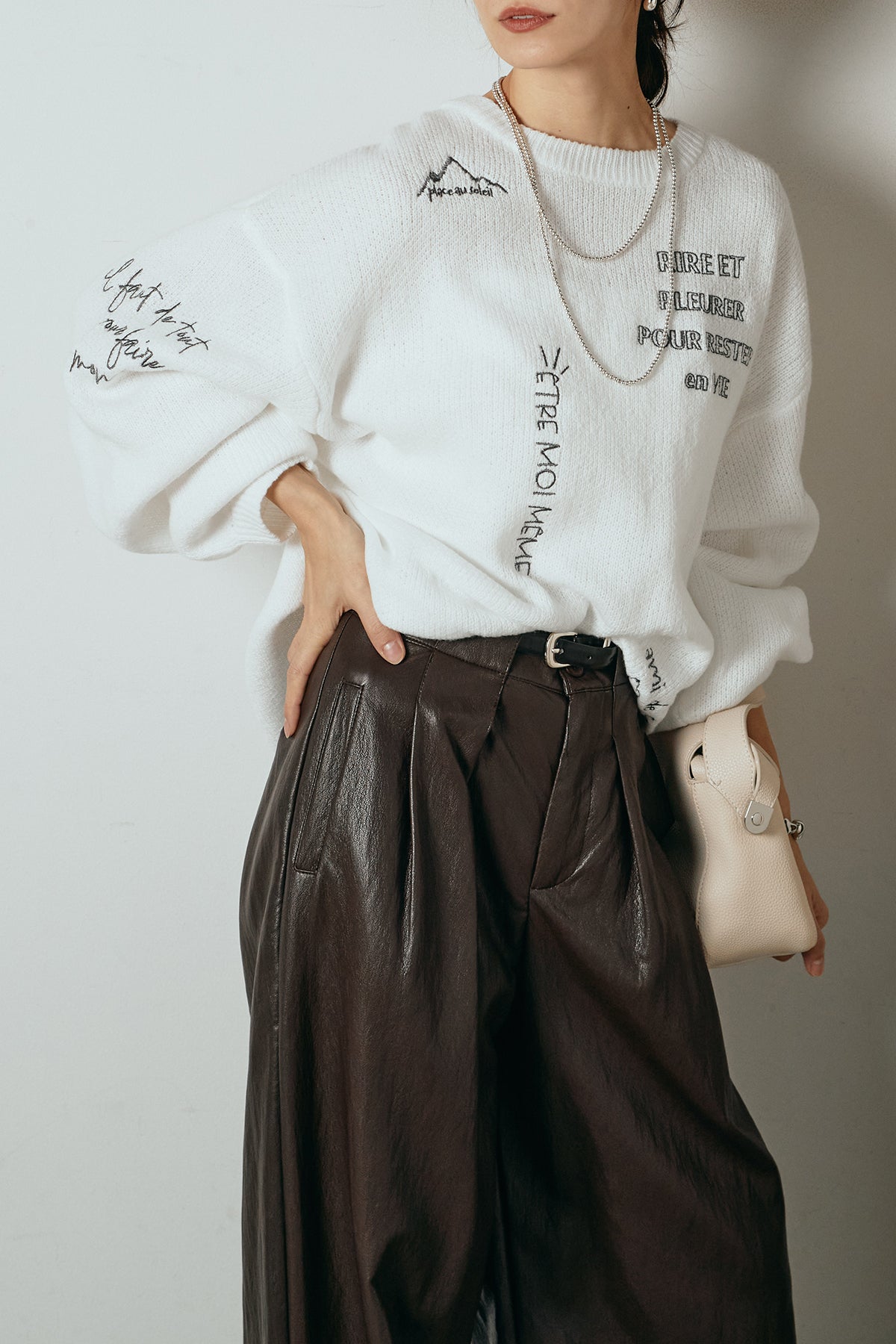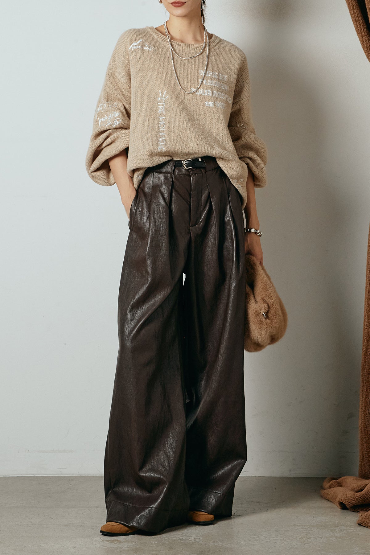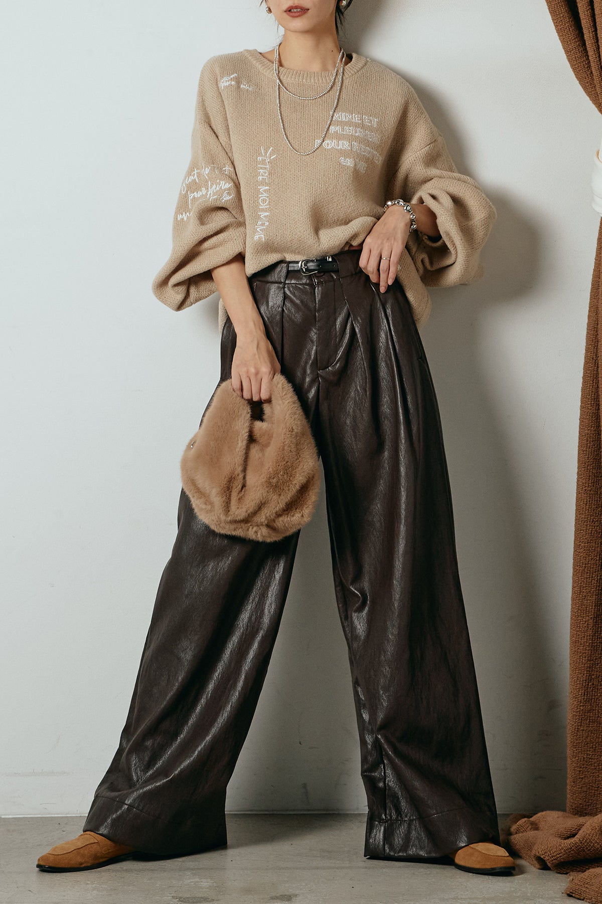 [SET]刺繍ロゴランダムデザインニットトップス+ベルト付きレザーライクタックパンツ(2set)