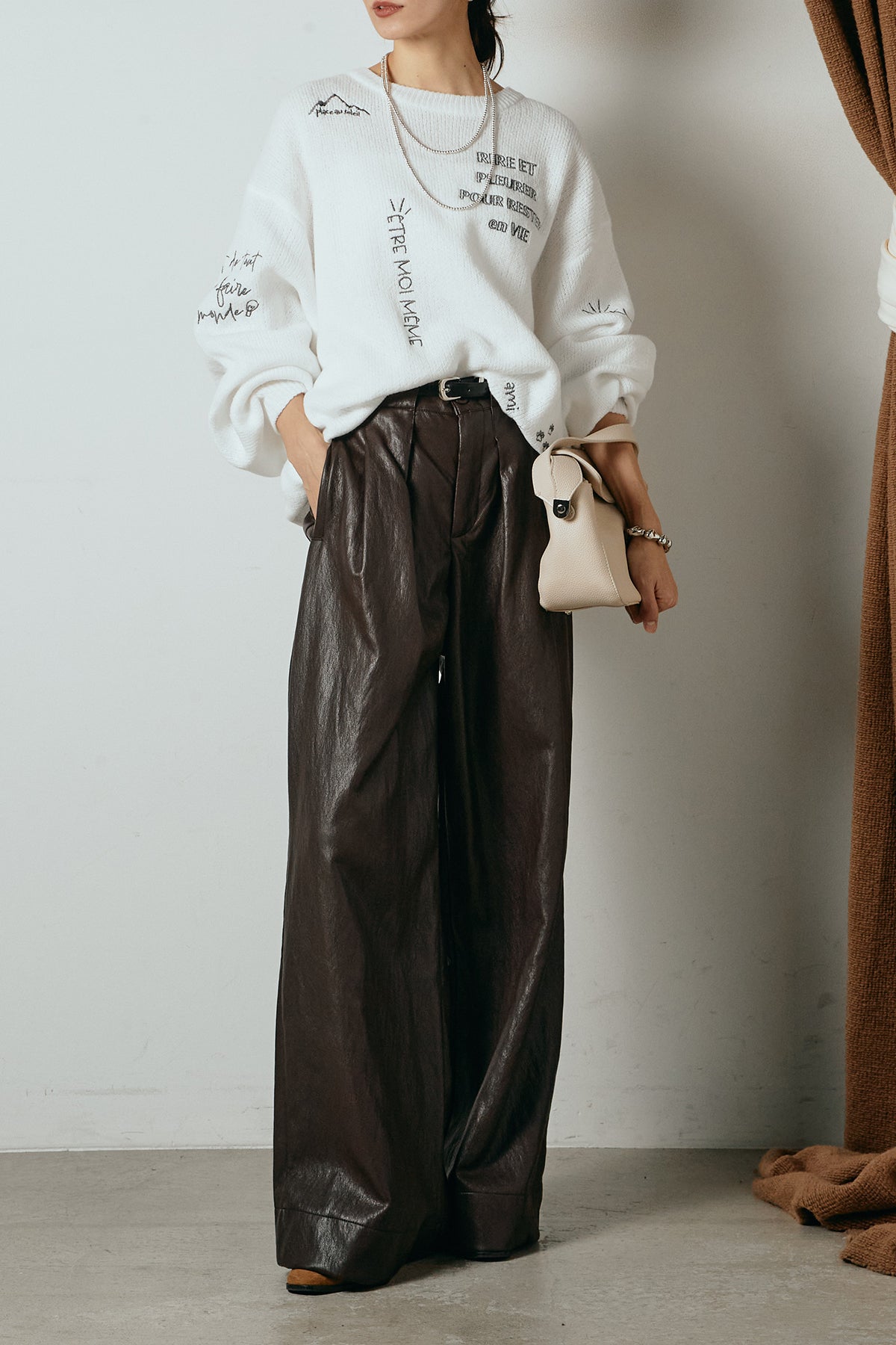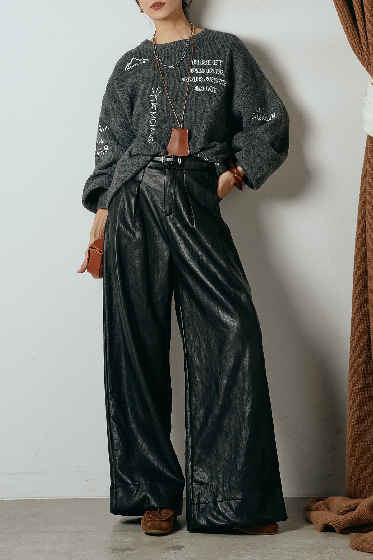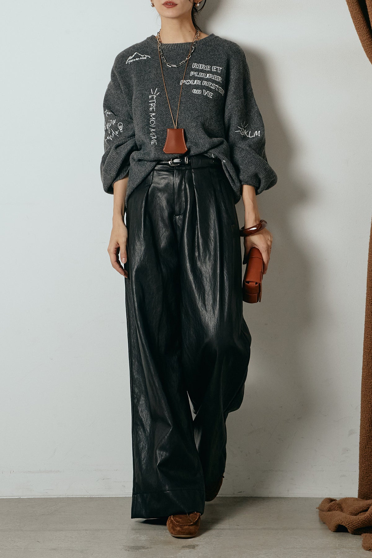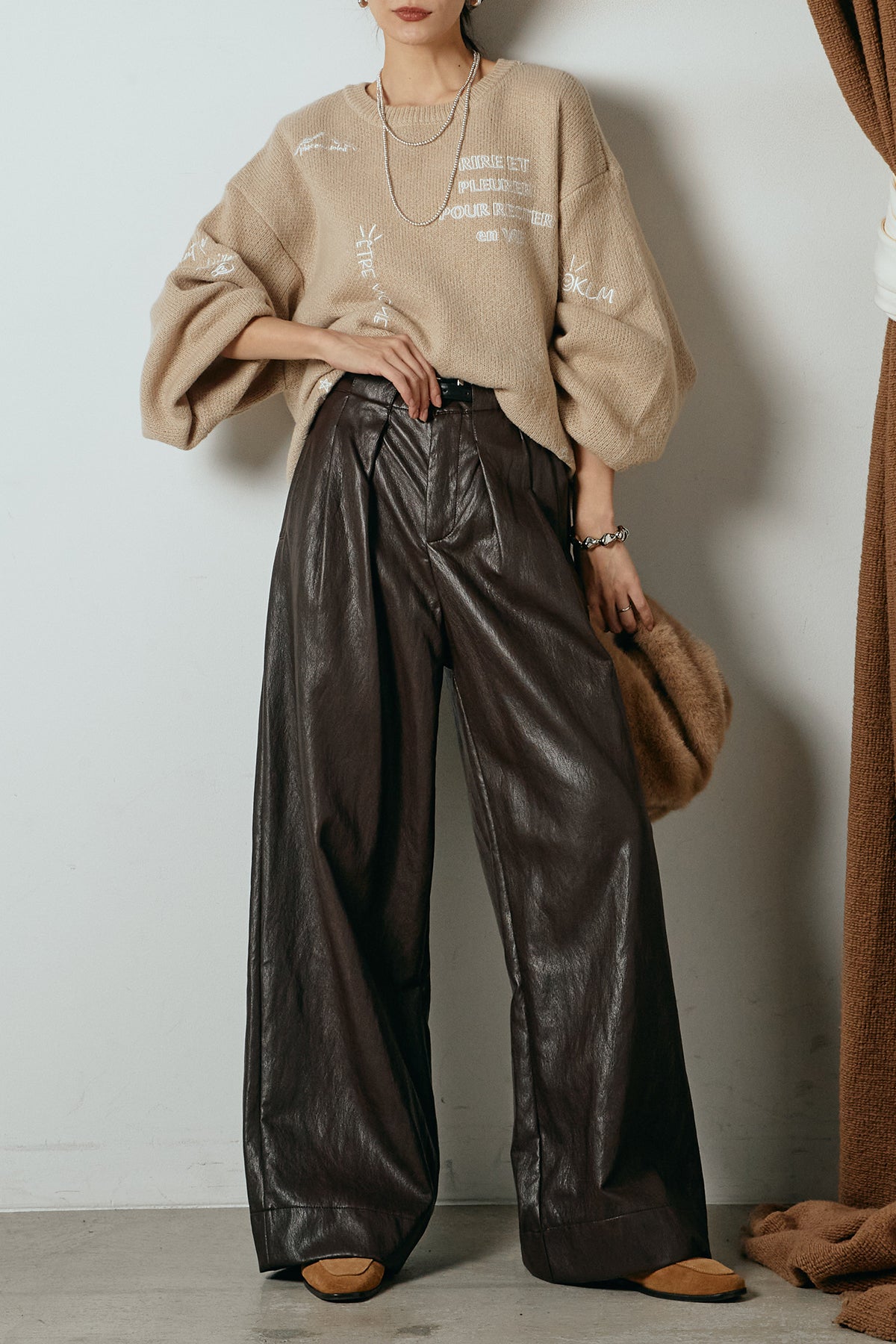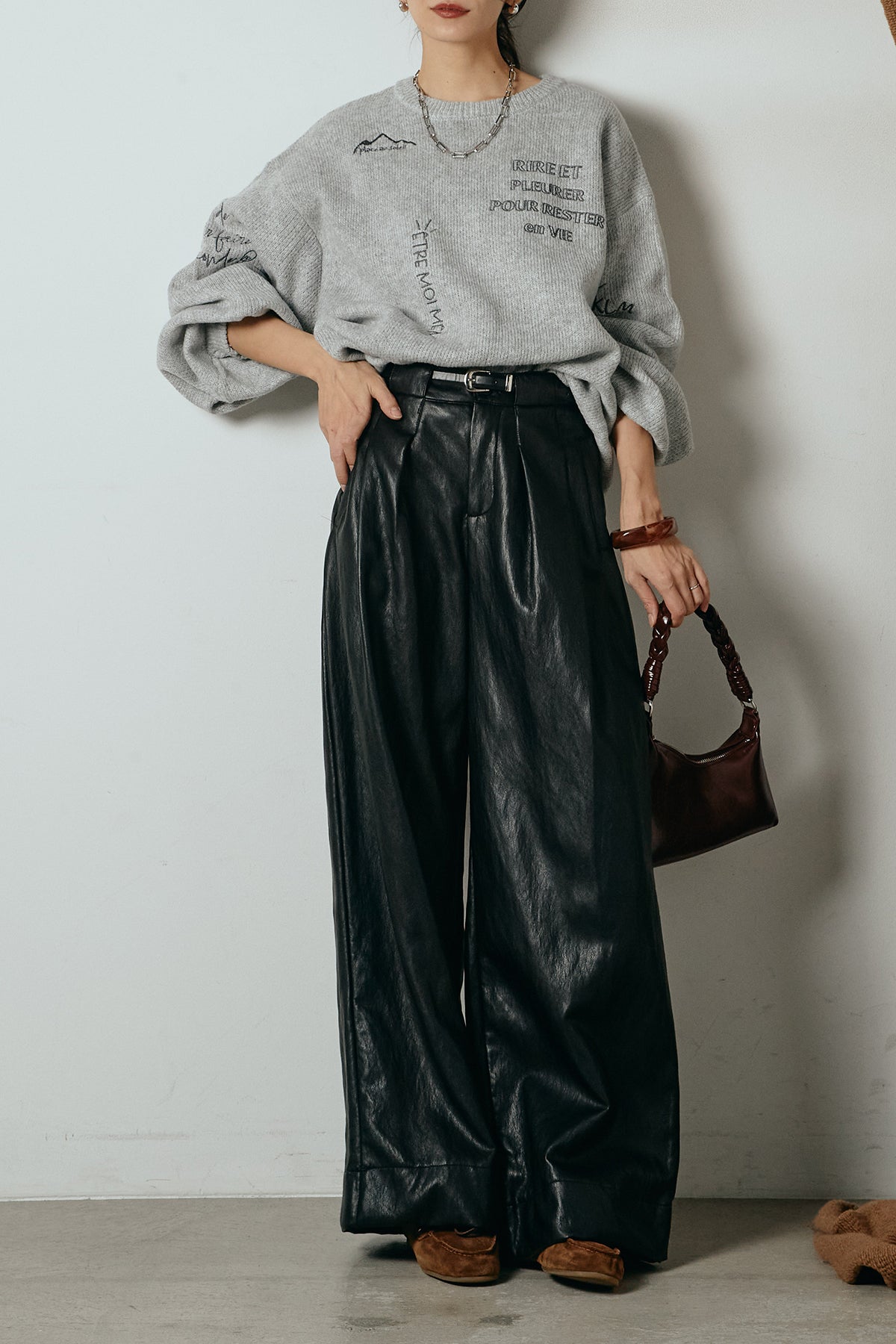 [SET]刺繍ロゴランダムデザインニットトップス+ベルト付きレザーライクタックパンツ(2set)