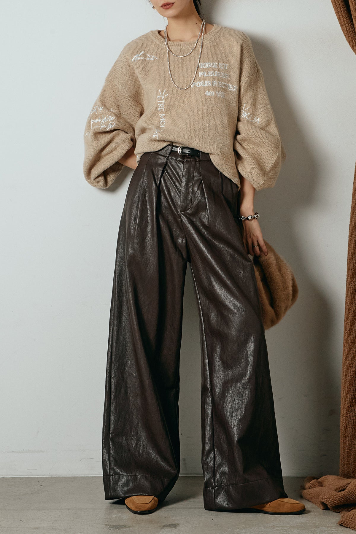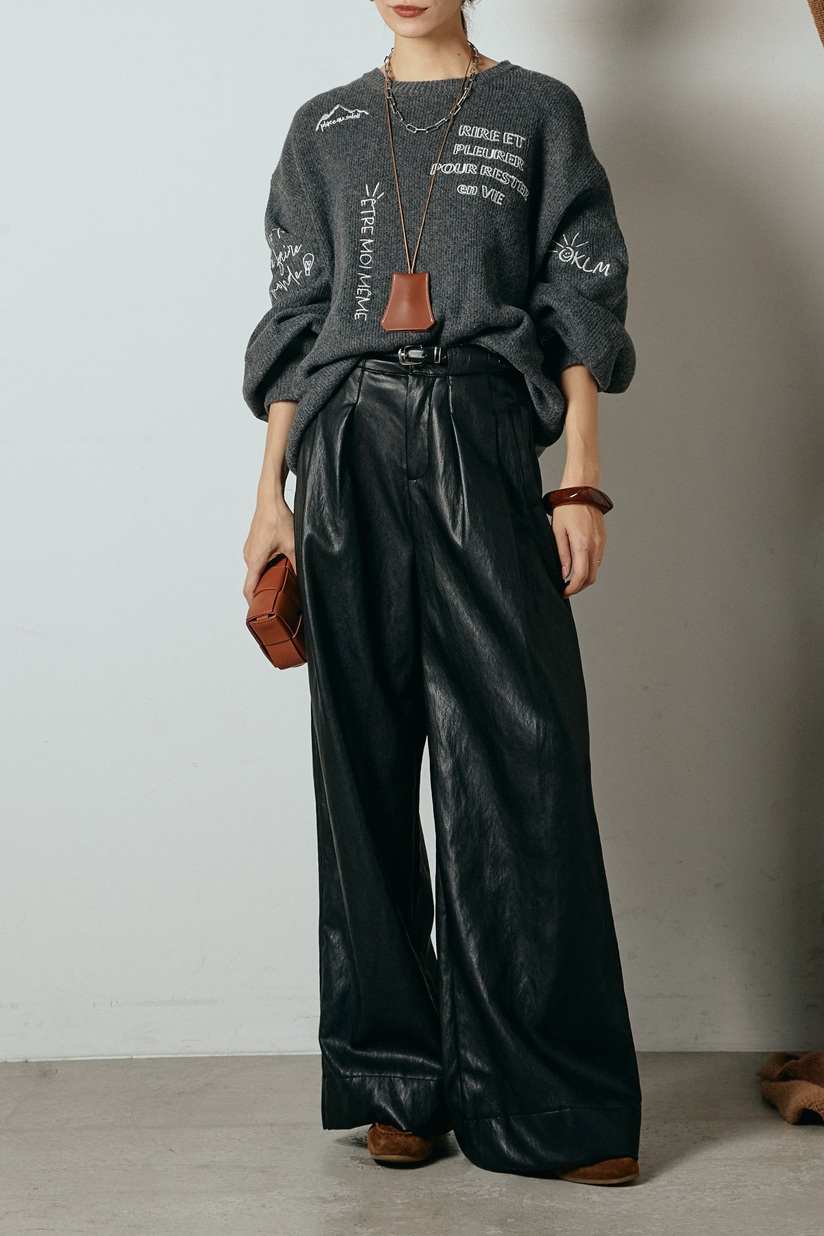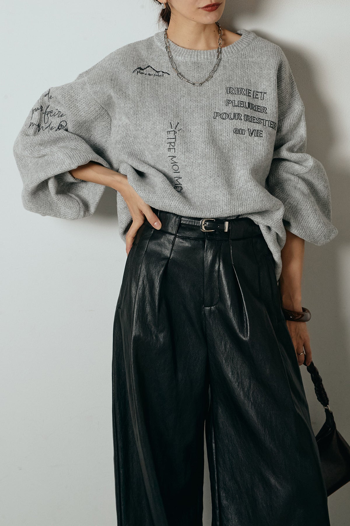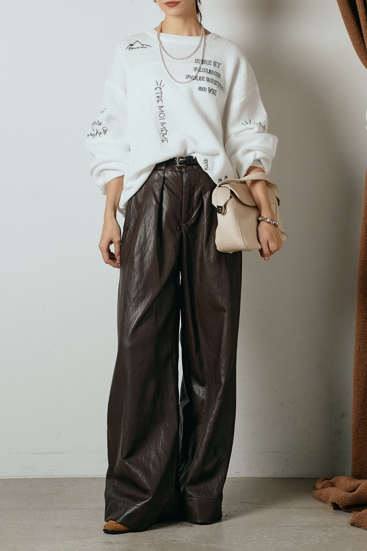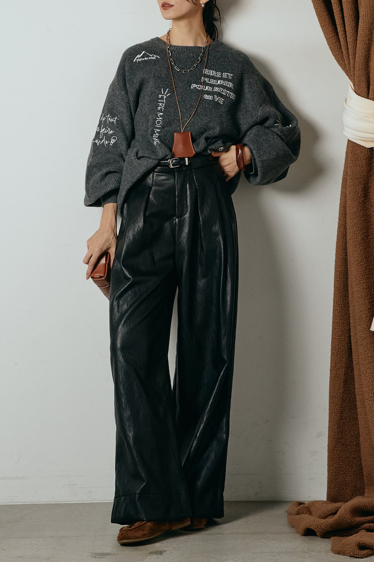 [SET]刺繍ロゴランダムデザインニットトップス+ベルト付きレザーライクタックパンツ(2set)