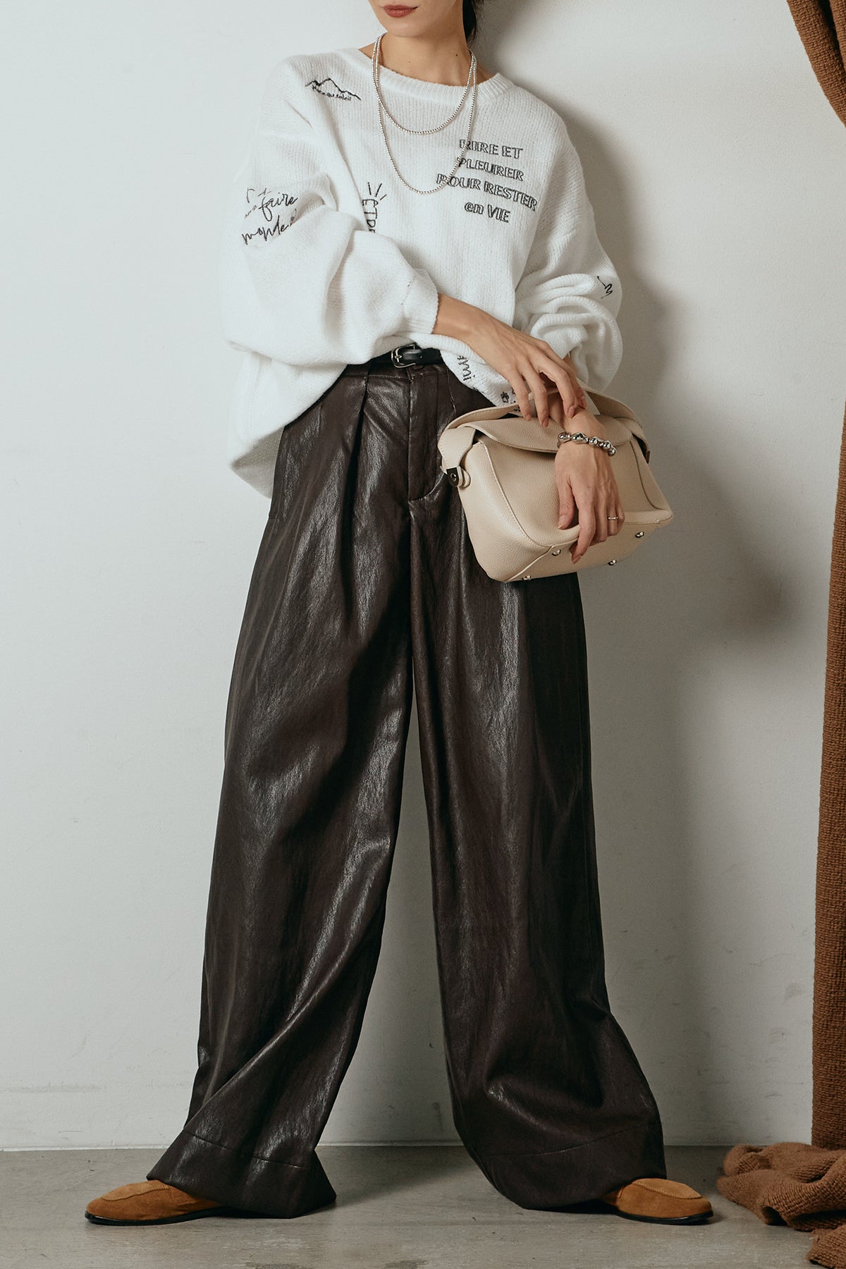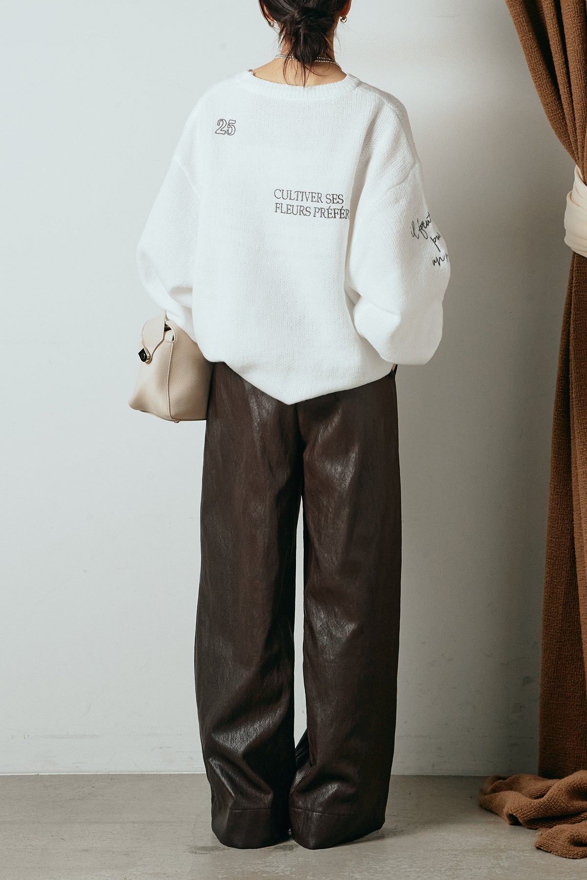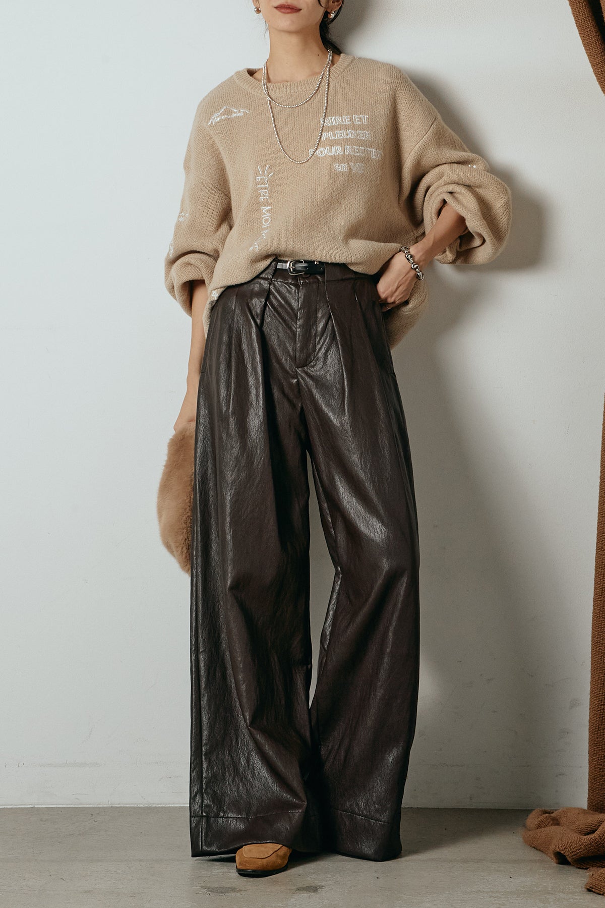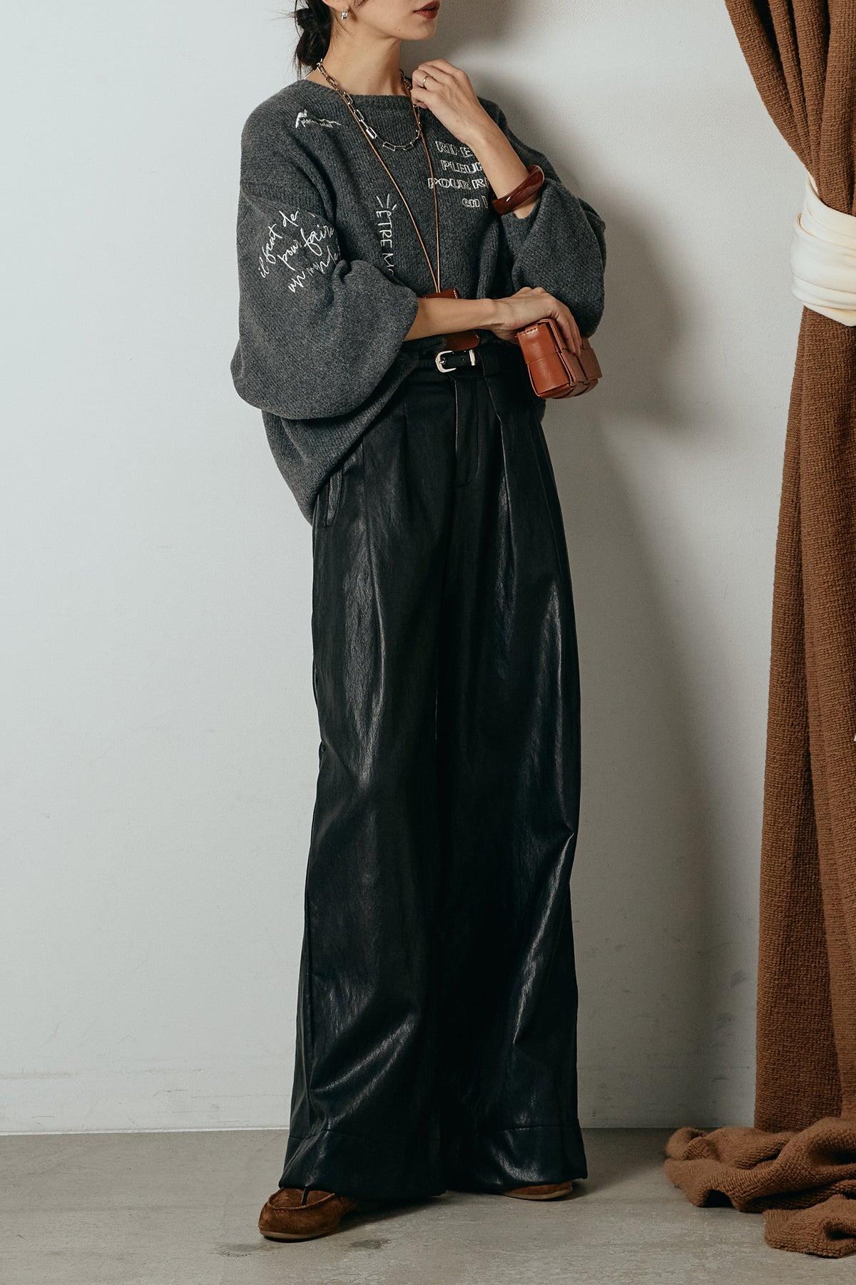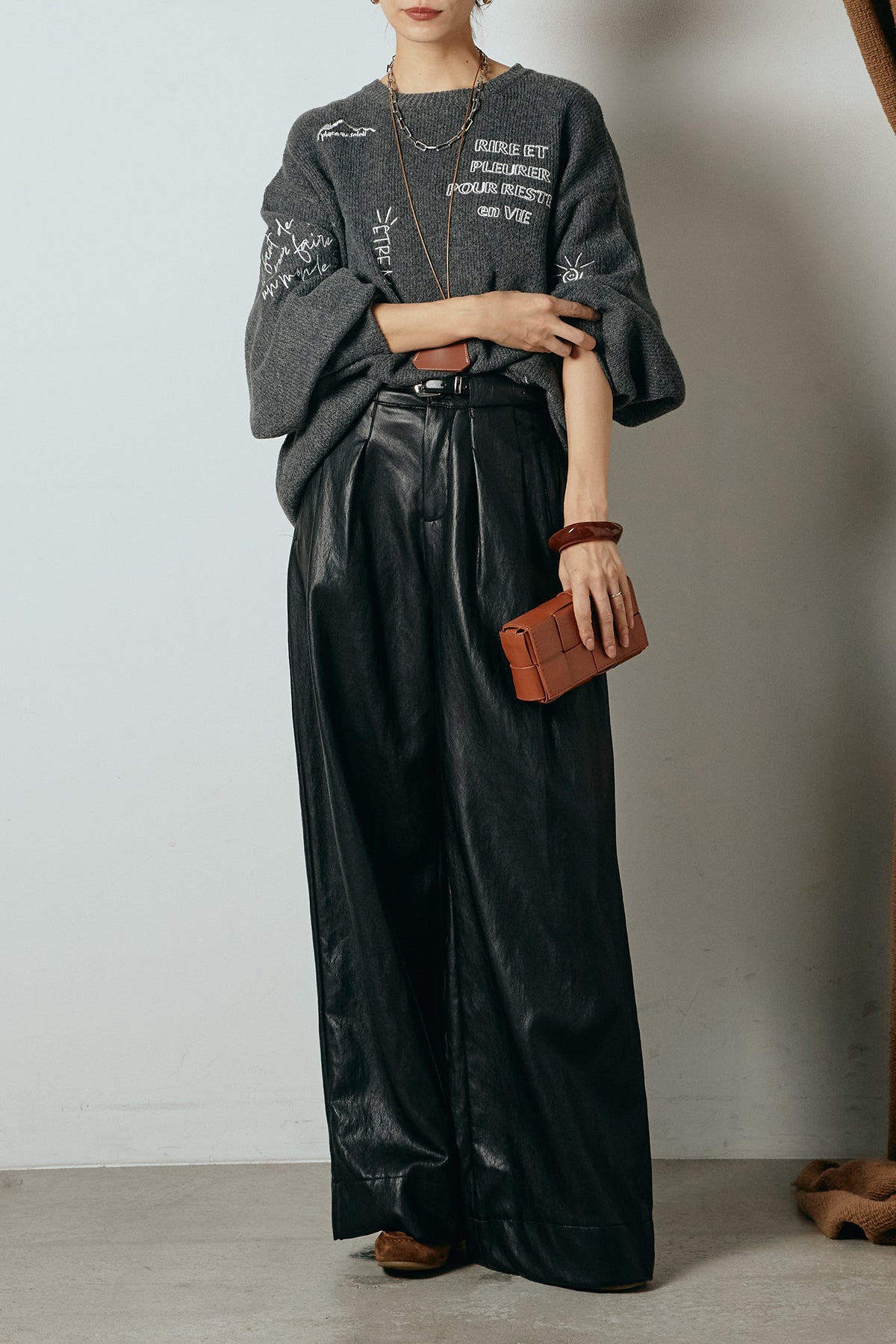 [SET]刺繍ロゴランダムデザインニットトップス+ベルト付きレザーライクタックパンツ(2set)
