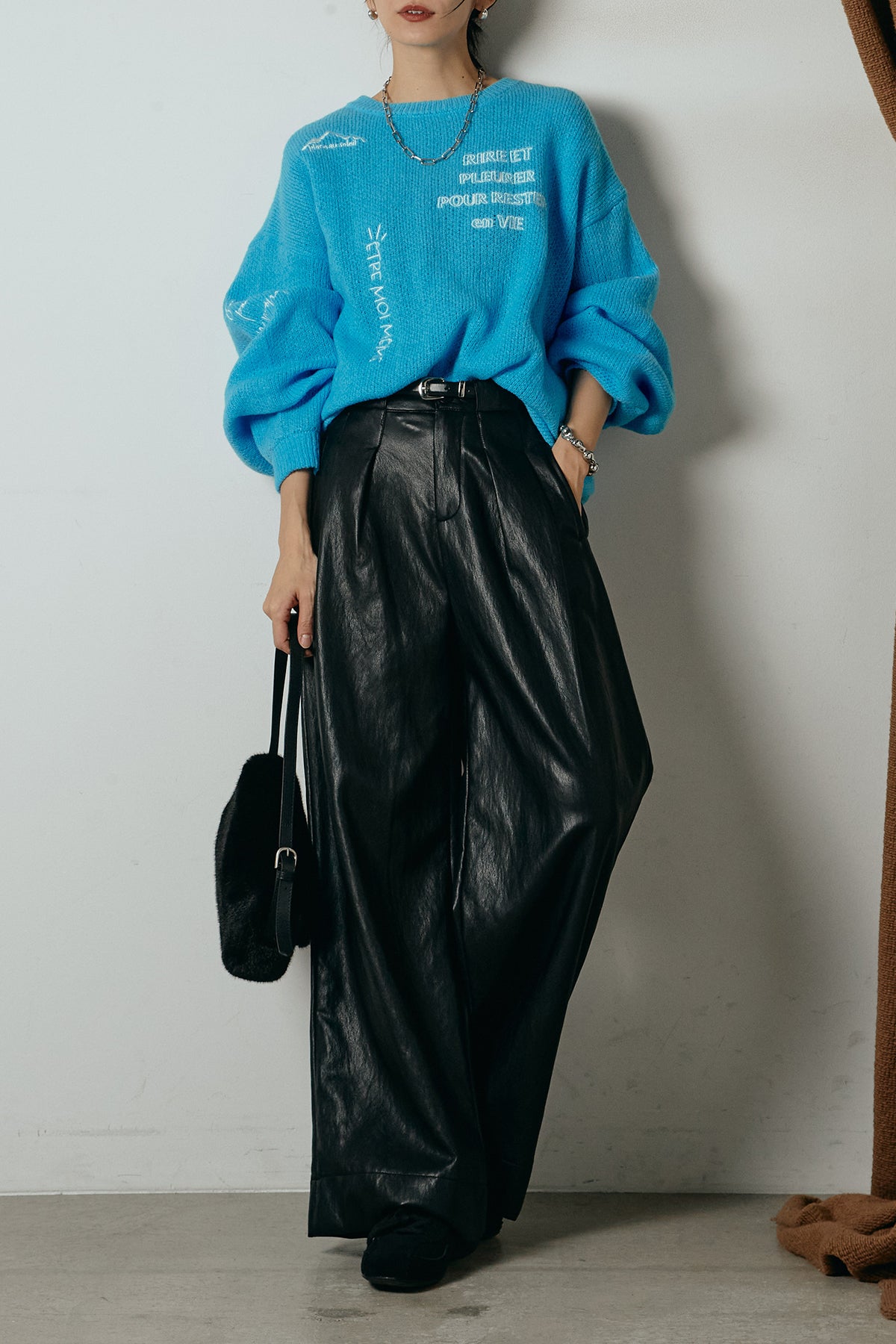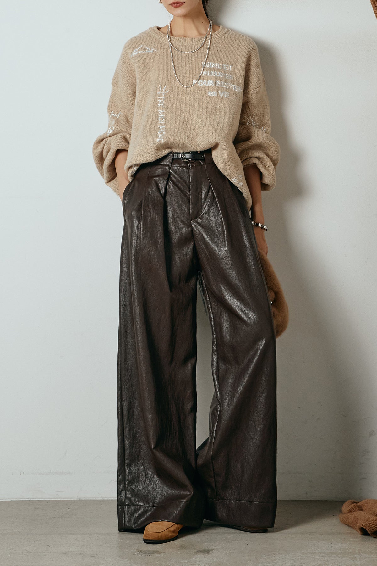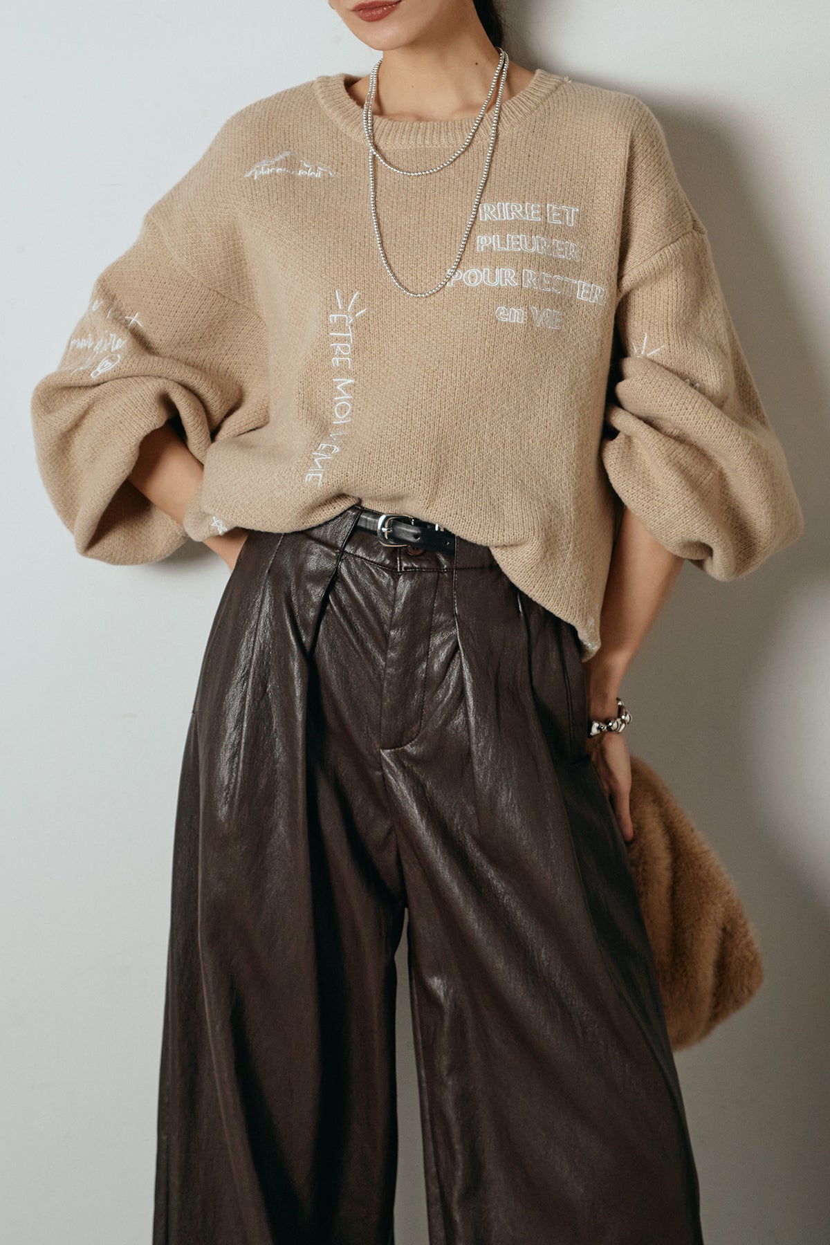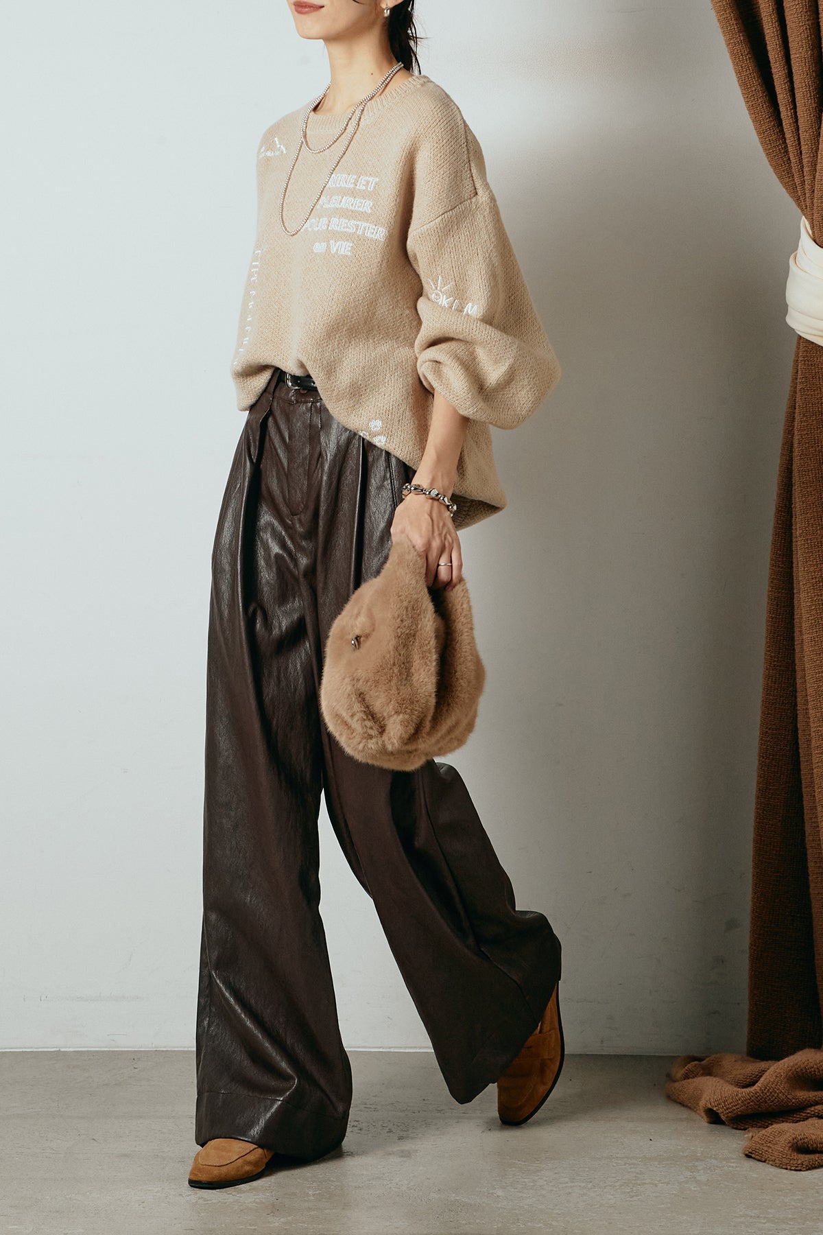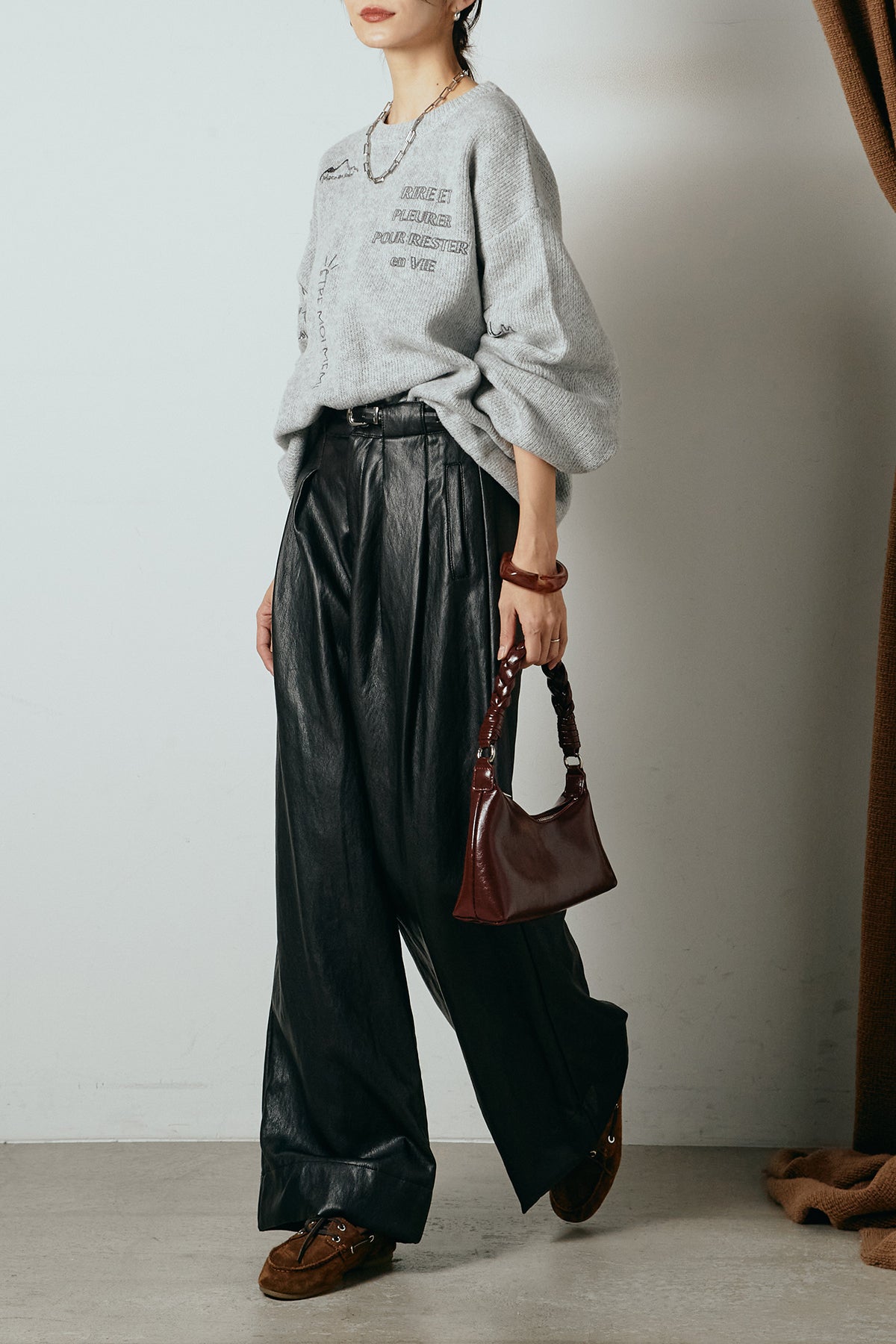 [SET]刺繍ロゴランダムデザインニットトップス+ベルト付きレザーライクタックパンツ(2set)