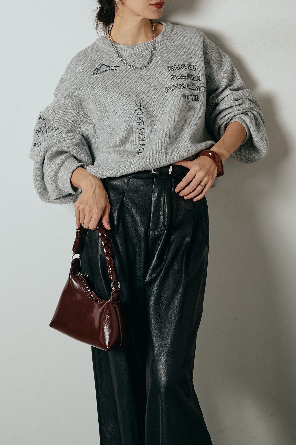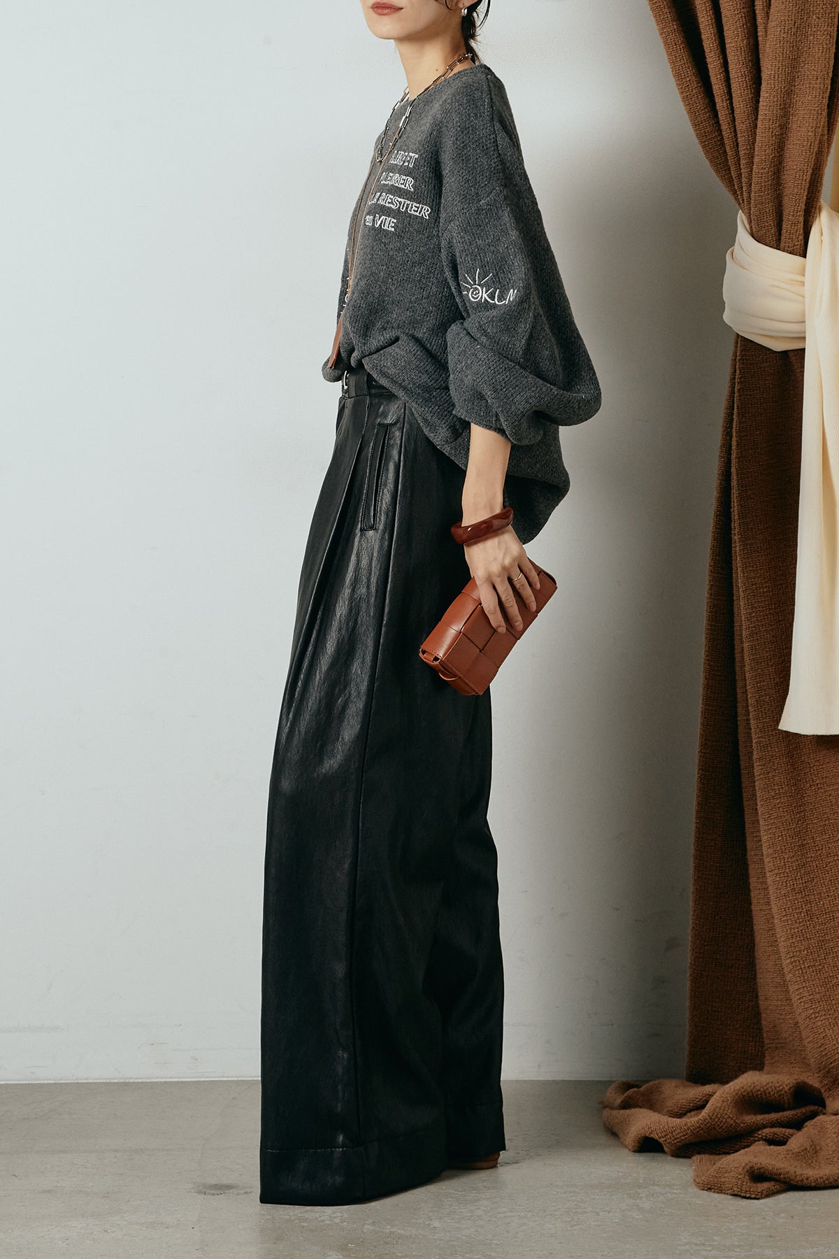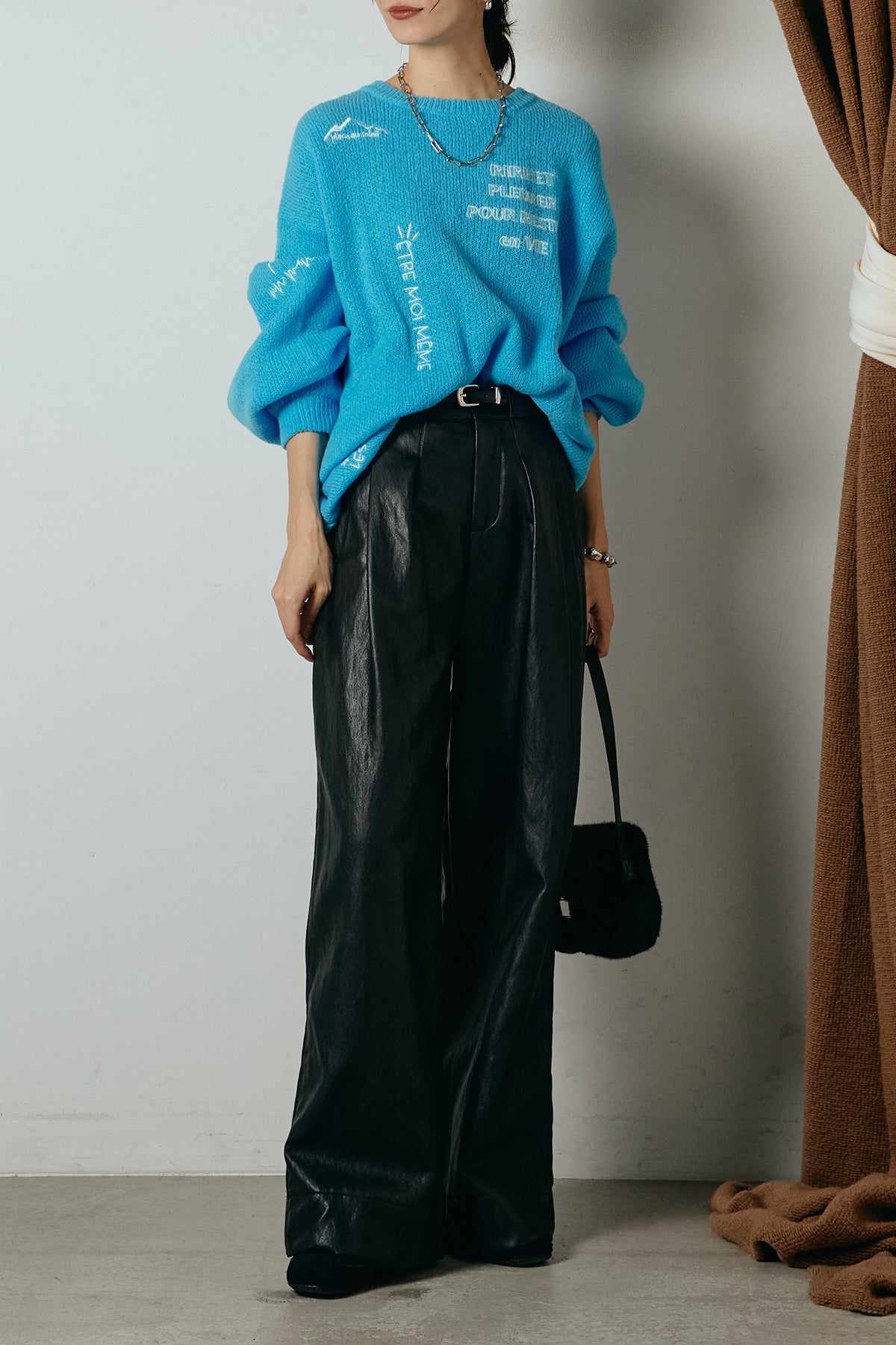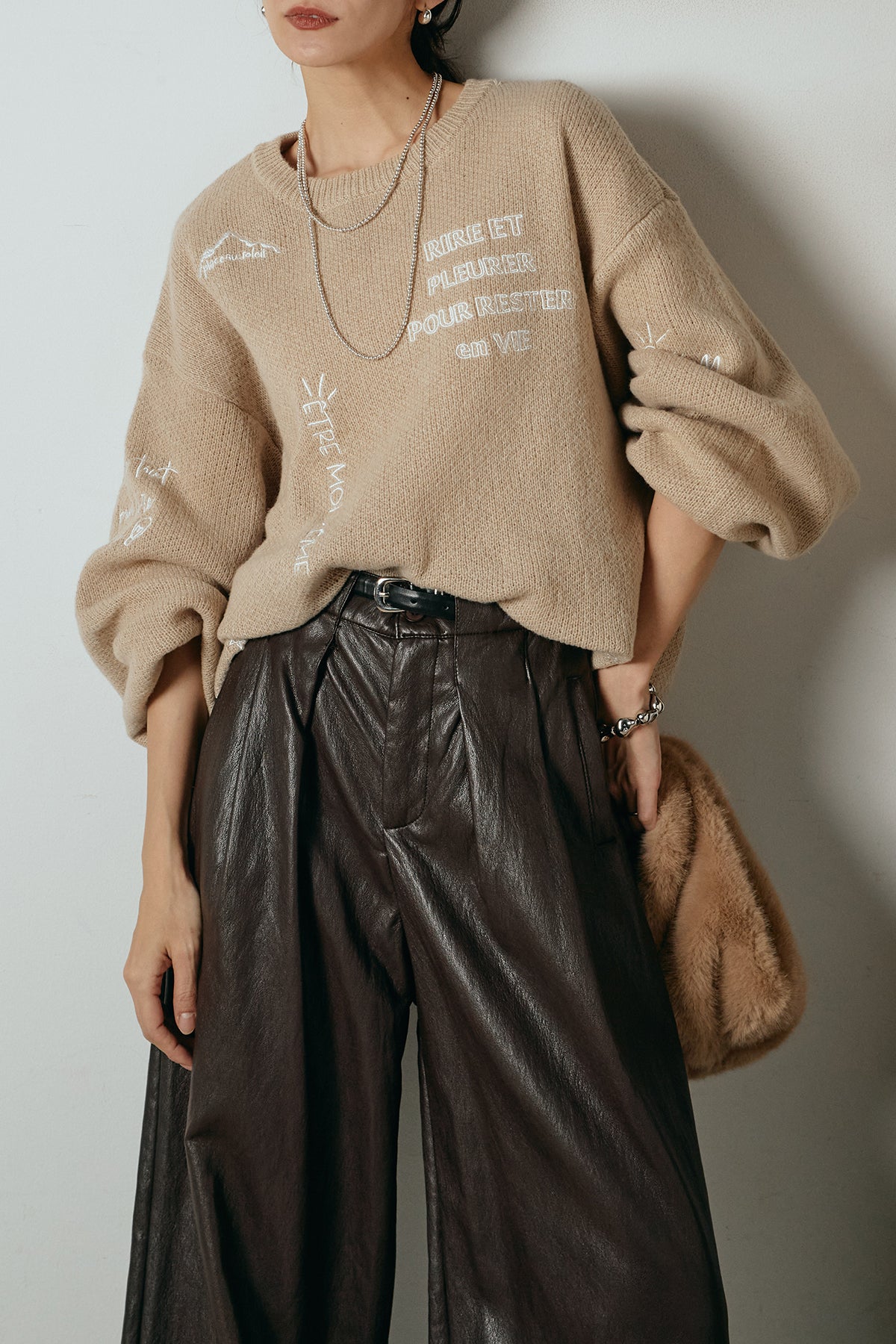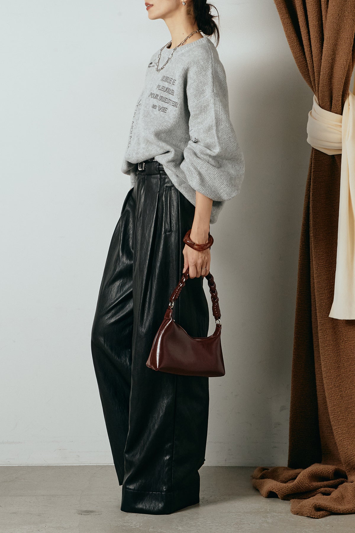 [SET]刺繍ロゴランダムデザインニットトップス+ベルト付きレザーライクタックパンツ(2set)