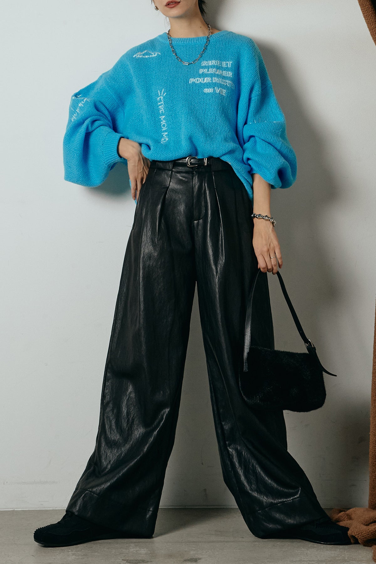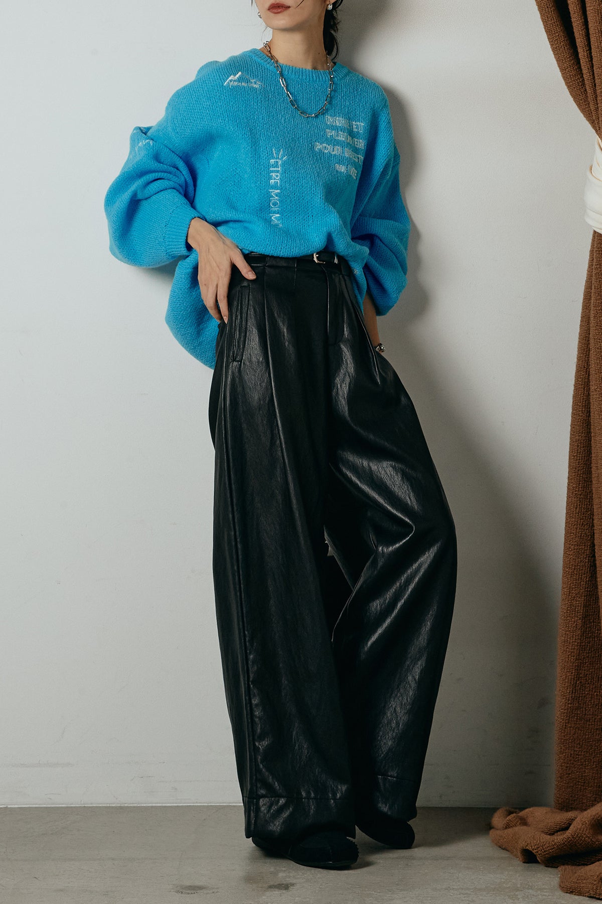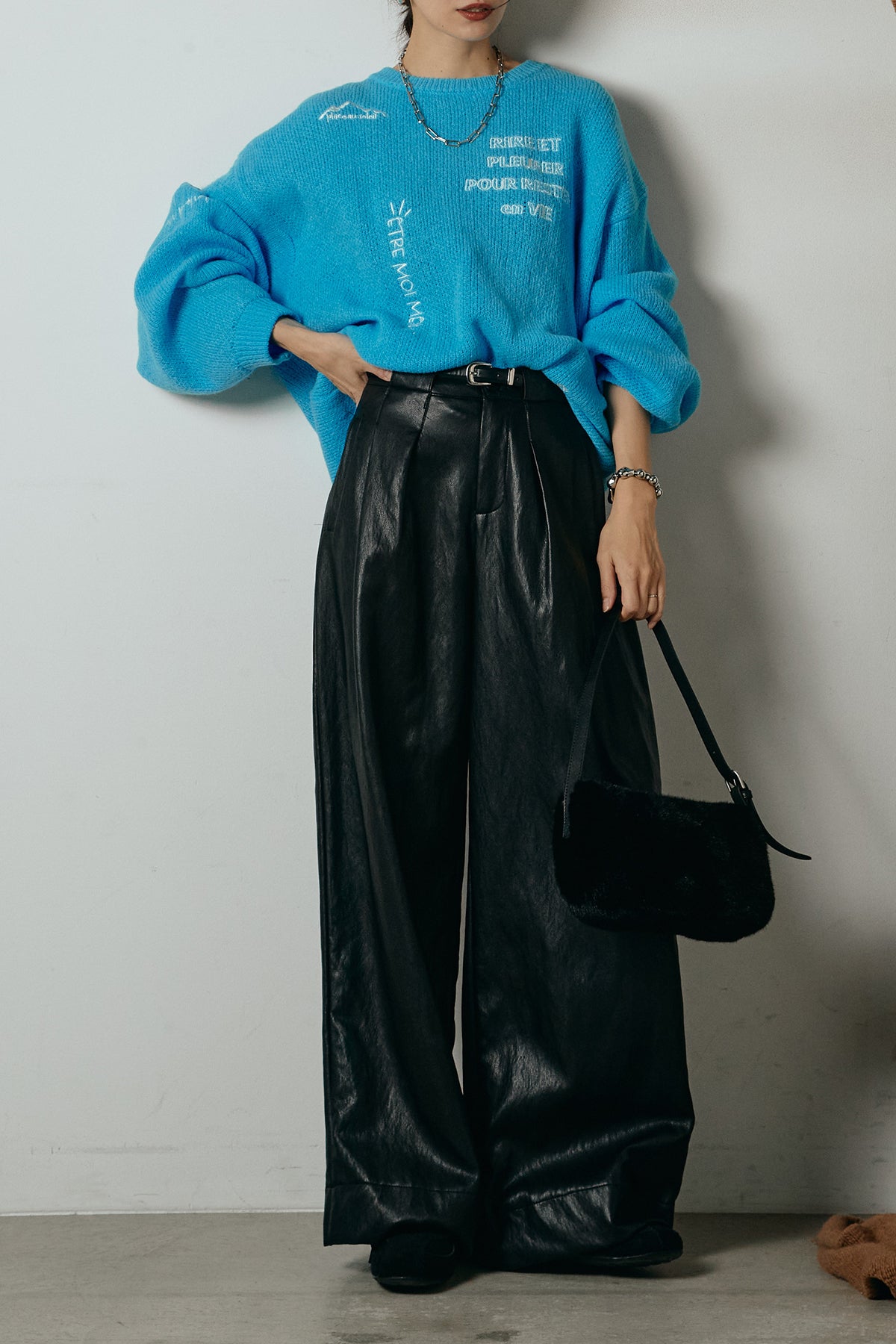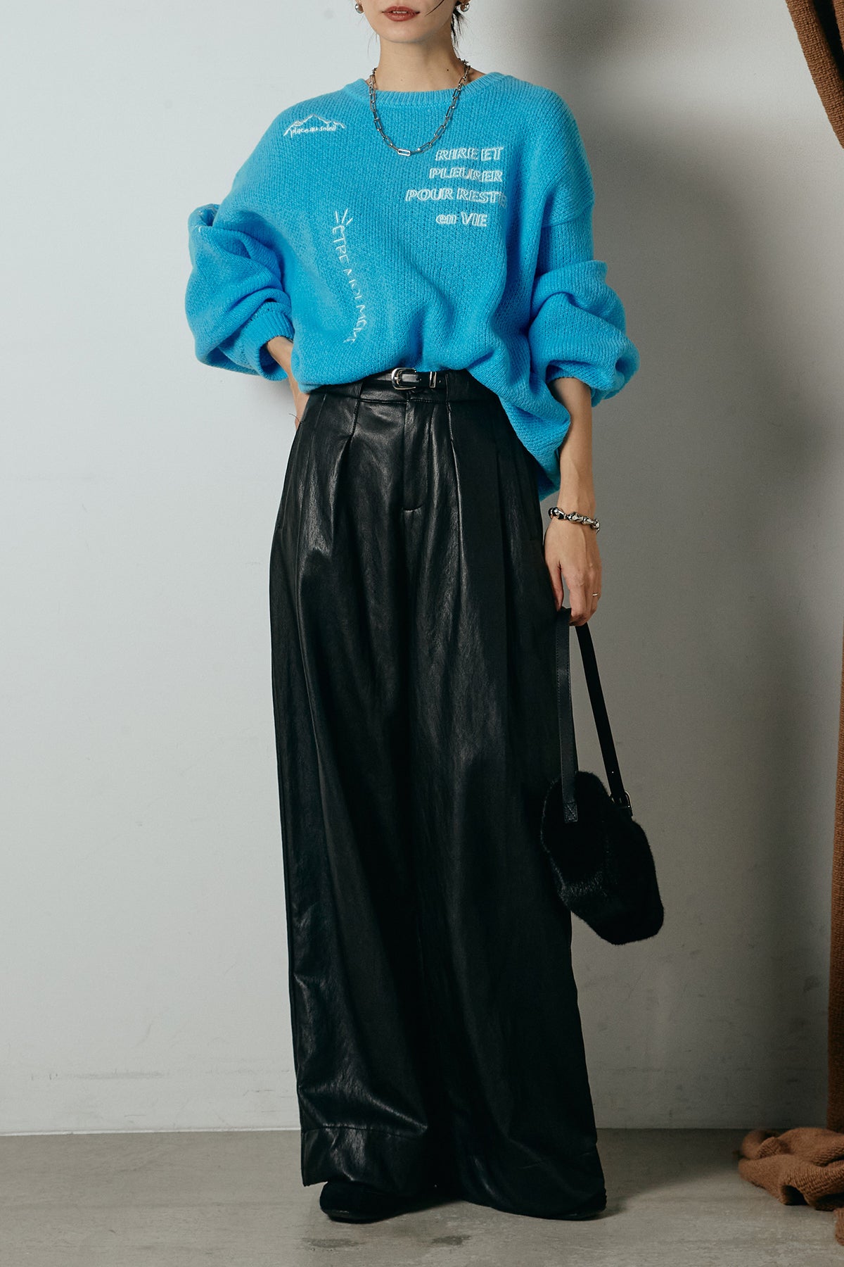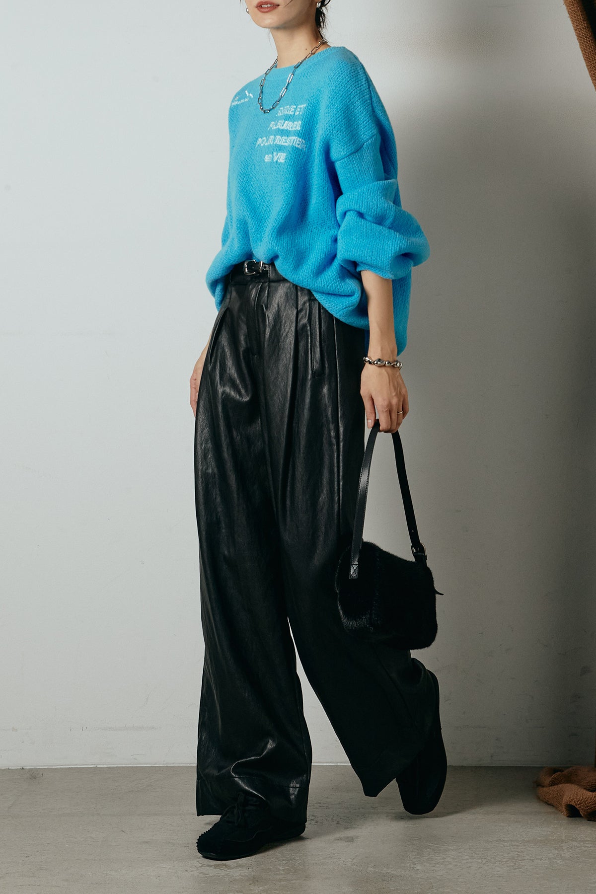 [SET]刺繍ロゴランダムデザインニットトップス+ベルト付きレザーライクタックパンツ(2set)