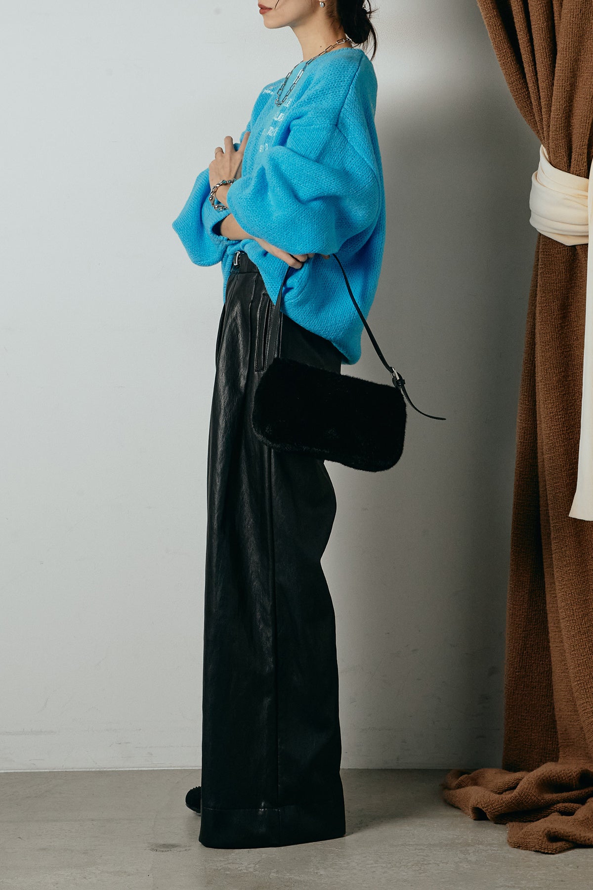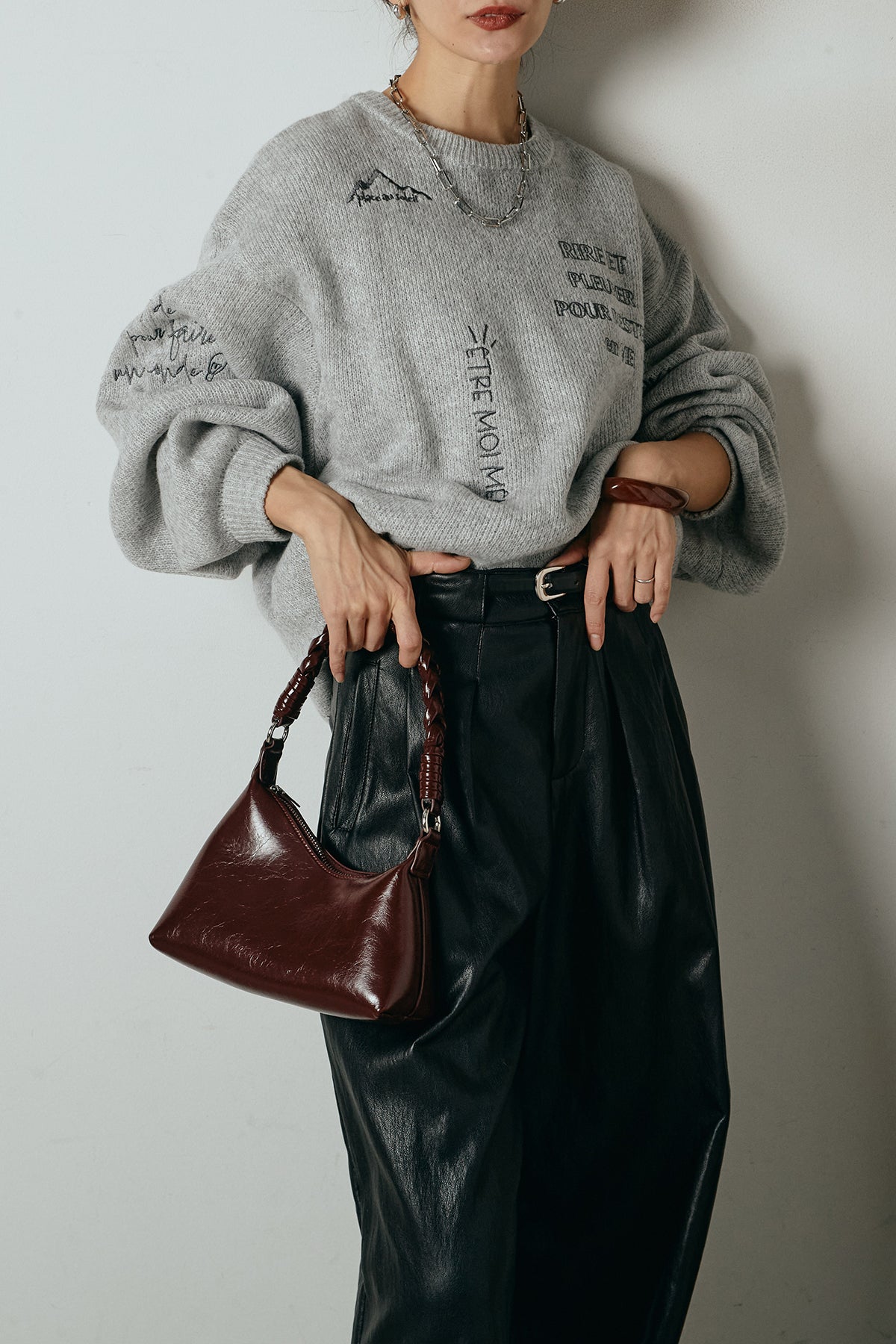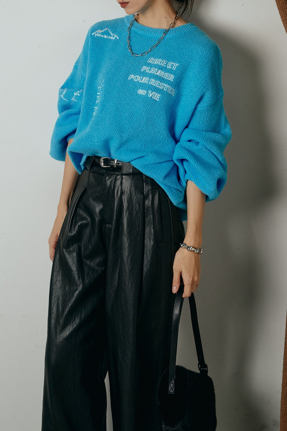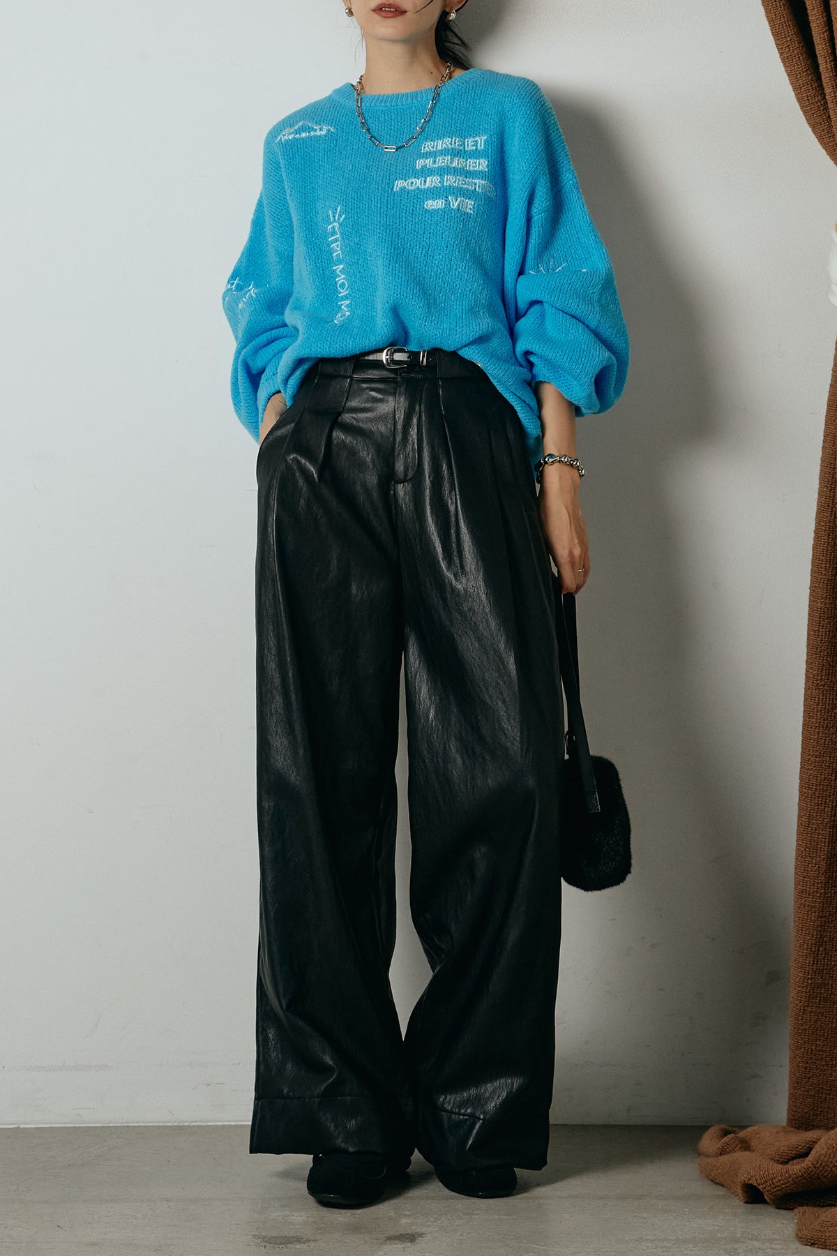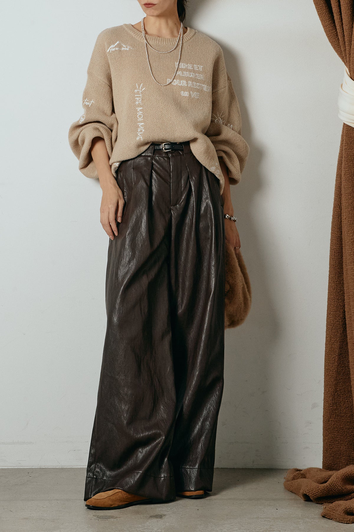 [SET]刺繍ロゴランダムデザインニットトップス+ベルト付きレザーライクタックパンツ(2set)