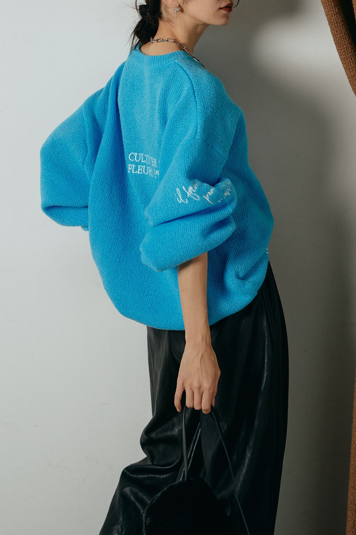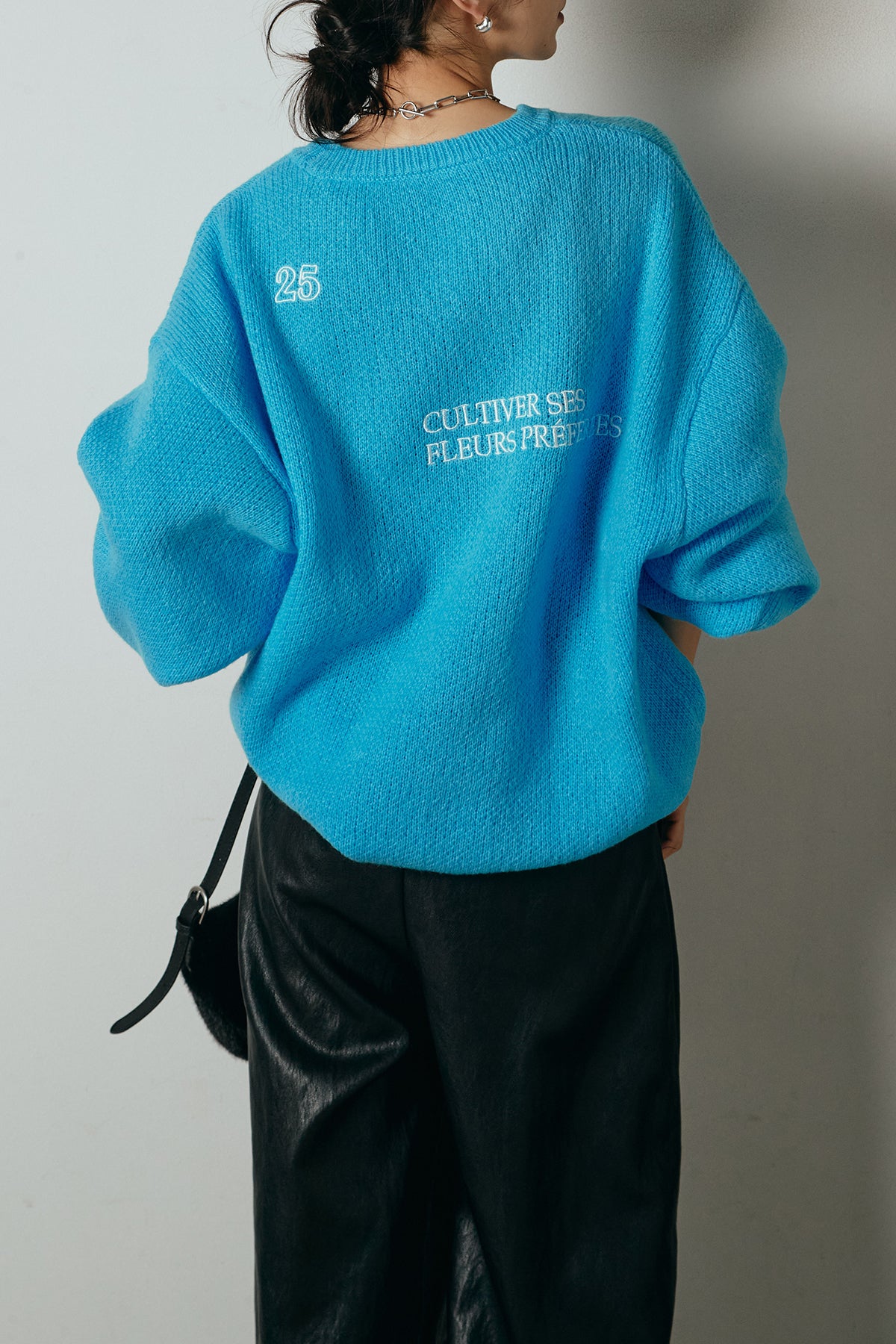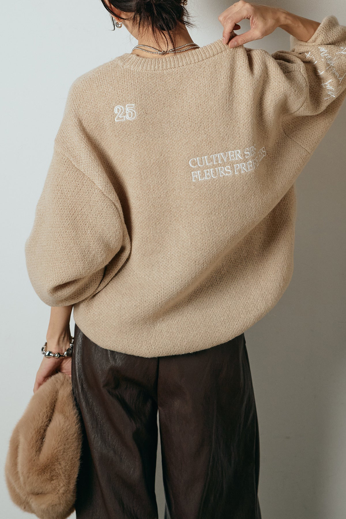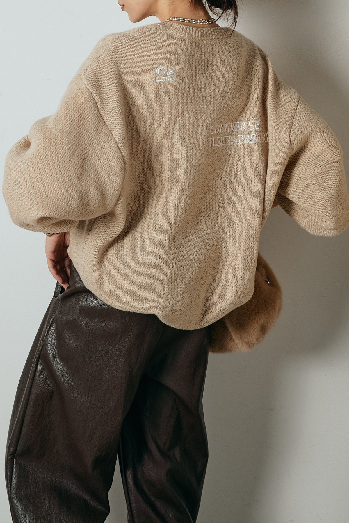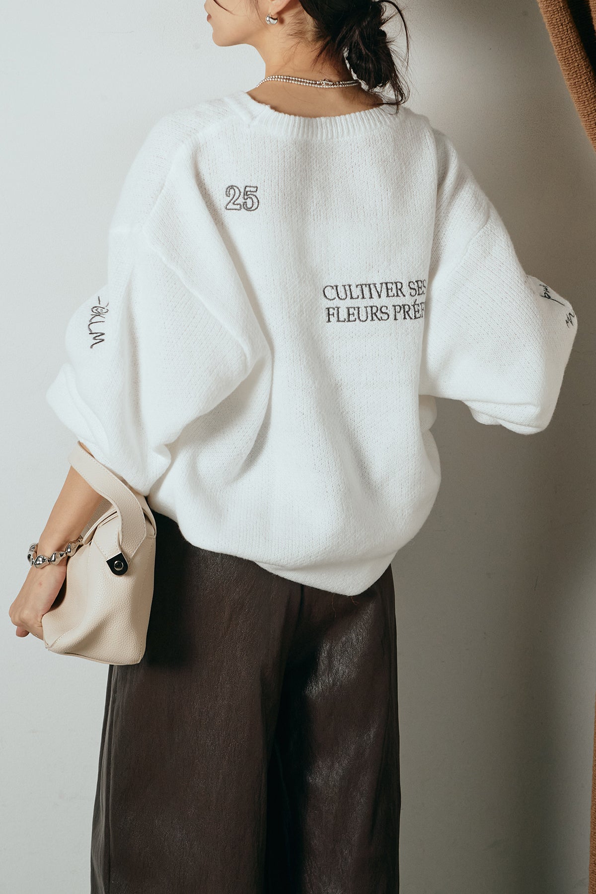 ランダムに配置した刺繍ロゴが目を引く、デザイン性の高いニットトップス。シンプルなシルエットに遊び心のあるディテールを加え、着るだけでスタイリングの主役になる一枚です。程よくゆとりのあるフォルムでリラックス感がありながら、コーディネートに自然なアクセントをプラス。パンツにもスカートにも合わせやすく、デイリーに活躍するアイテムです。