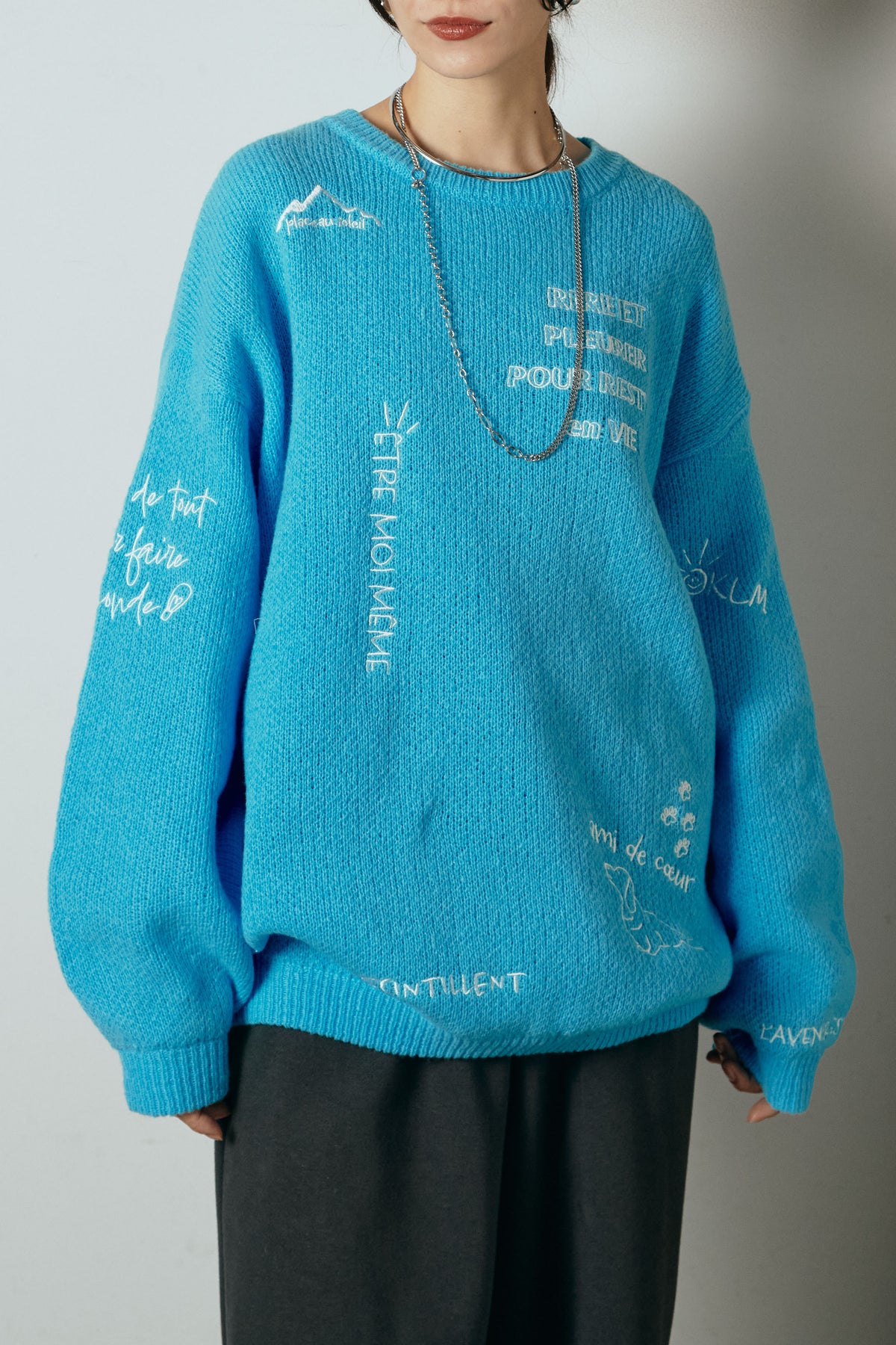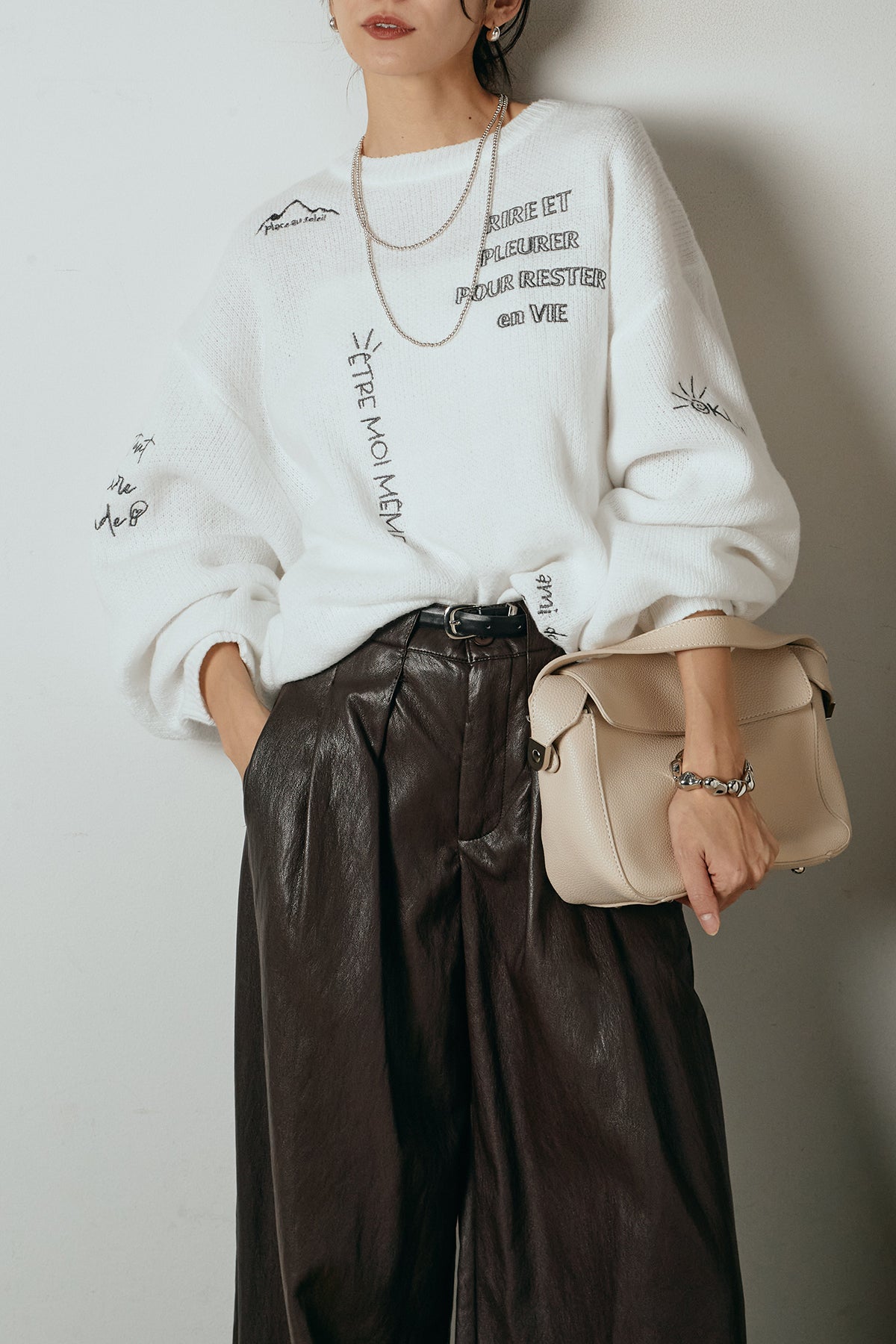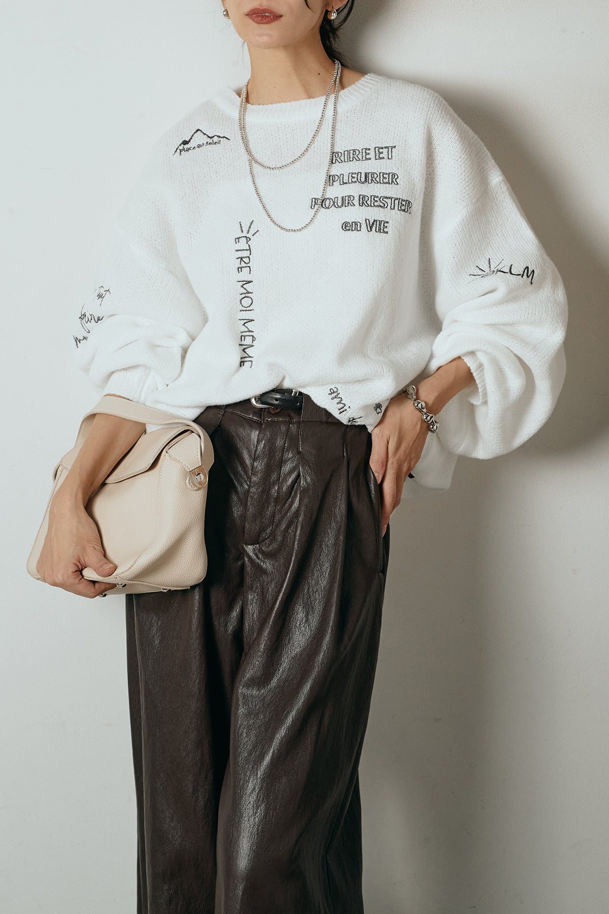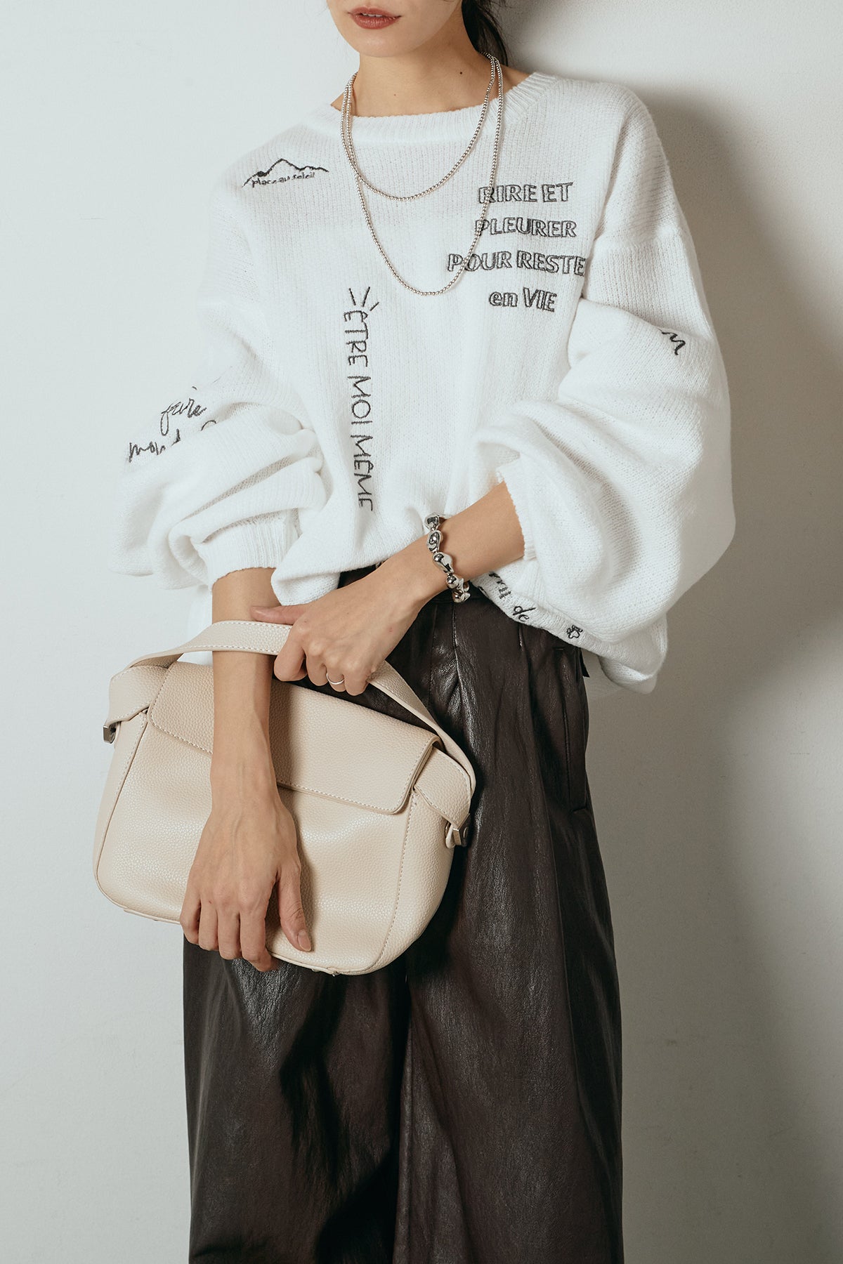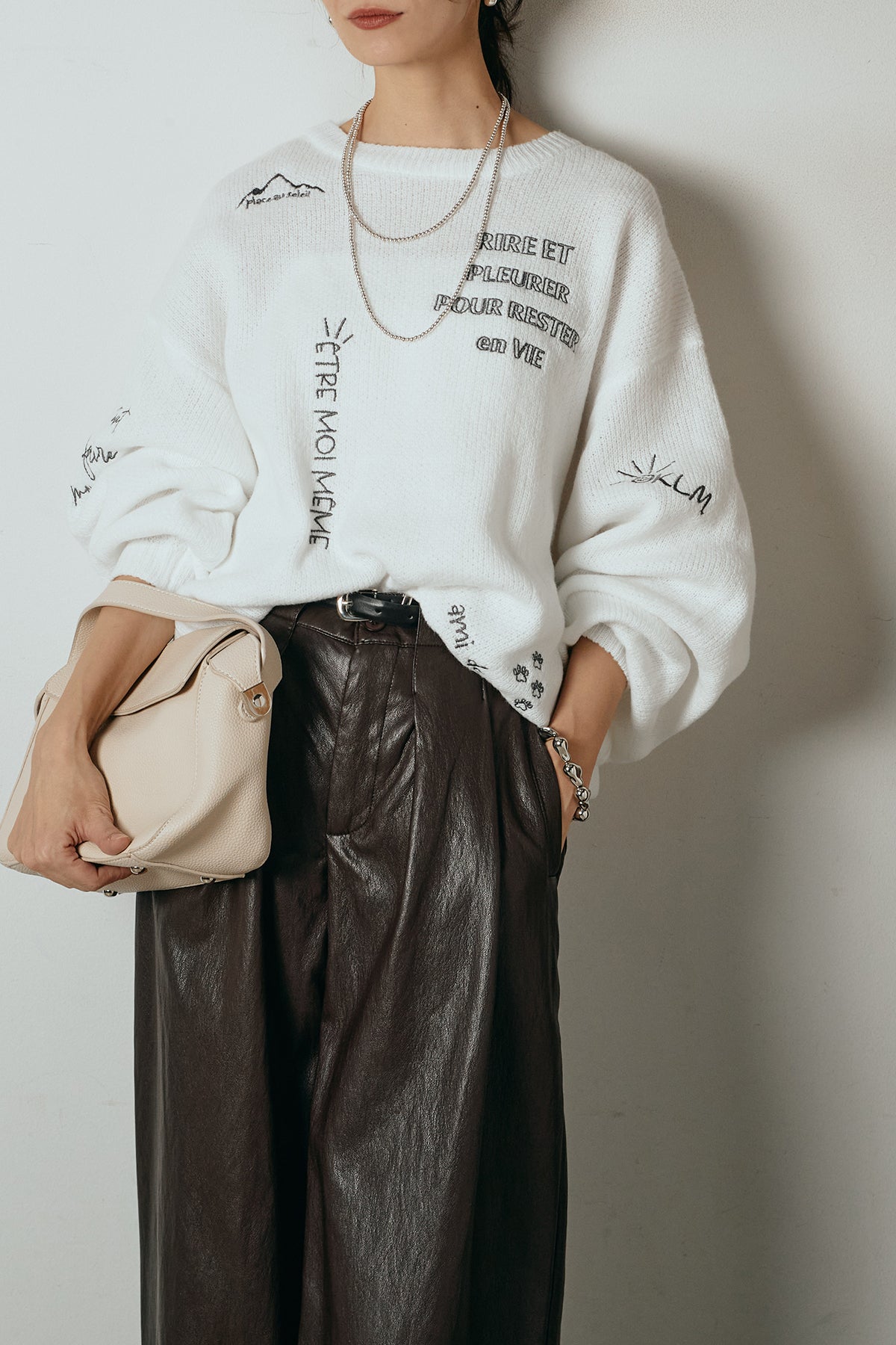 ランダムに配置した刺繍ロゴが目を引く、デザイン性の高いニットトップス。シンプルなシルエットに遊び心のあるディテールを加え、着るだけでスタイリングの主役になる一枚です。程よくゆとりのあるフォルムでリラックス感がありながら、コーディネートに自然なアクセントをプラス。パンツにもスカートにも合わせやすく、デイリーに活躍するアイテムです。