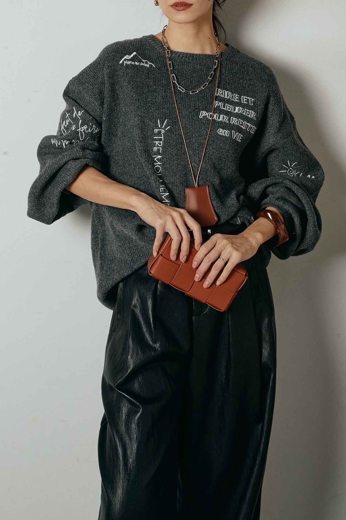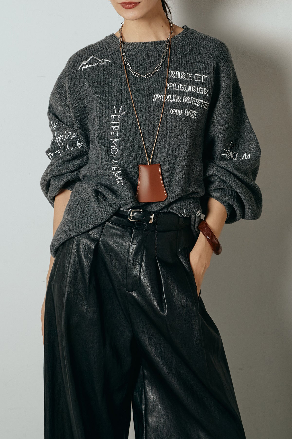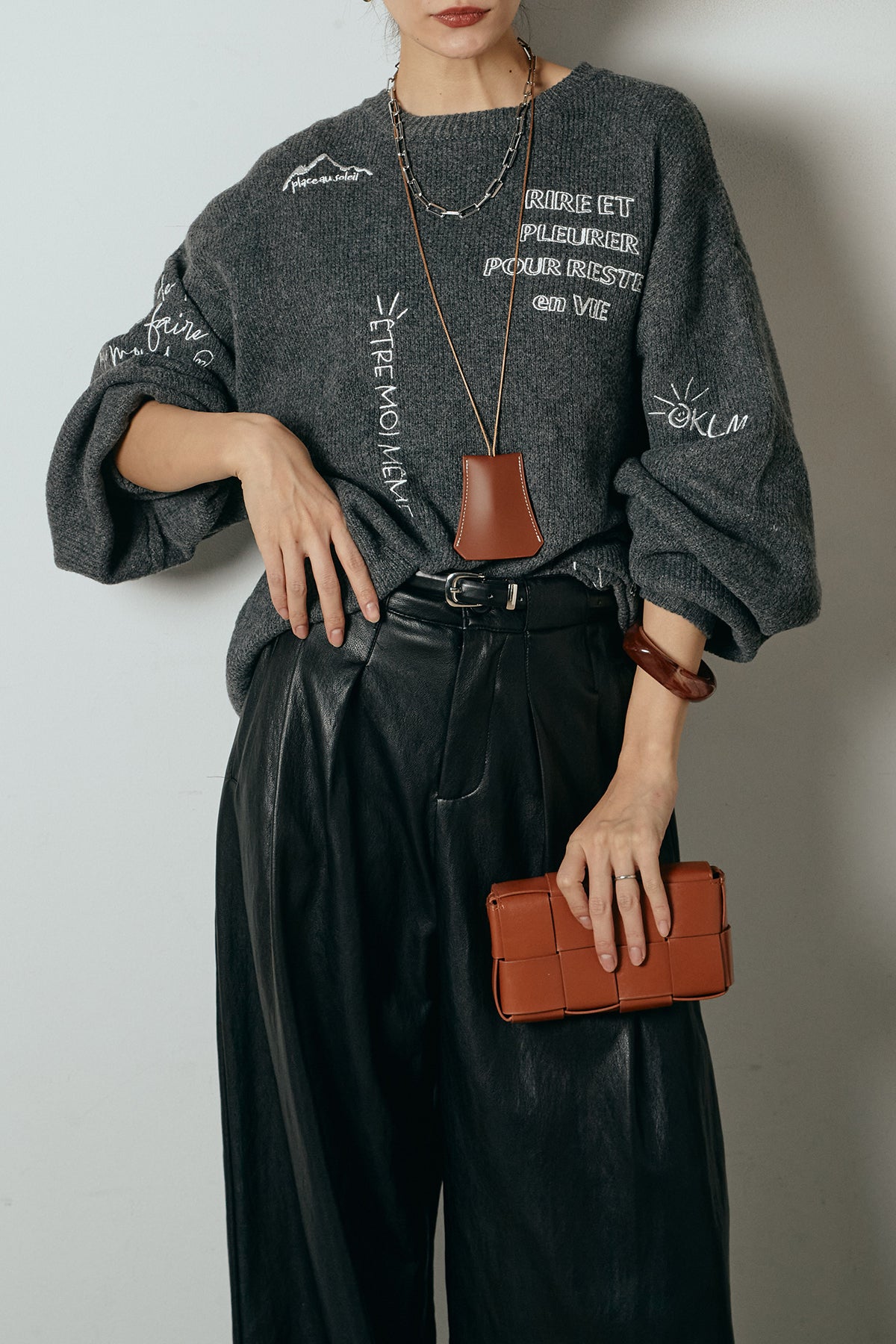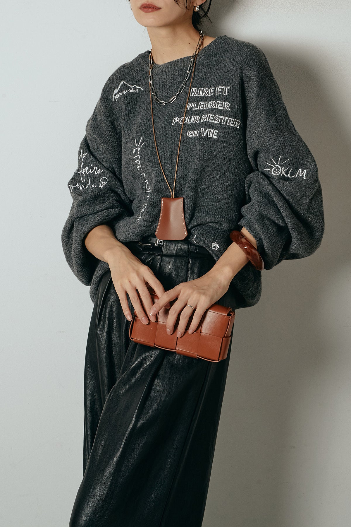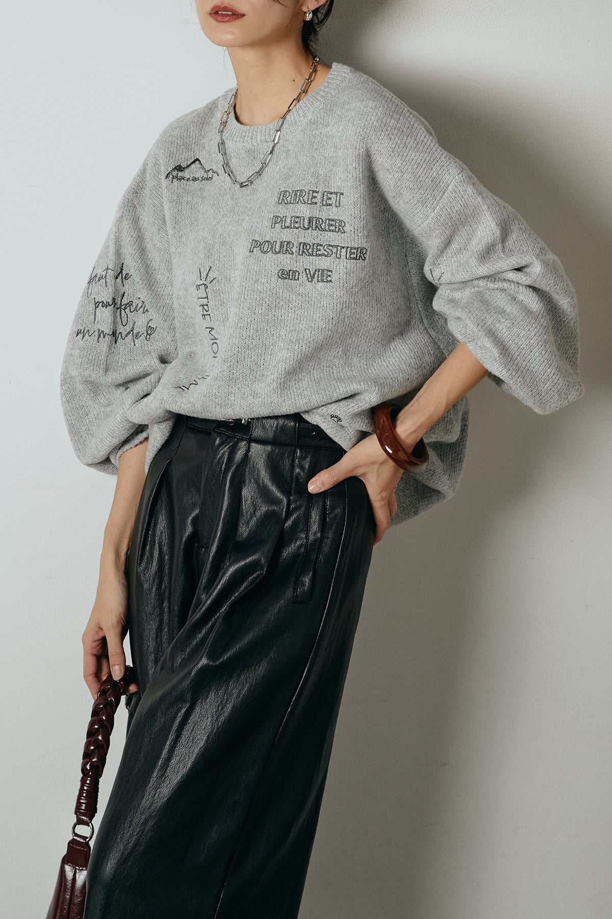 ランダムに配置した刺繍ロゴが目を引く、デザイン性の高いニットトップス。シンプルなシルエットに遊び心のあるディテールを加え、着るだけでスタイリングの主役になる一枚です。程よくゆとりのあるフォルムでリラックス感がありながら、コーディネートに自然なアクセントをプラス。パンツにもスカートにも合わせやすく、デイリーに活躍するアイテムです。