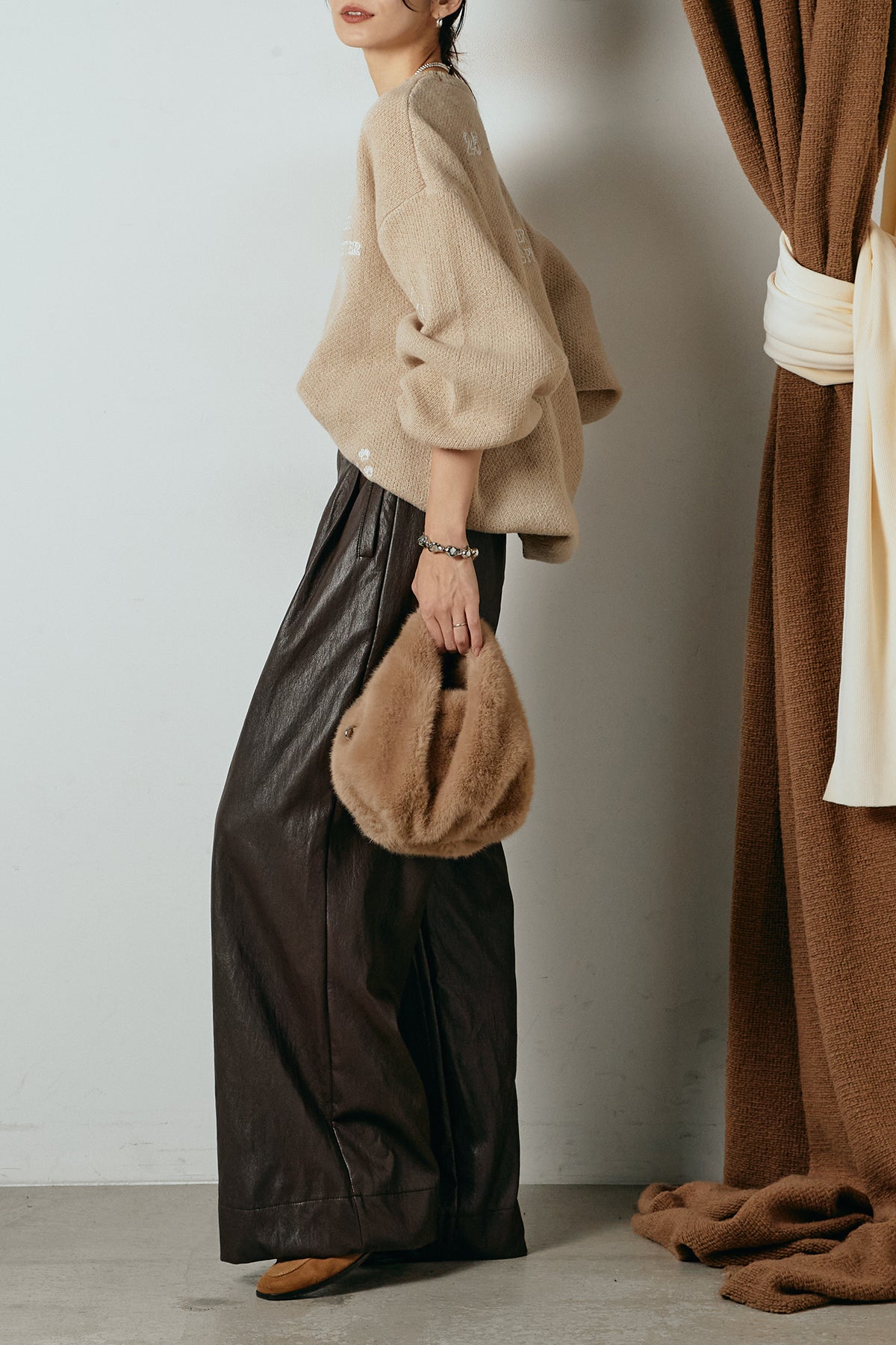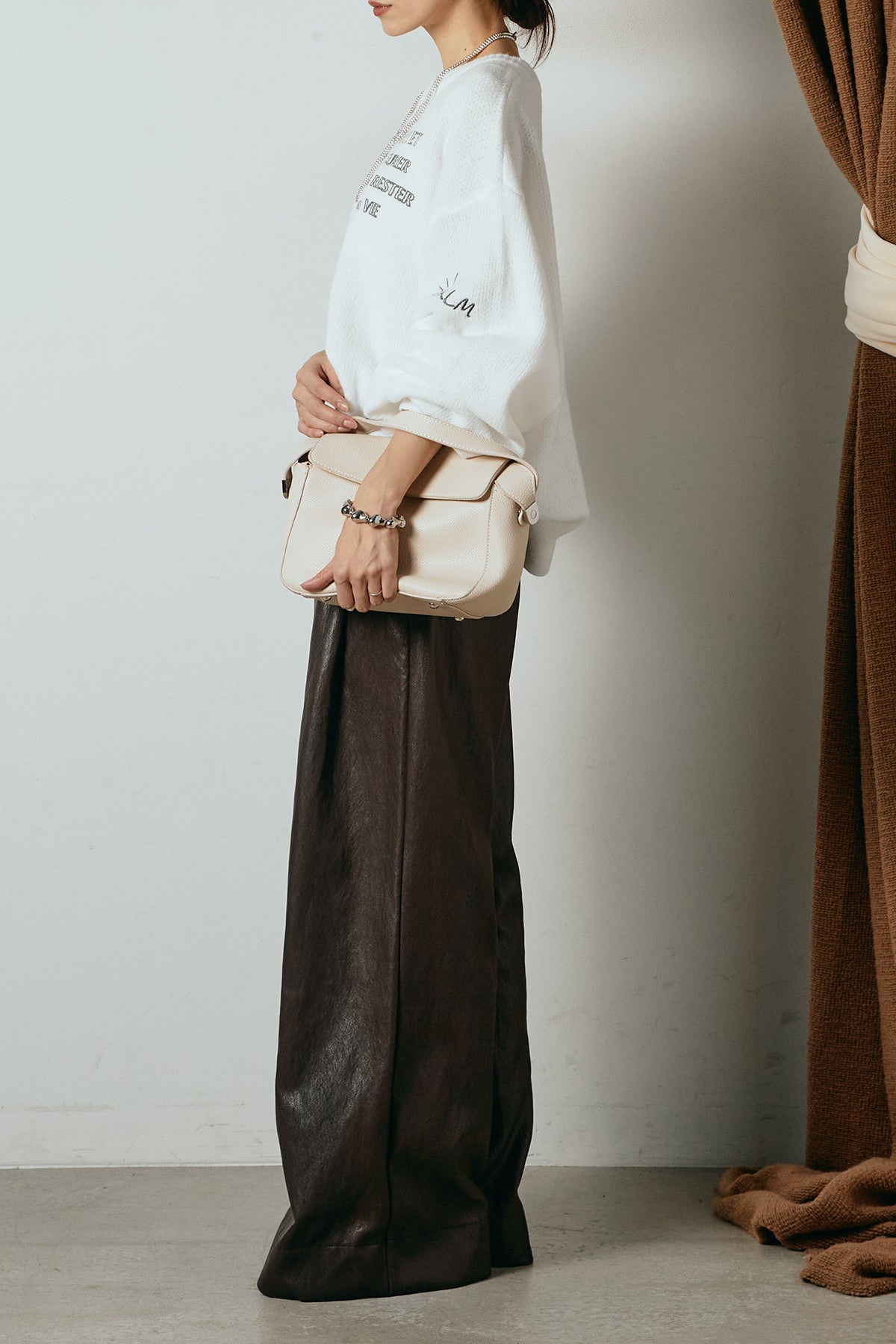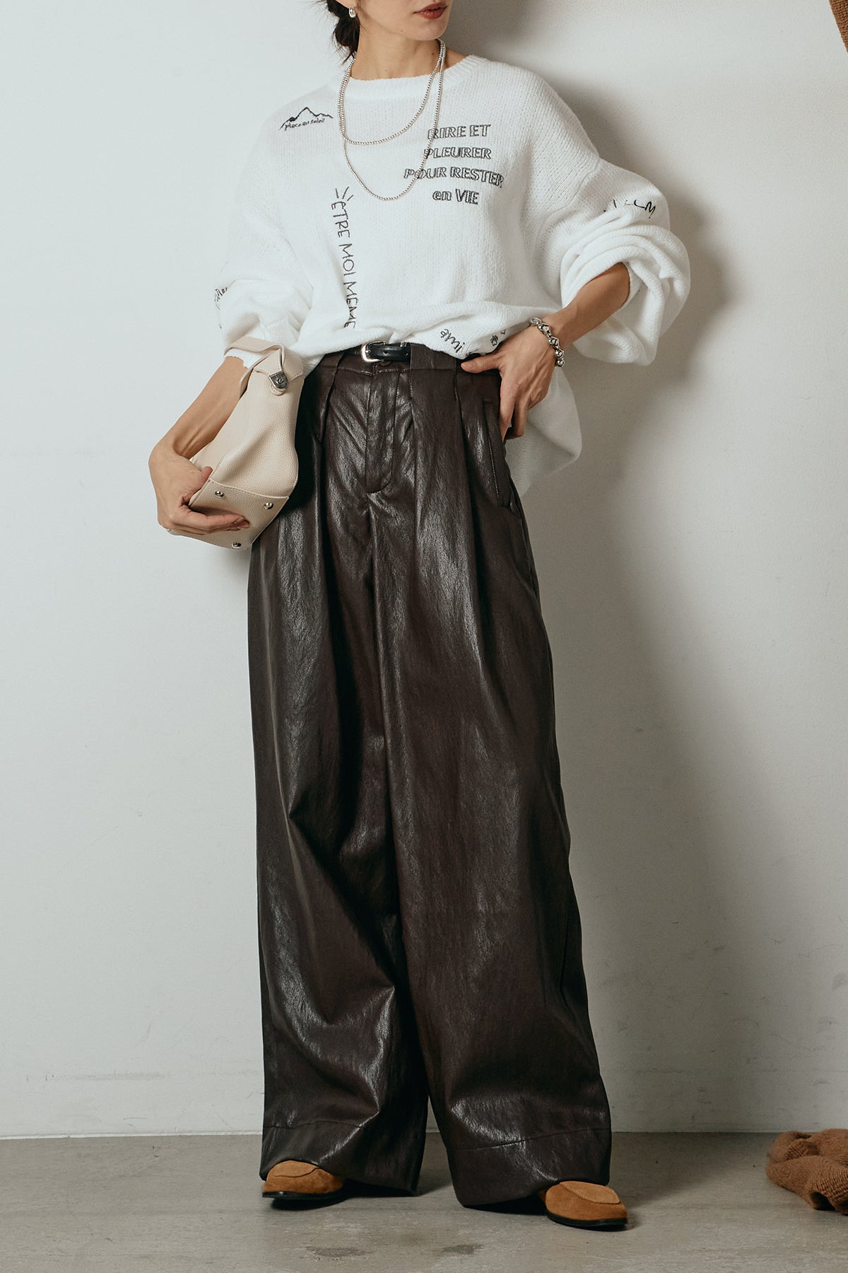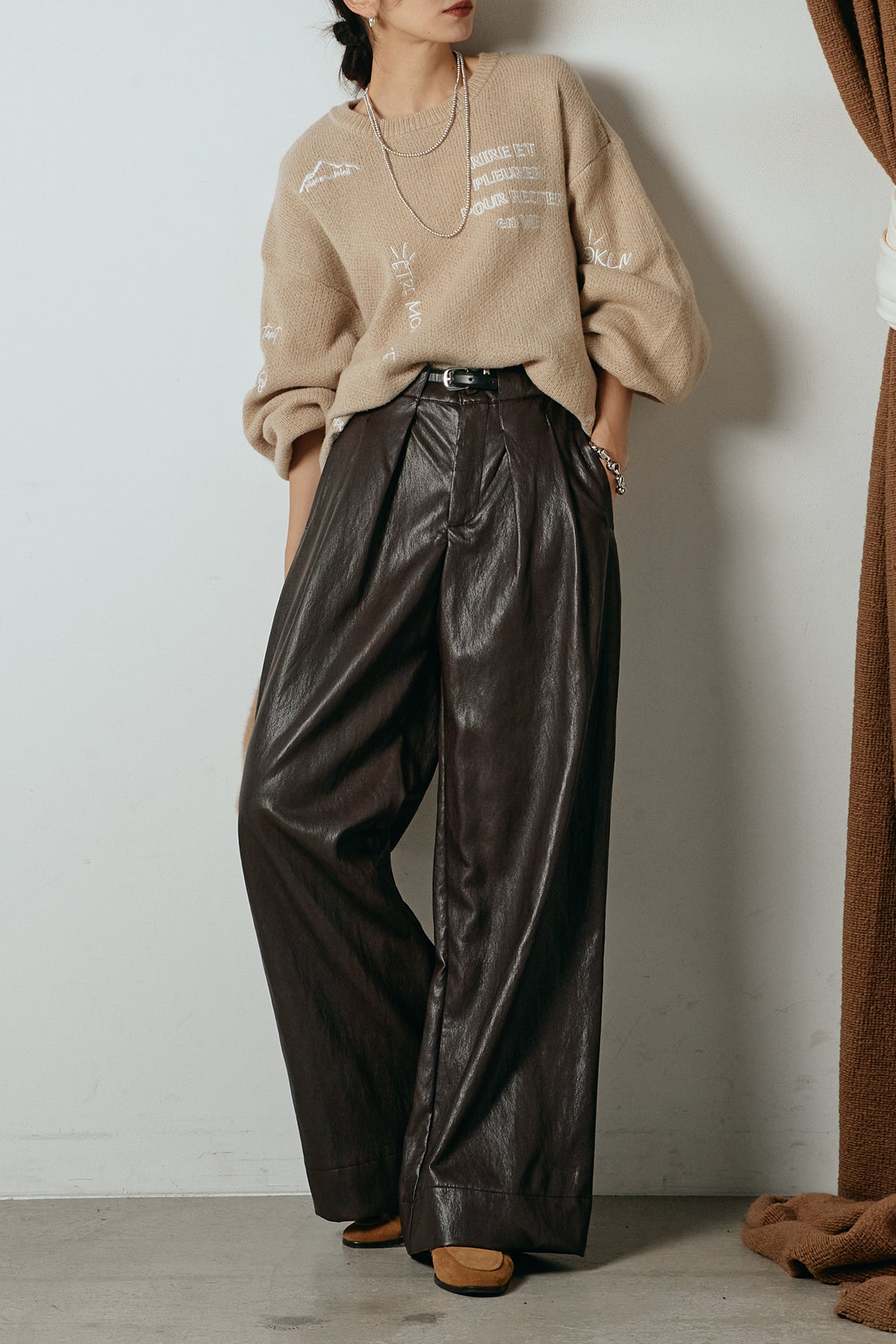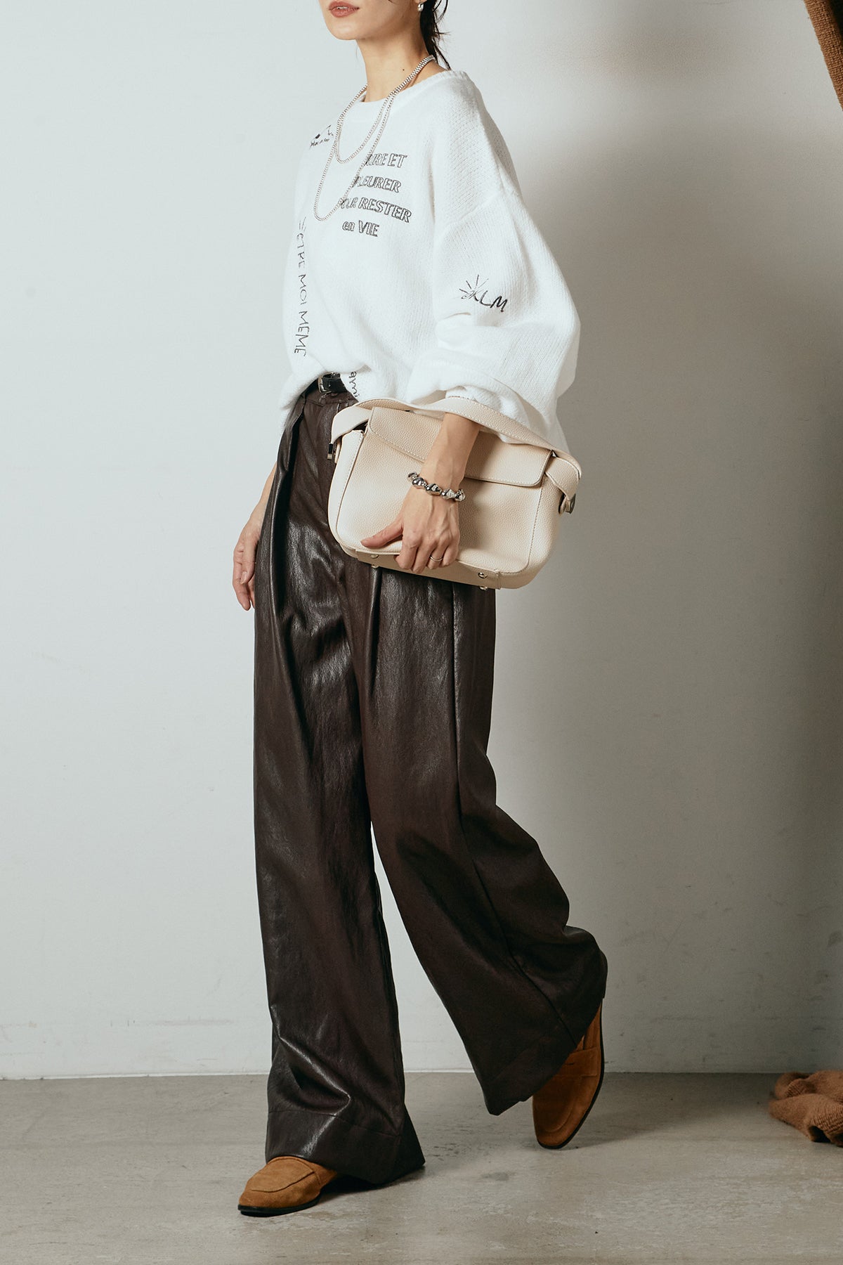 レザーライク素材で仕上げたタック入りパンツ。 ウエストまわりに程よいゆとりがあり、すっきりとしたバランスで着用できます。 付属ベルト付きで、トップスをインしたスタイルもまとまりやすい一本。 シンプルな合わせでもコーデに表情が出やすく、普段使いから外出まで幅広く活躍します。