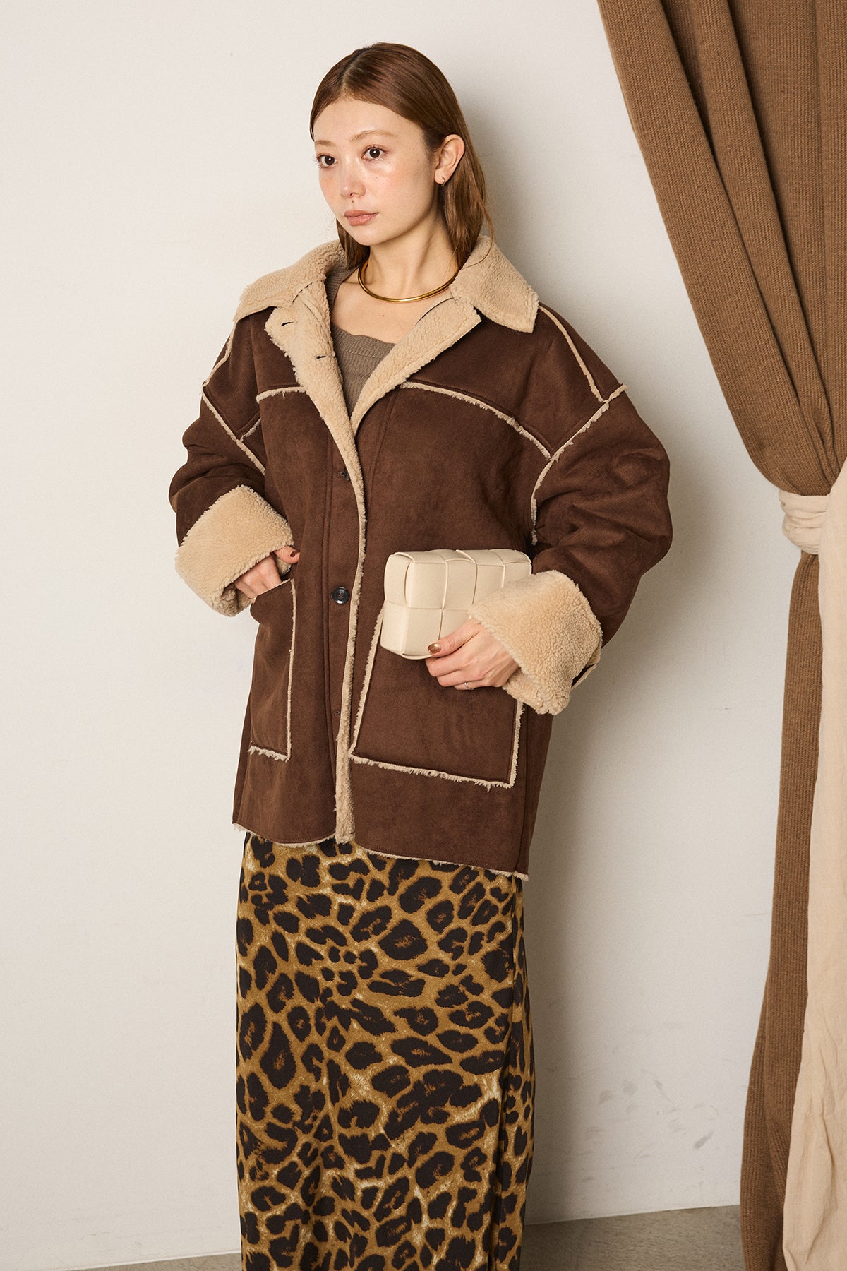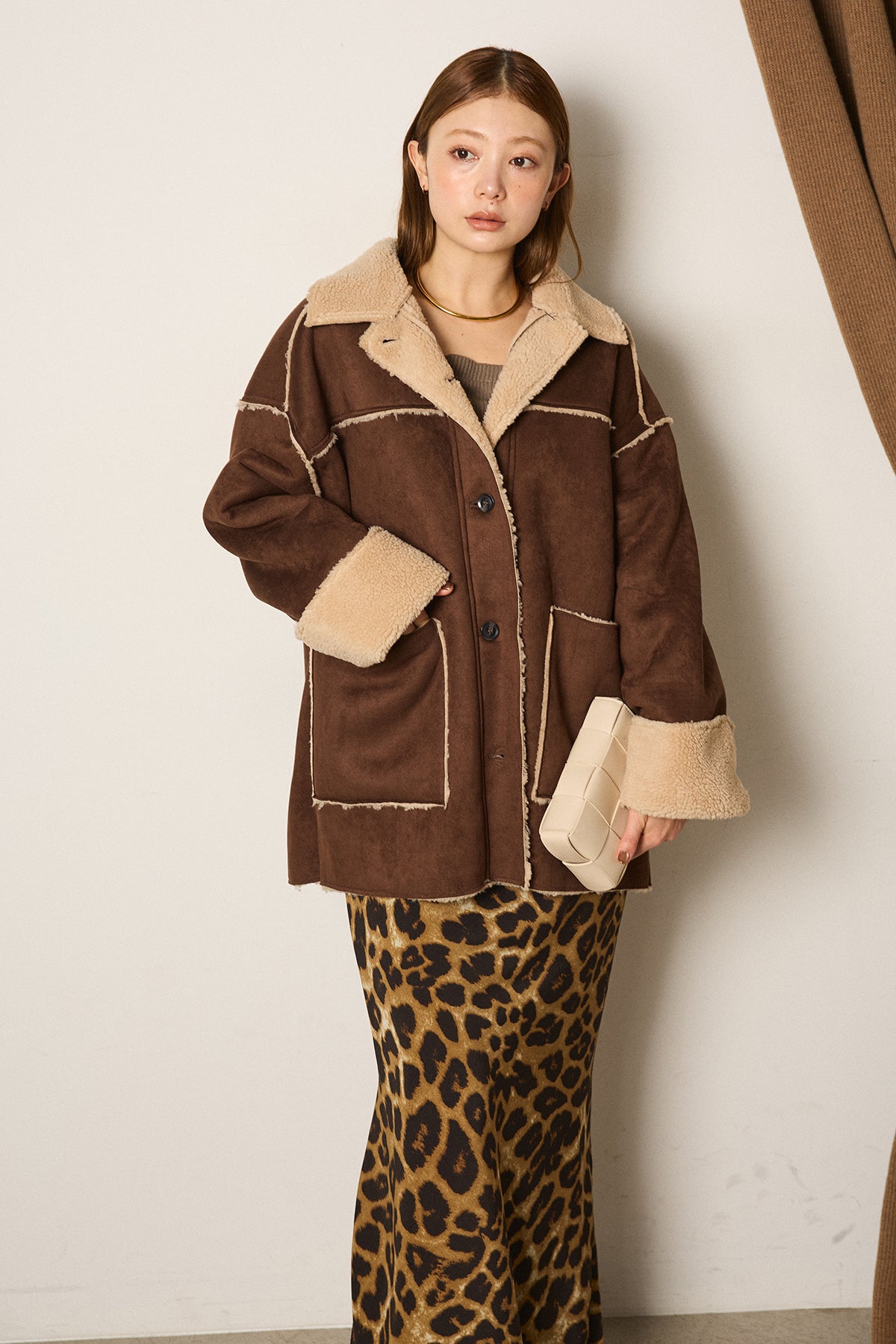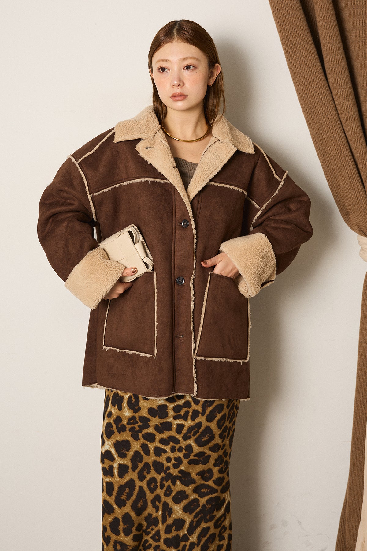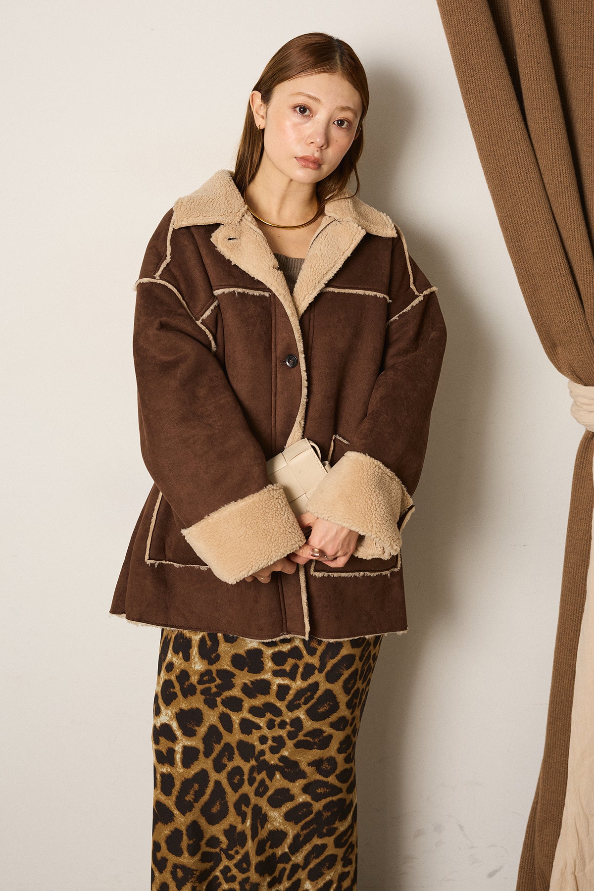 程よい厚みのエコムートン素材を活かしたミドル丈ジャケット。裏側のボアが首元から袖口まであたたかく包み込み、季節感のある着こなしに仕上がります。程よくゆとりのあるシルエットで、インナーを選ばず重ねやすいのもポイント。ステッチラインがさりげないアクセントになり、羽織るだけでバランスの取れたスタイルが完成します。日常使いからお出かけまで幅広く活躍する一着です。