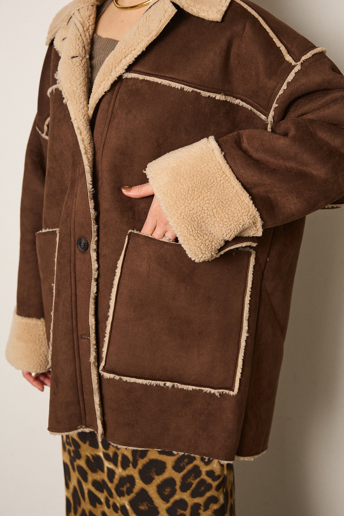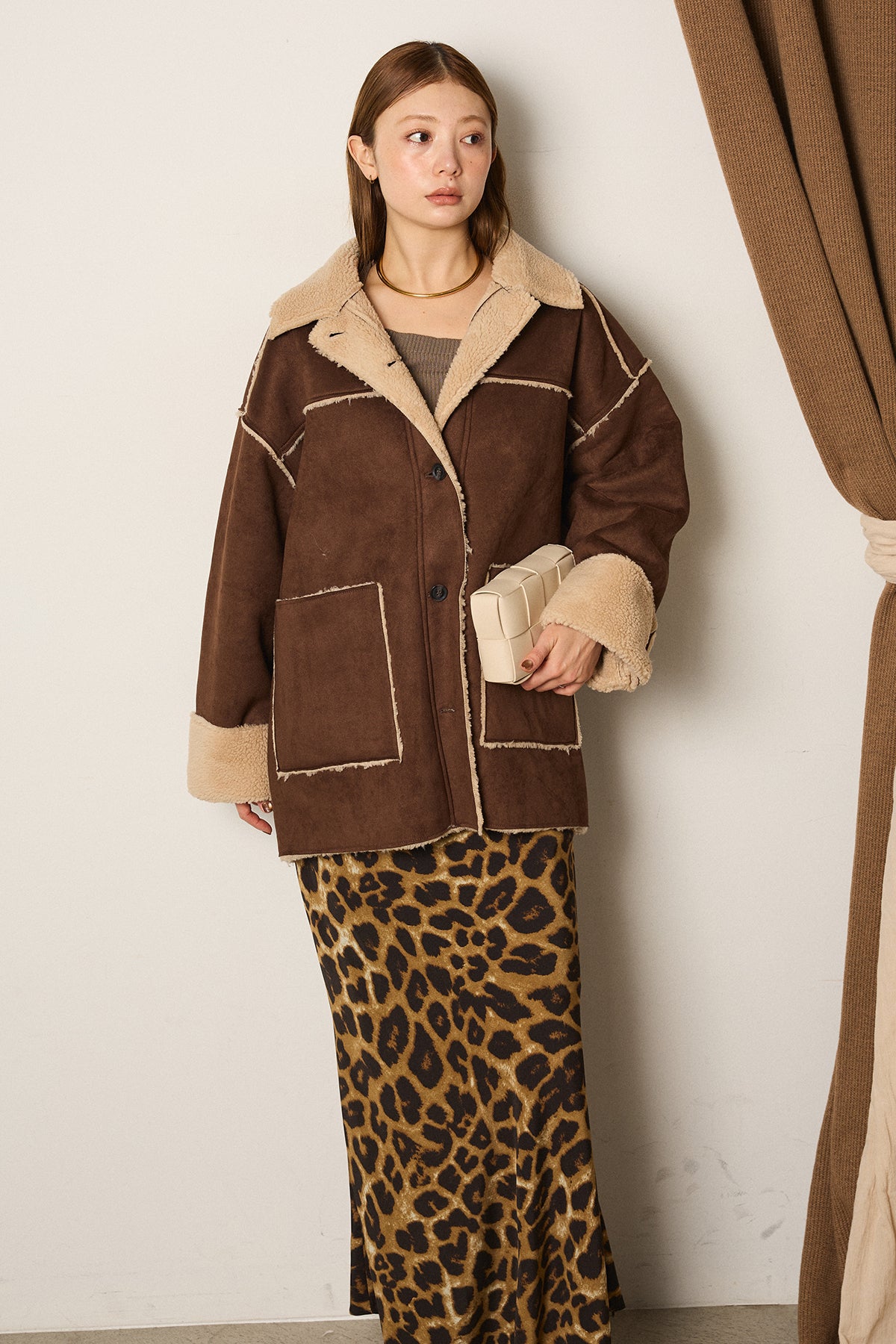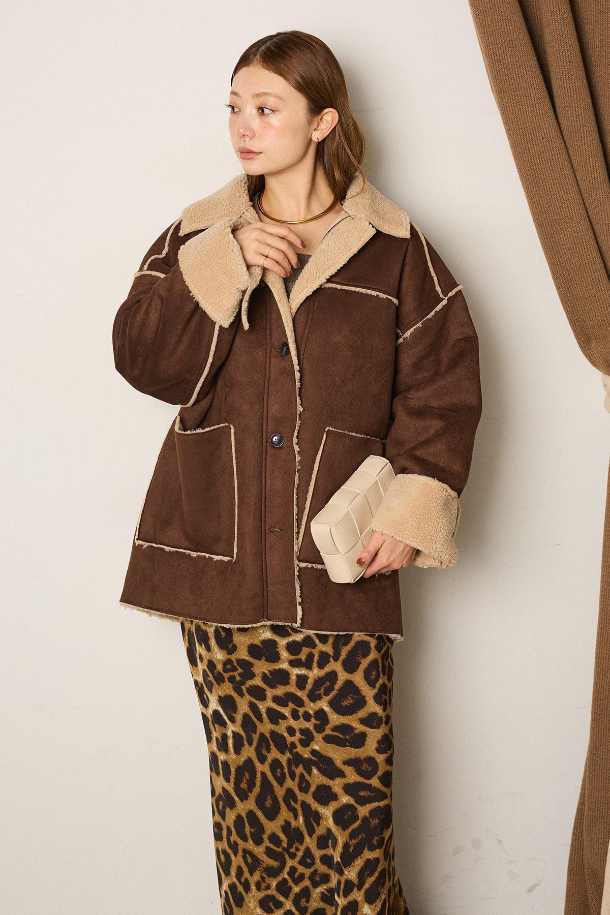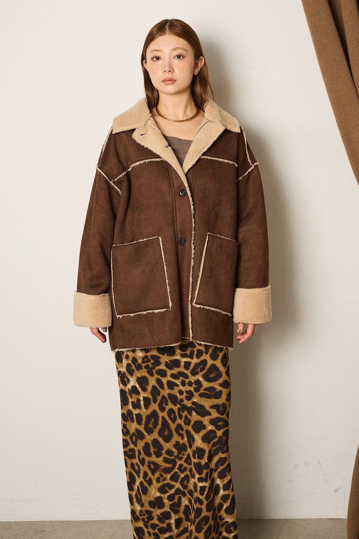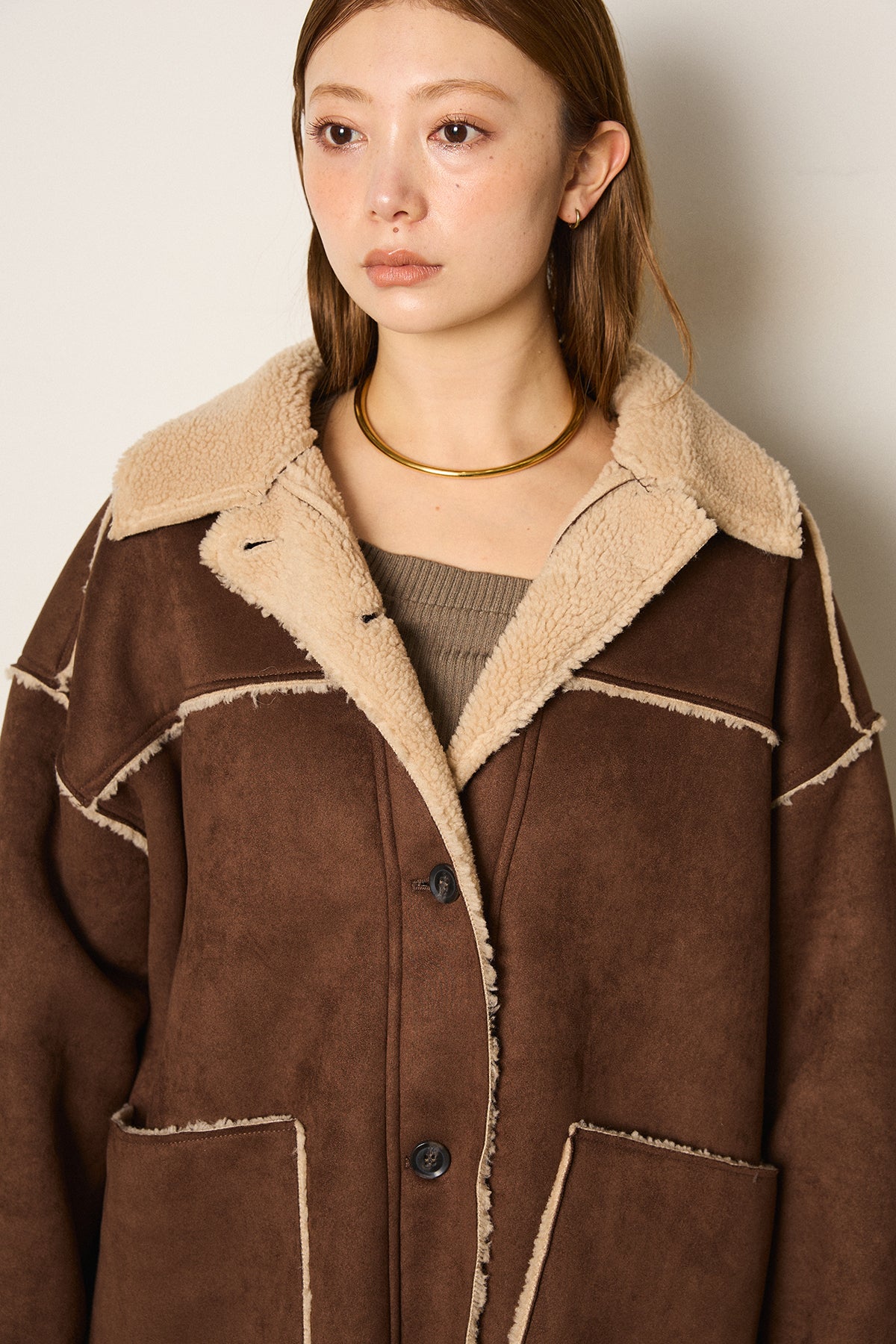 程よい厚みのエコムートン素材を活かしたミドル丈ジャケット。裏側のボアが首元から袖口まであたたかく包み込み、季節感のある着こなしに仕上がります。程よくゆとりのあるシルエットで、インナーを選ばず重ねやすいのもポイント。ステッチラインがさりげないアクセントになり、羽織るだけでバランスの取れたスタイルが完成します。日常使いからお出かけまで幅広く活躍する一着です。