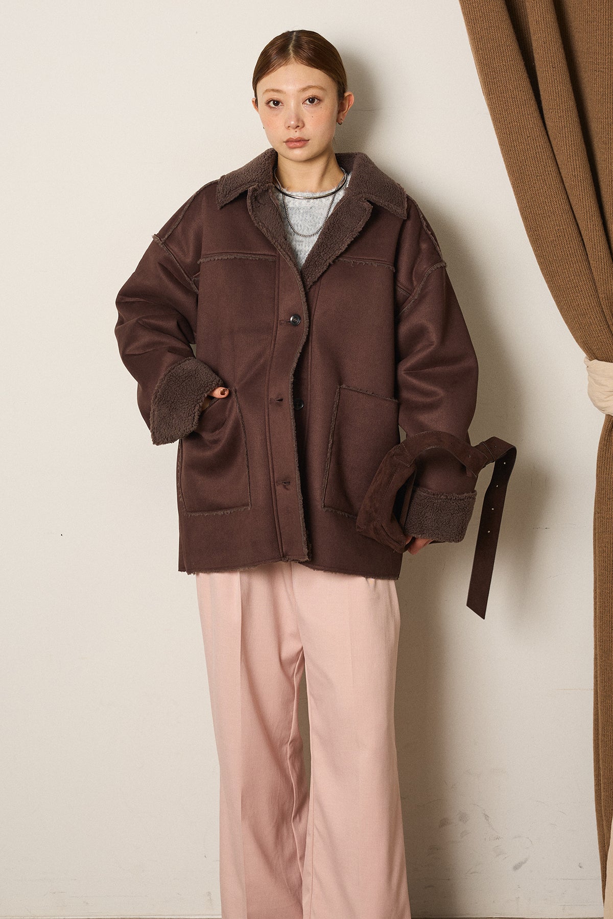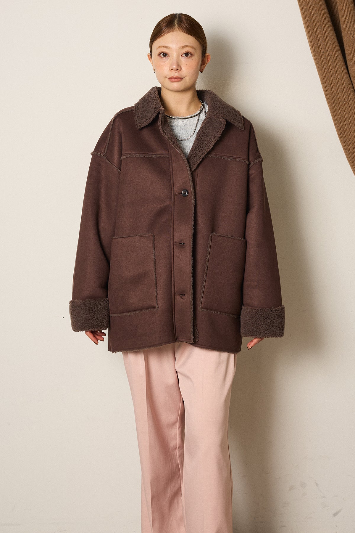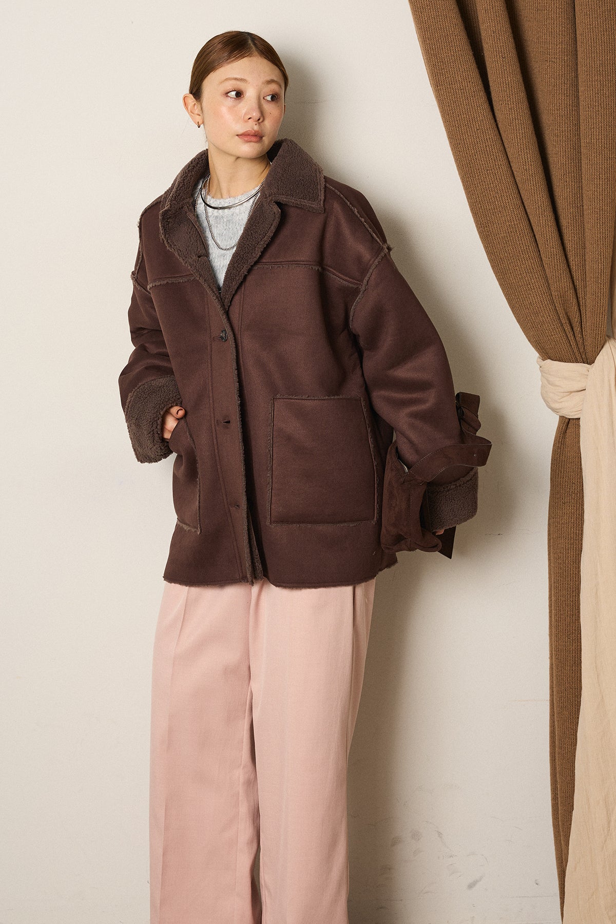 程よい厚みのエコムートン素材を活かしたミドル丈ジャケット。裏側のボアが首元から袖口まであたたかく包み込み、季節感のある着こなしに仕上がります。程よくゆとりのあるシルエットで、インナーを選ばず重ねやすいのもポイント。ステッチラインがさりげないアクセントになり、羽織るだけでバランスの取れたスタイルが完成します。日常使いからお出かけまで幅広く活躍する一着です。