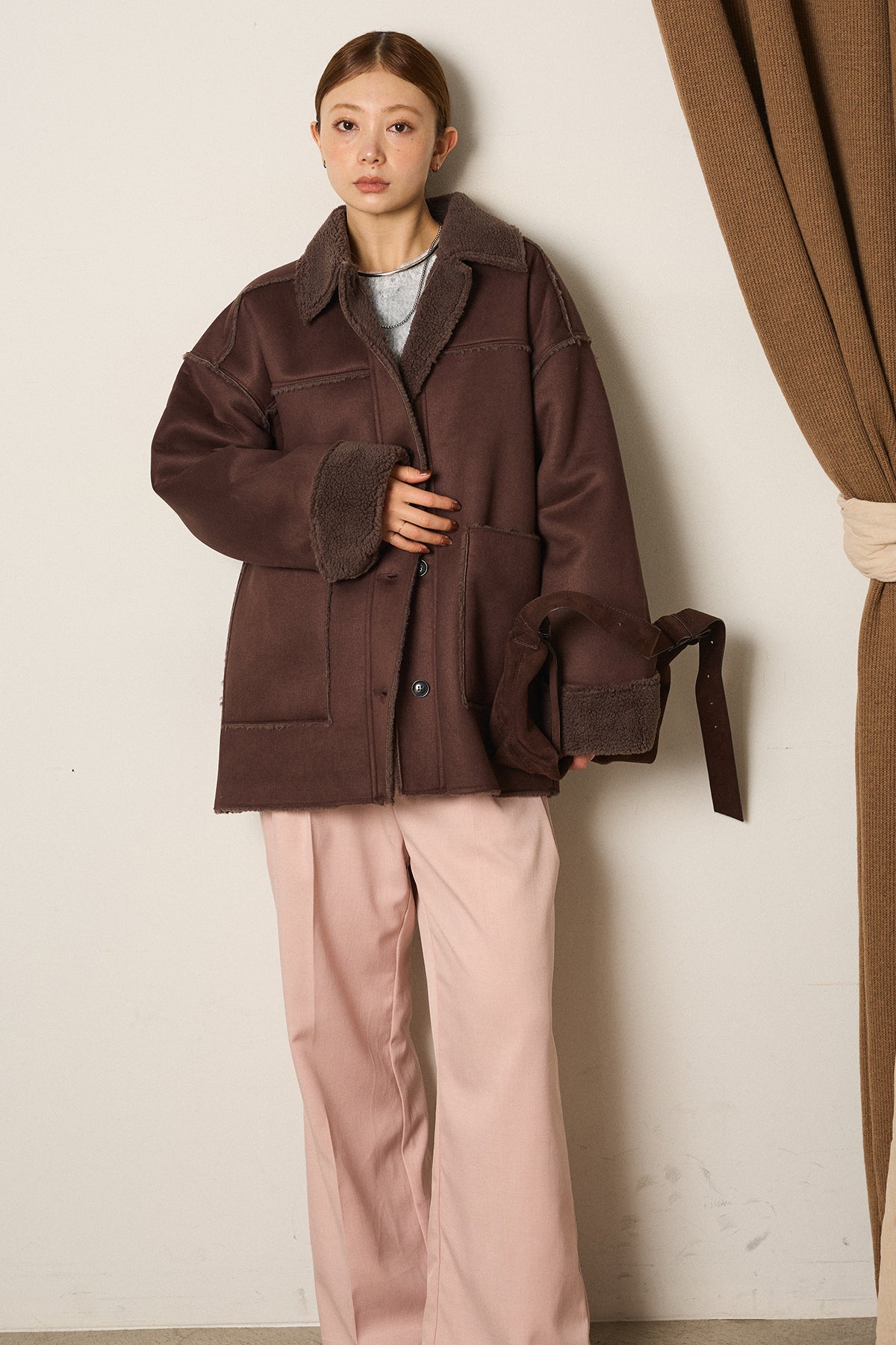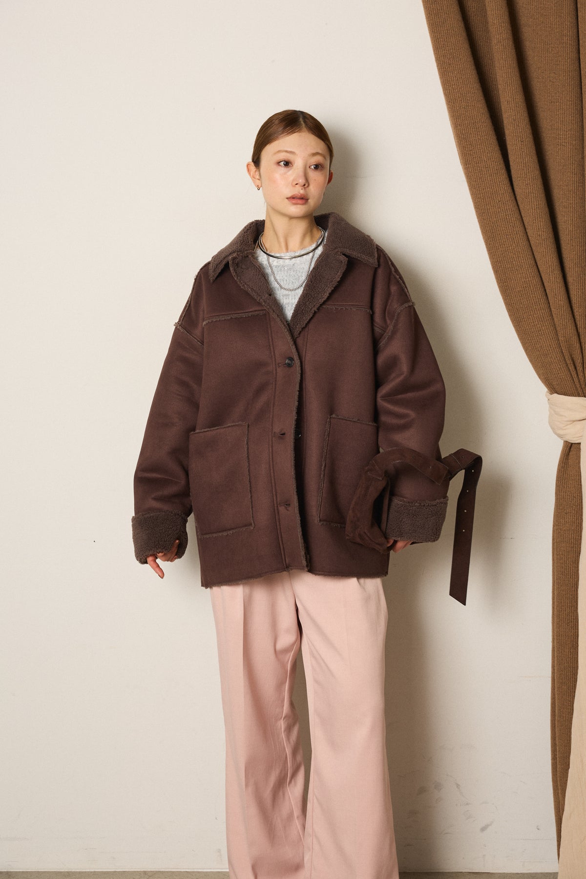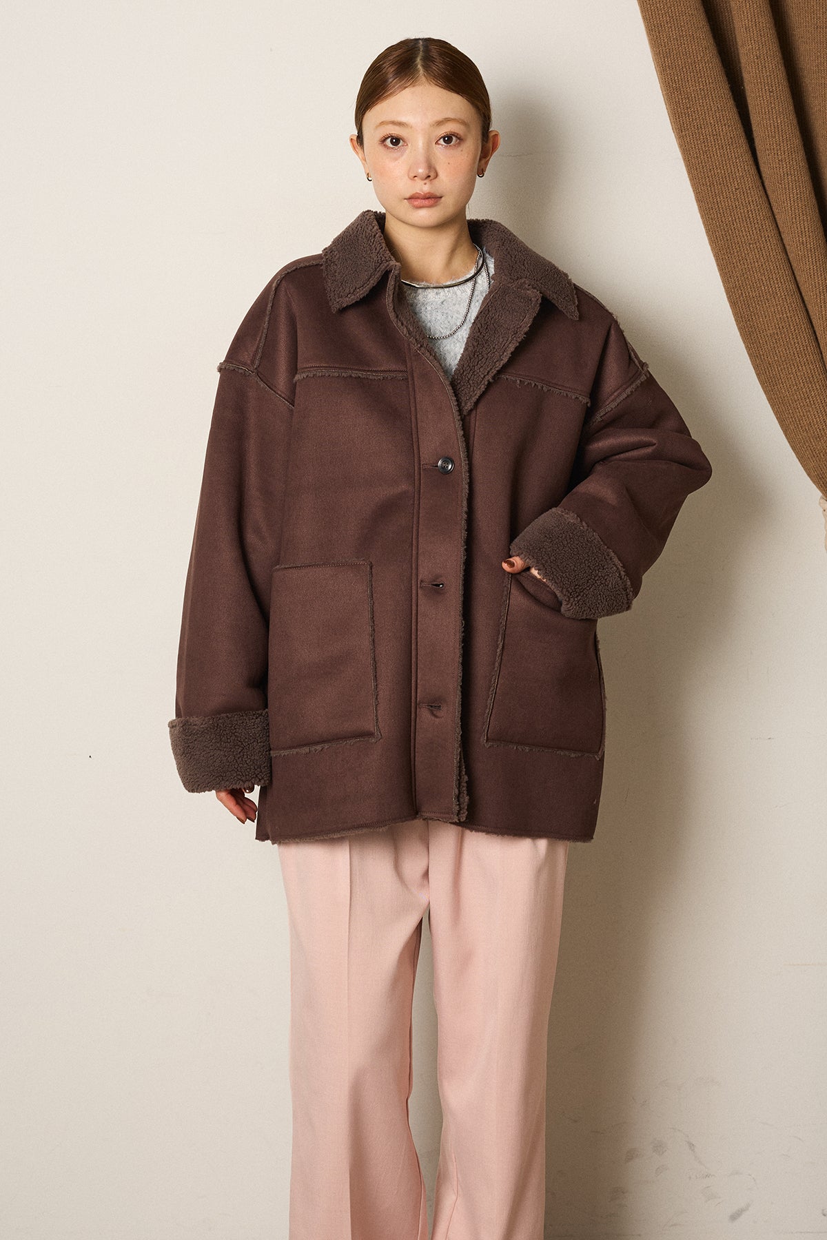程よい厚みのエコムートン素材を活かしたミドル丈ジャケット。裏側のボアが首元から袖口まであたたかく包み込み、季節感のある着こなしに仕上がります。程よくゆとりのあるシルエットで、インナーを選ばず重ねやすいのもポイント。ステッチラインがさりげないアクセントになり、羽織るだけでバランスの取れたスタイルが完成します。日常使いからお出かけまで幅広く活躍する一着です。