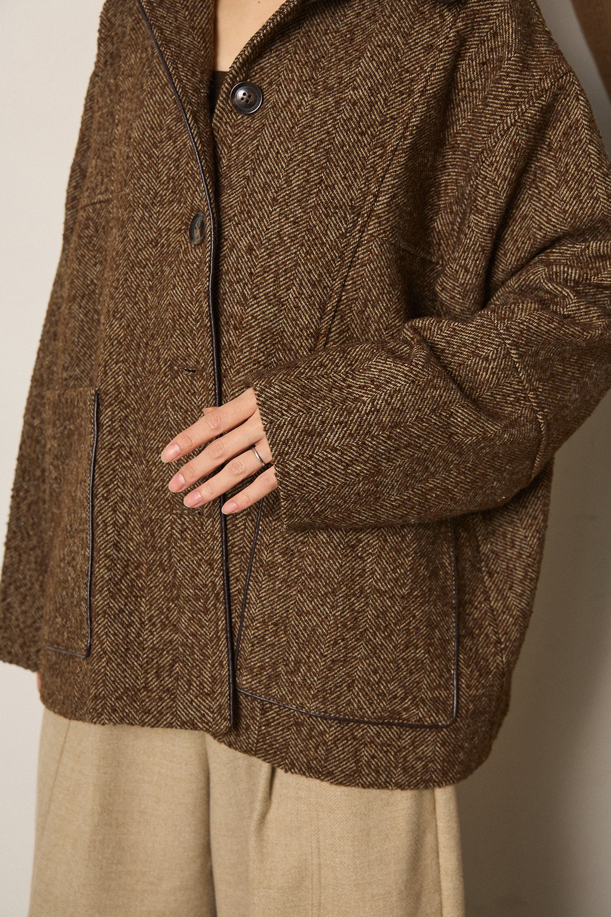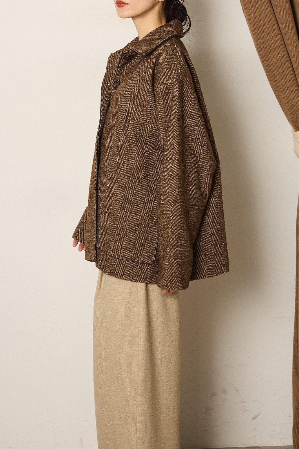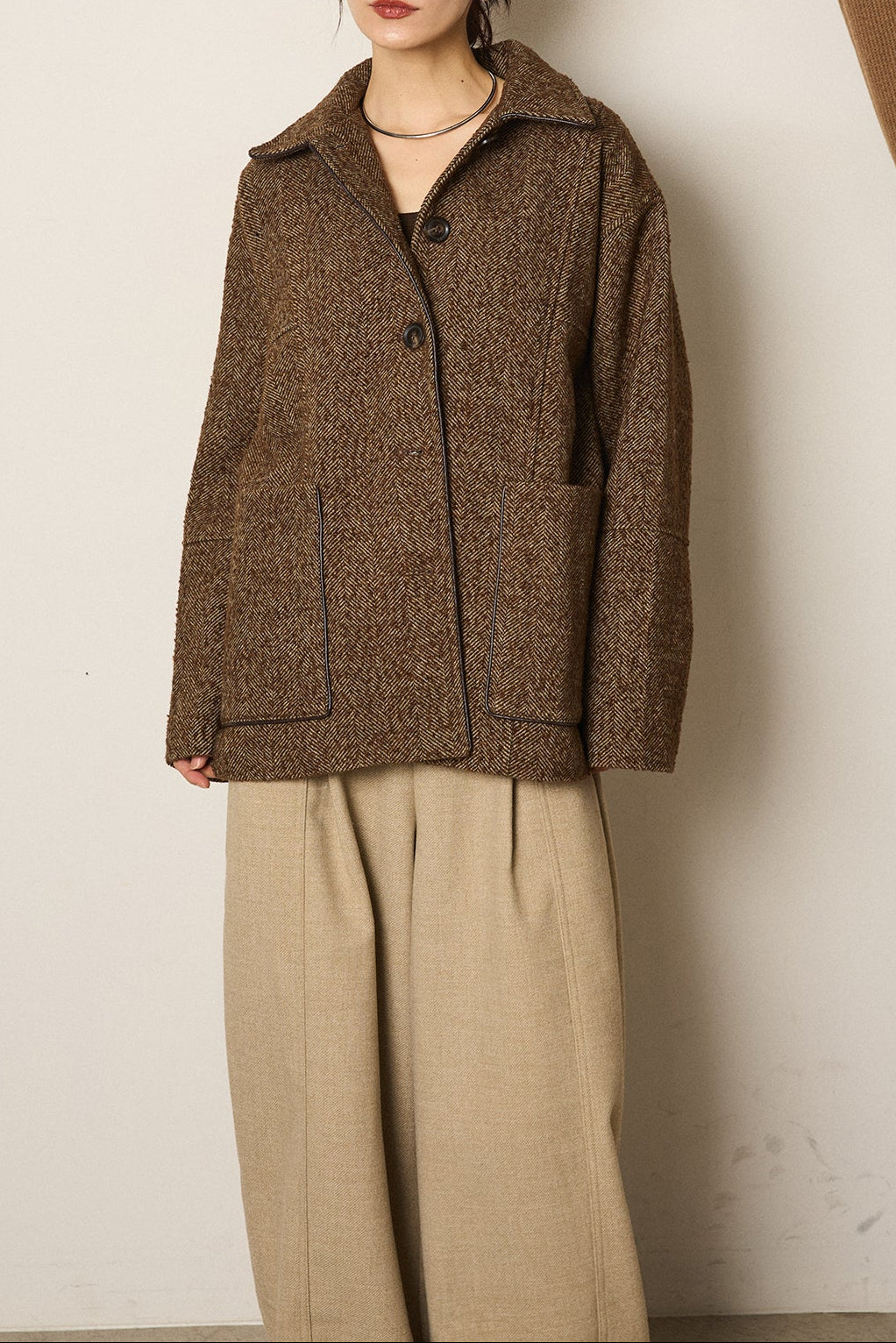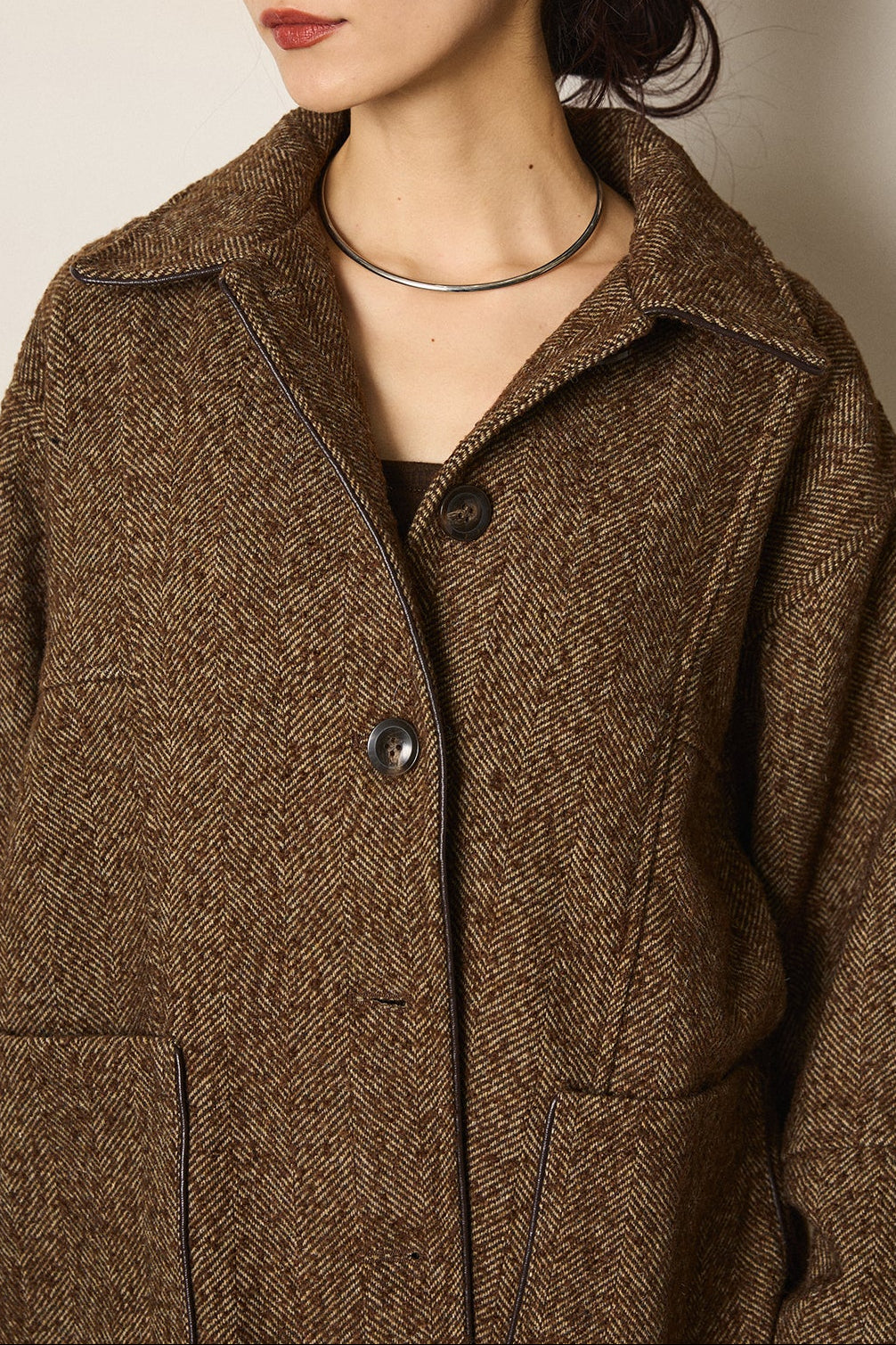 ネップヘリンボーン合皮パイピングカバーオール/ブラウン