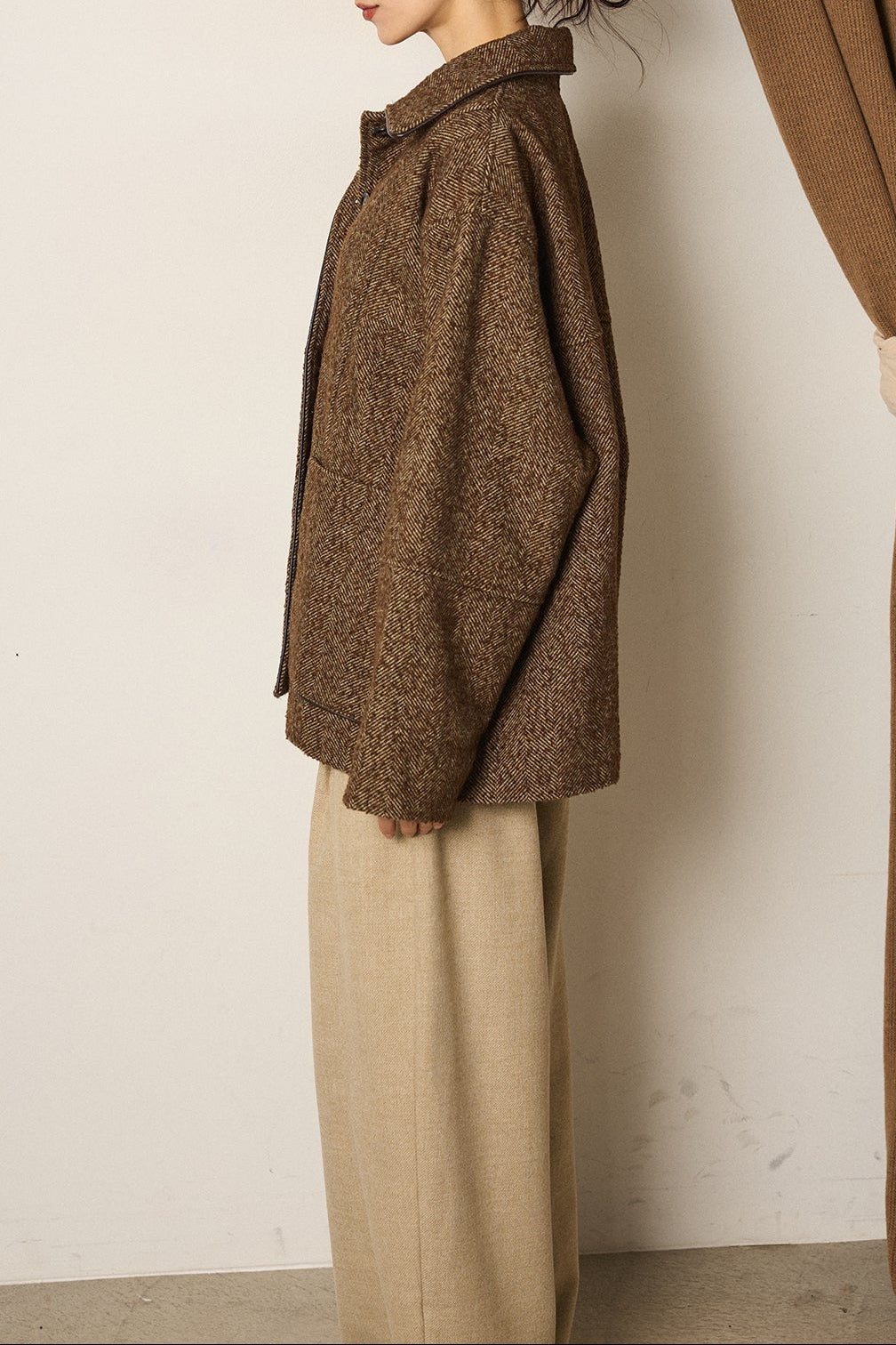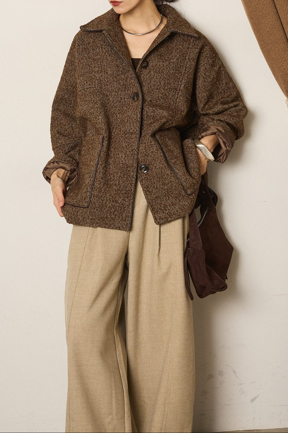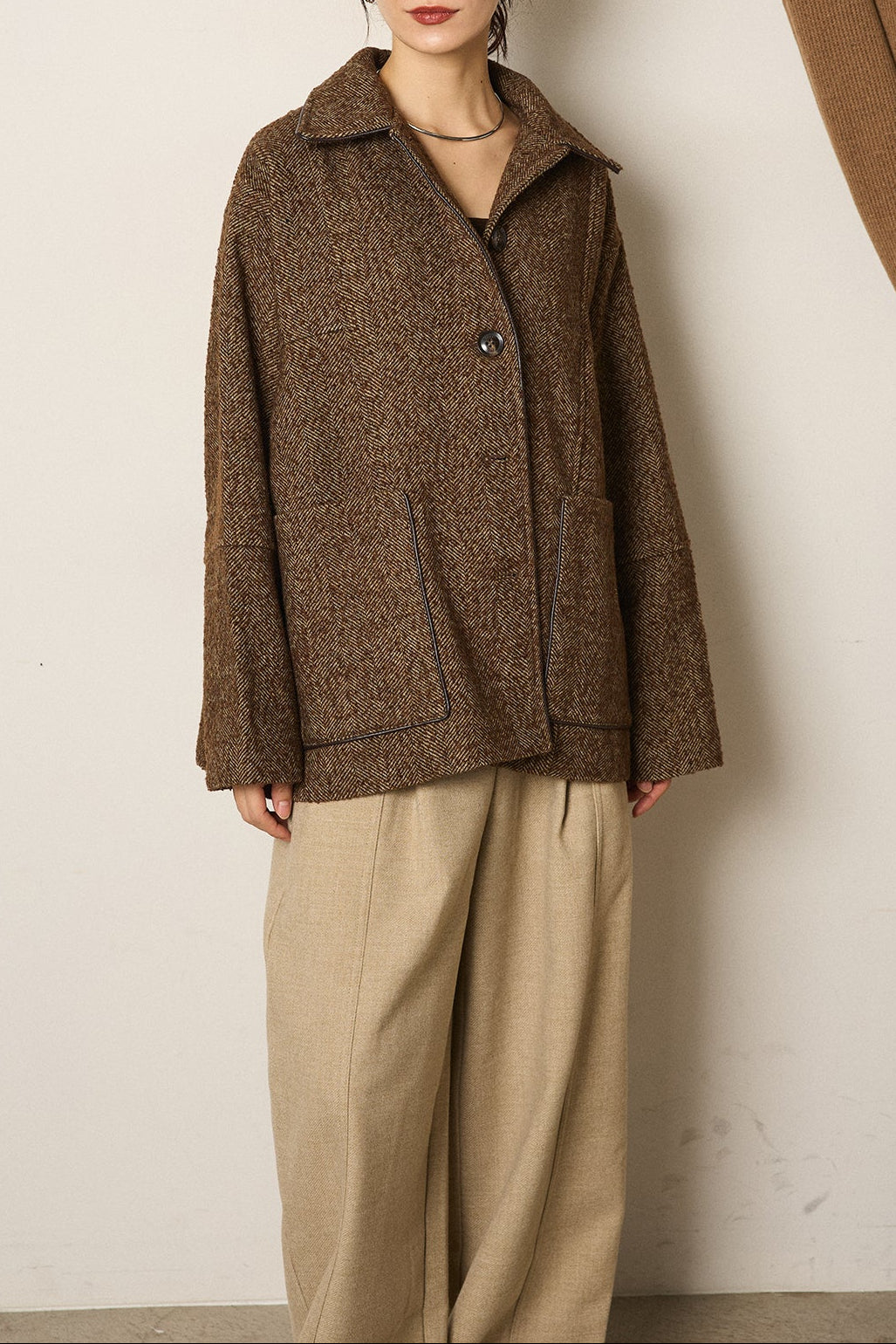 ネップヘリンボーン合皮パイピングカバーオール/ブラウン