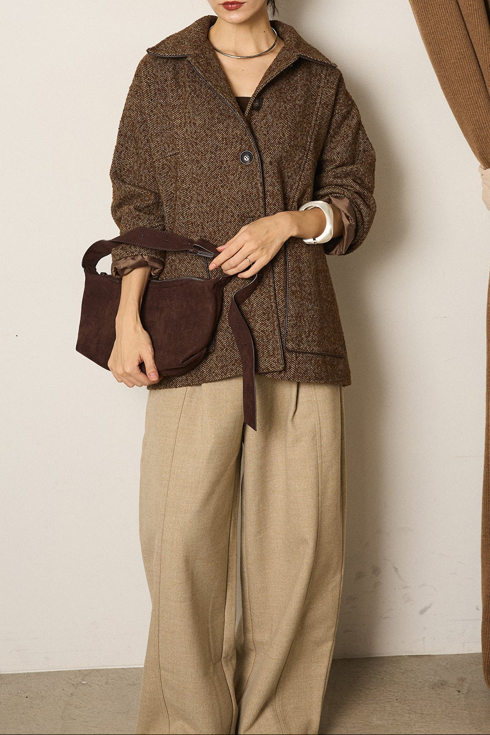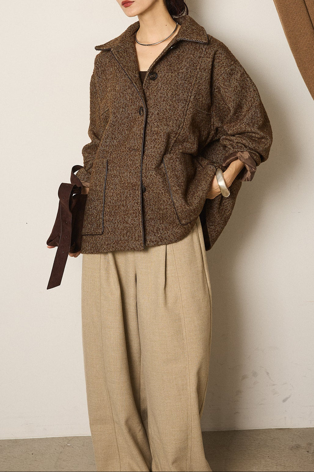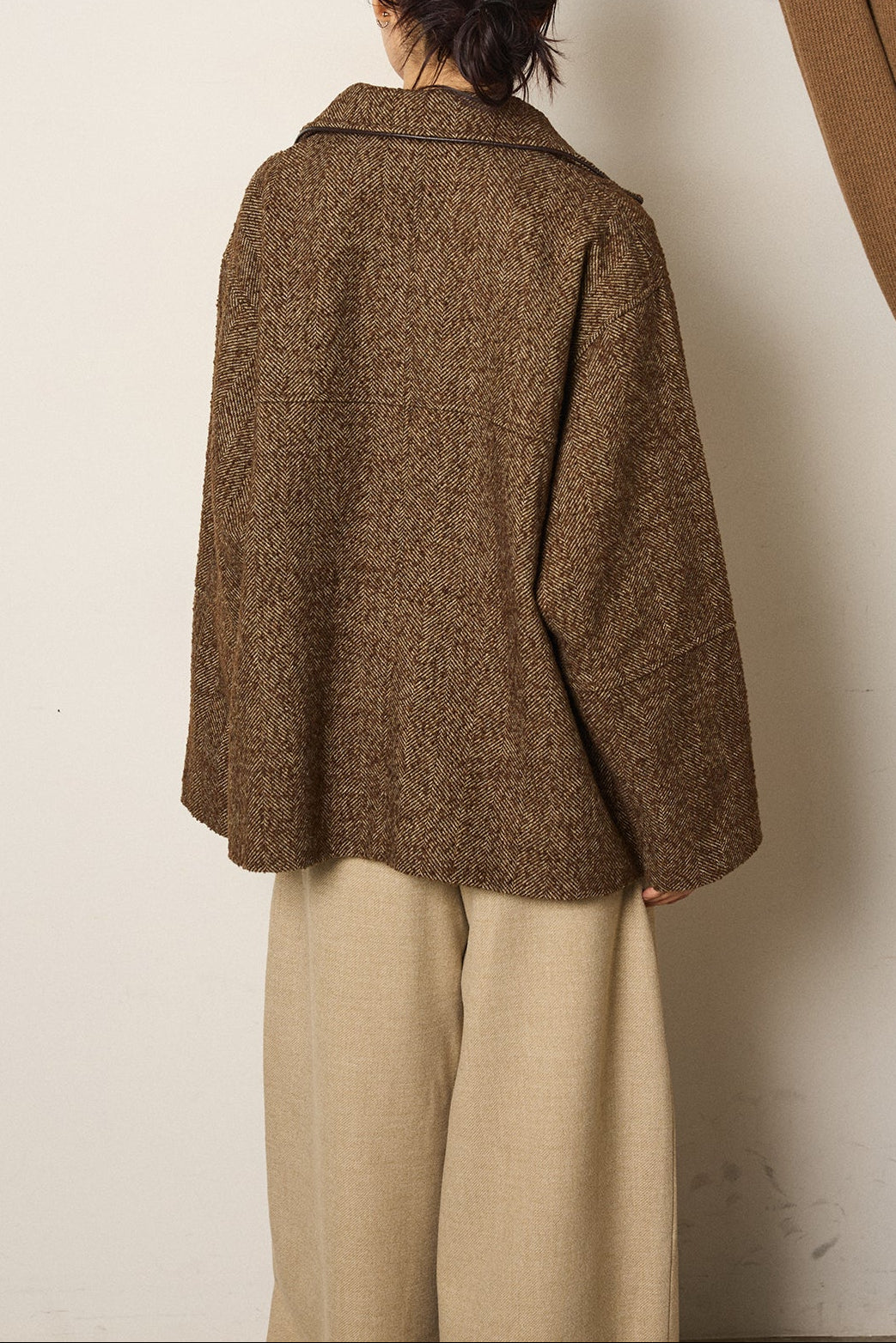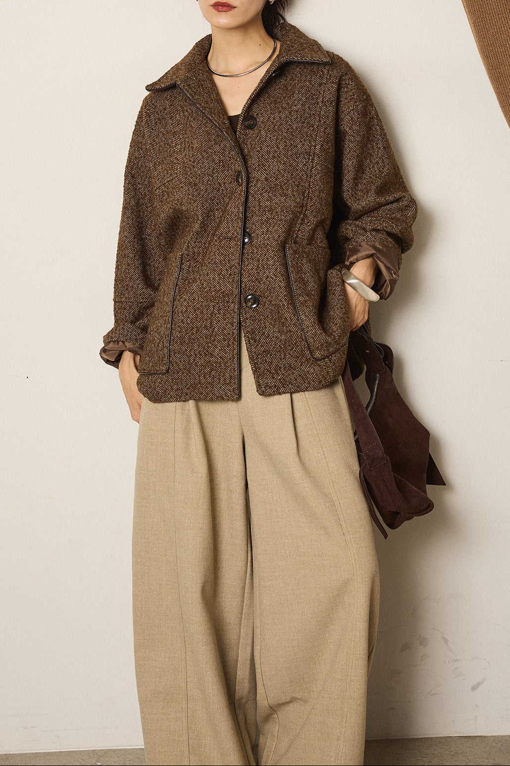 ネップヘリンボーン合皮パイピングカバーオール/ブラウン