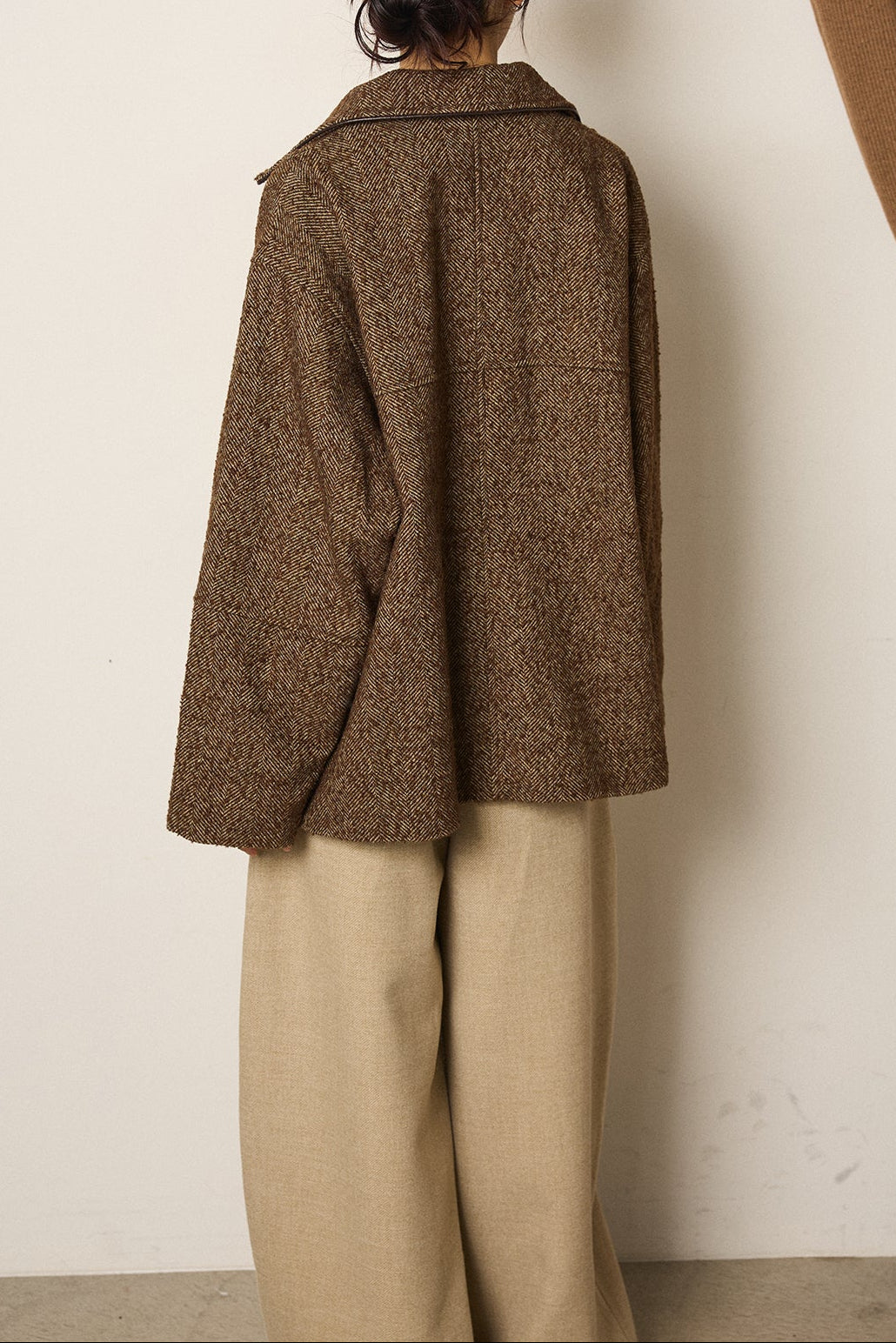 ネップ感のあるヘリンボーン素材が印象的なカバーオール。程よい厚みと落ち着いた表情で、スタイリングに奥行きをプラスします。合皮パイピングが全体を引き締め、さりげないアクセントに。ゆとりのあるシルエットで重ね着しやすく、インナー次第で長い期間着用可能。パンツにもスカートにも合わせやすく、デイリーに取り入れやすい一着です。