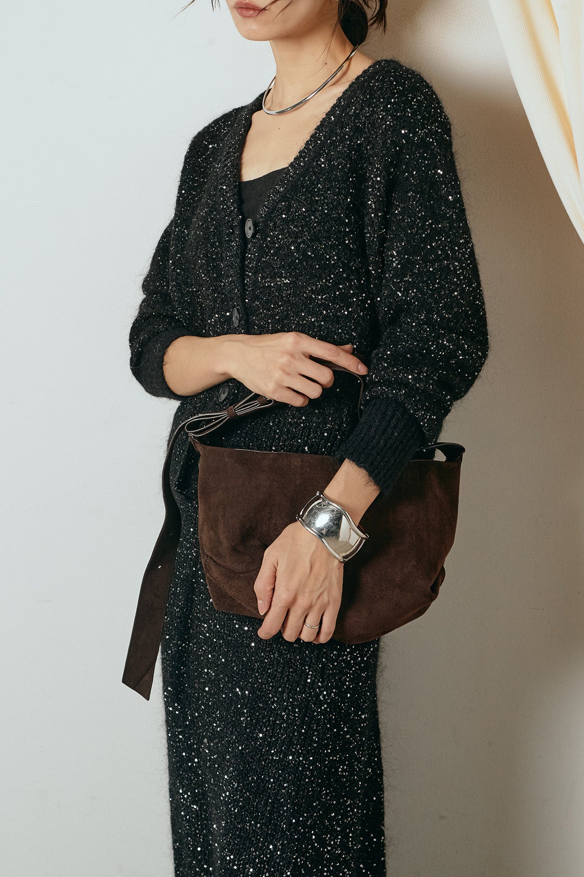 ラメ糸を織り込んだニット素材が、さりげない輝きを添えるカーディガン。深めのVネックとすっきりとしたシルエットで、甘くなりすぎず大人っぽい印象に仕上げています。軽やかな着心地ながらも程よい存在感があり、羽織るだけでスタイリングに華やかさをプラス。ボタンを留めても開けてもバランスよく、デイリーからきれいめまで幅広く活躍する一枚です。