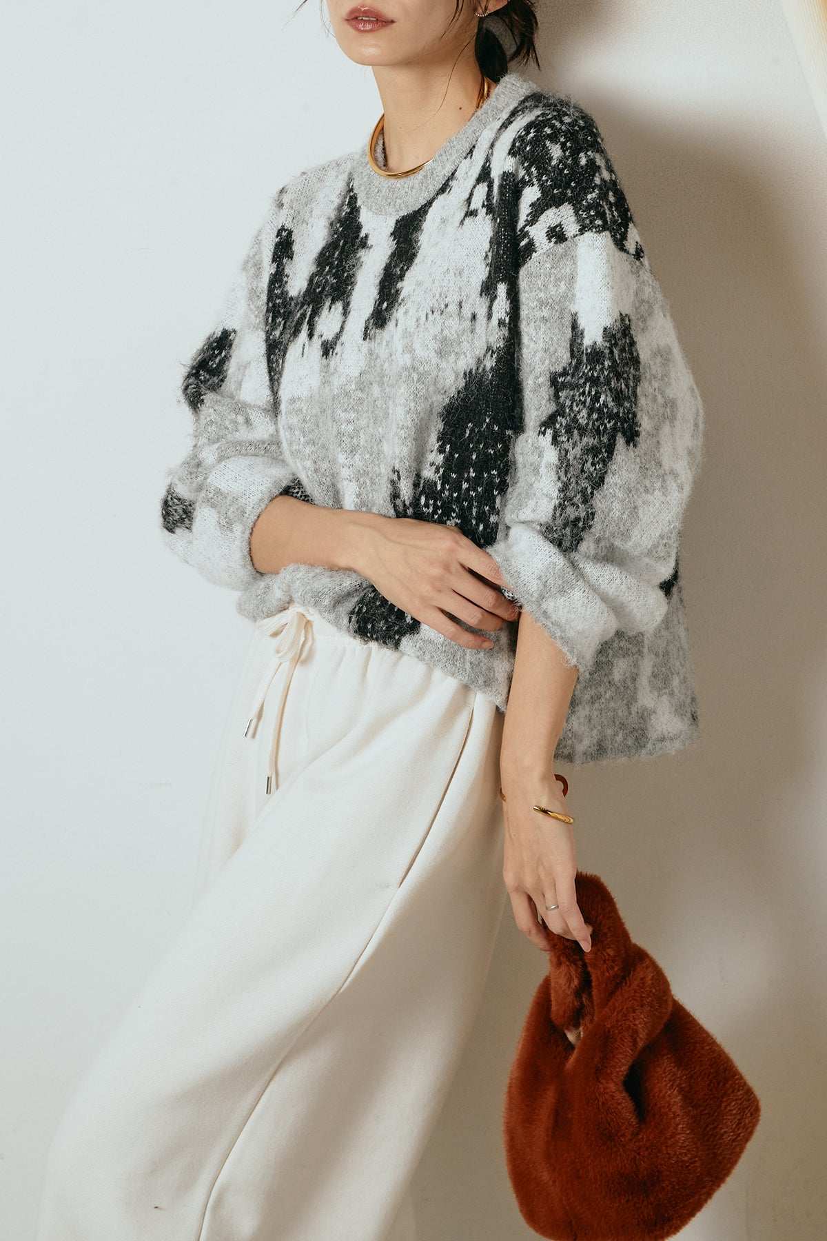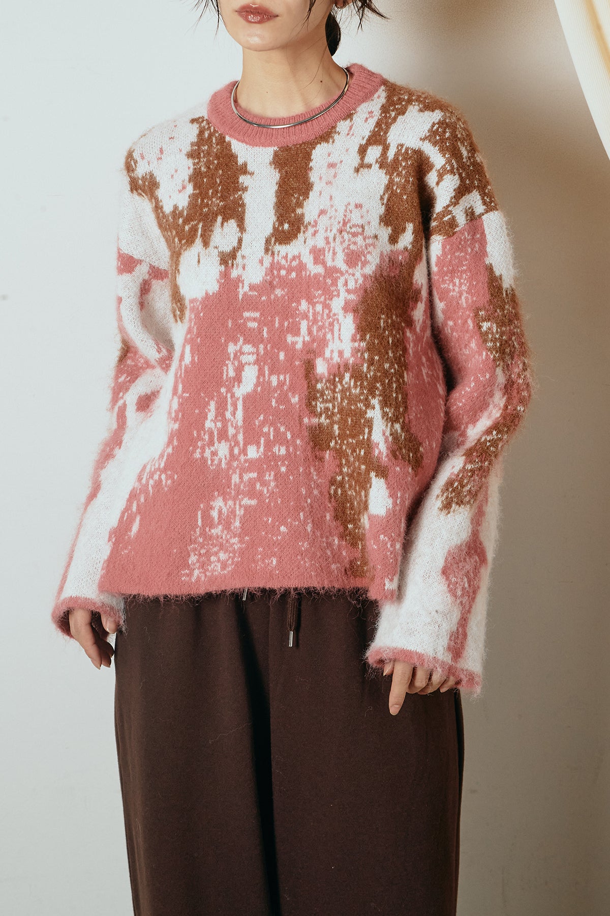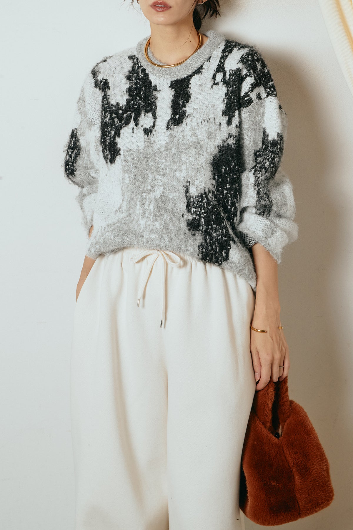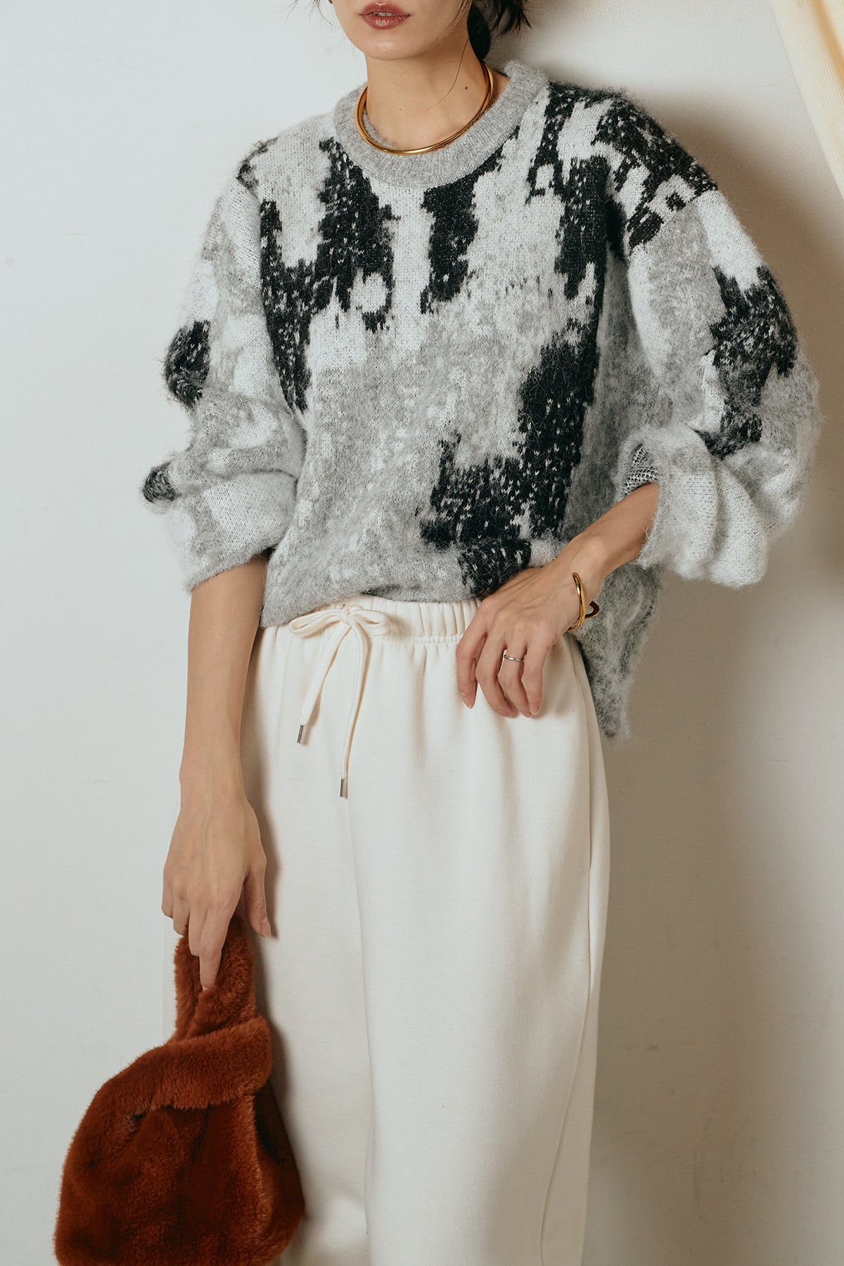 起毛感のある柔らかなニットに、ニュアンス柄をのせたデザイン性の高いプルオーバー。ランダムな柄の表情がシンプルなスタイリングに奥行きを与え、1枚で存在感のある着こなしが完成します。程よくゆとりのあるシルエットでリラックス感がありながら、バランスよくまとまるのも魅力。パンツにもスカートにも合わせやすく、季節感を取り入れたコーディネートが楽しめる一枚です。
