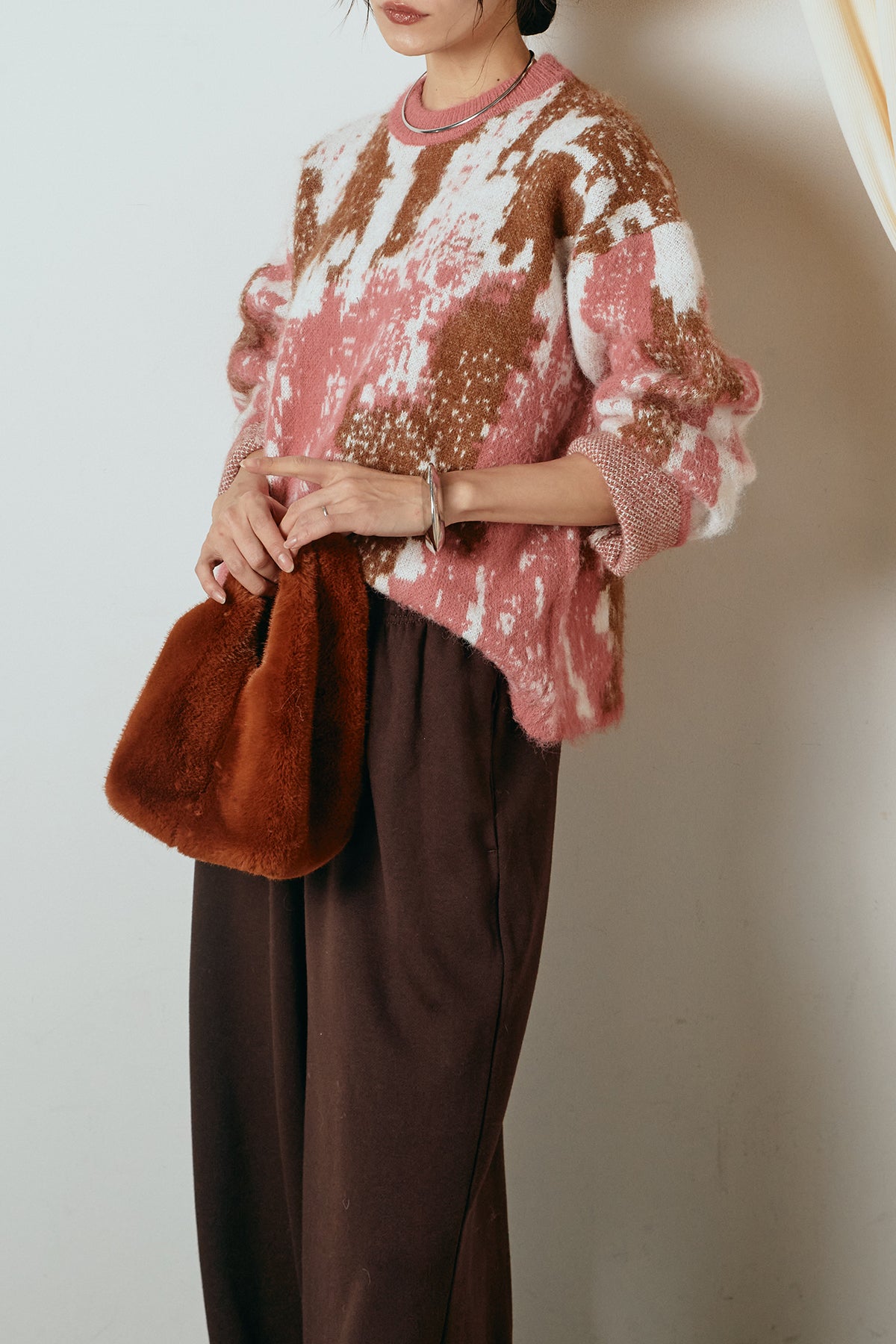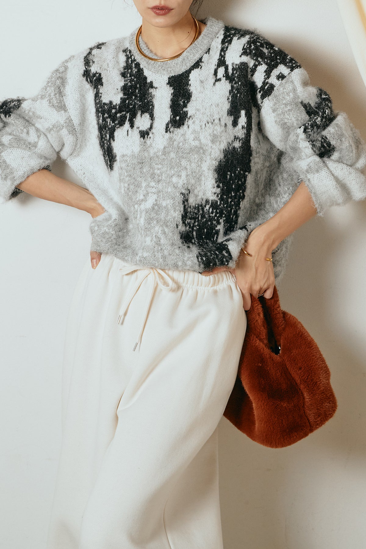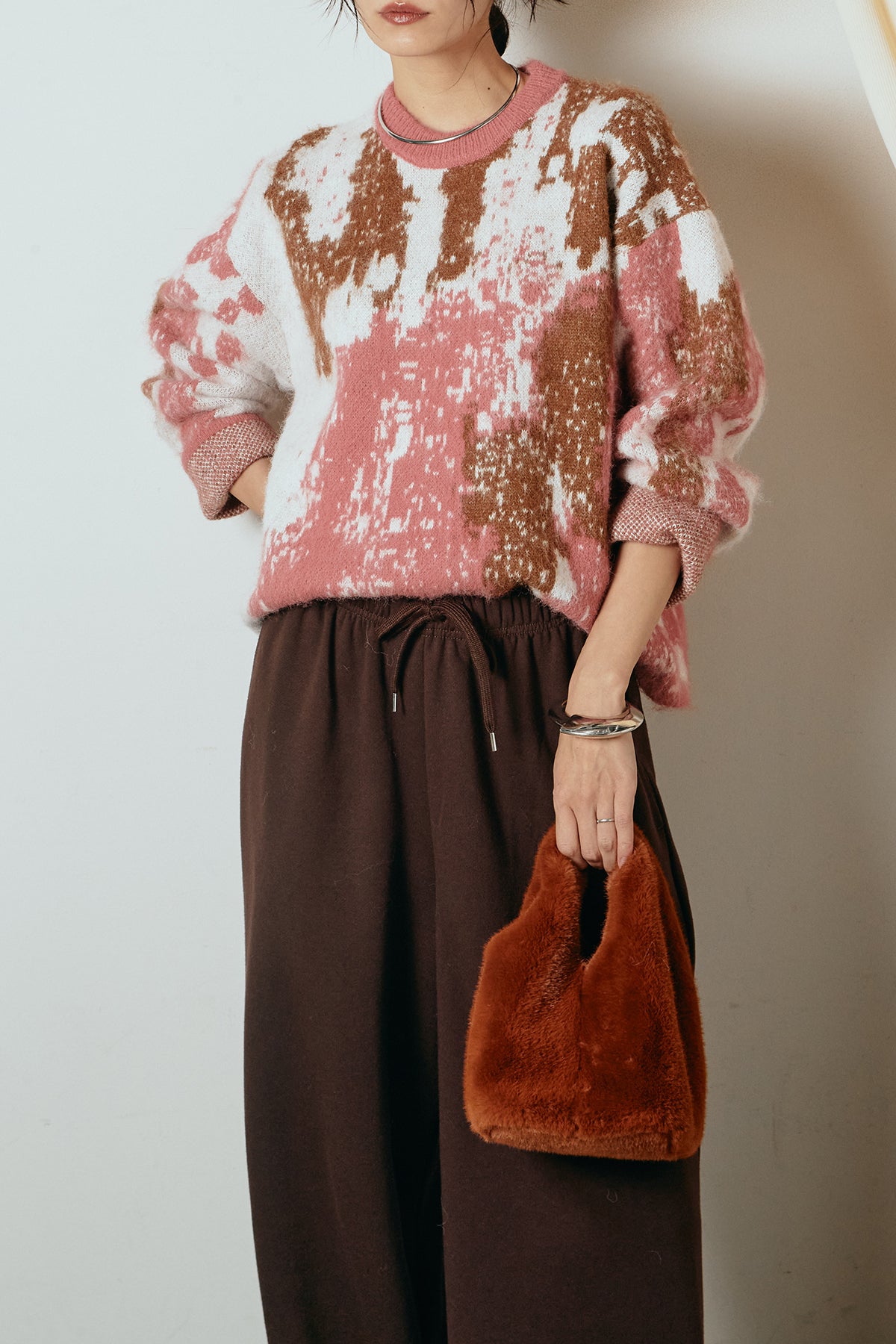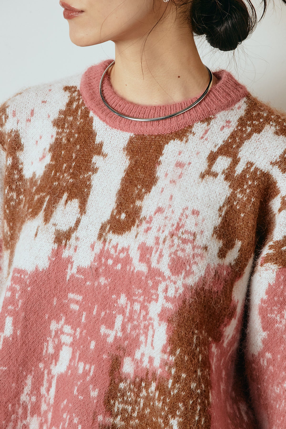 起毛感のある柔らかなニットに、ニュアンス柄をのせたデザイン性の高いプルオーバー。ランダムな柄の表情がシンプルなスタイリングに奥行きを与え、1枚で存在感のある着こなしが完成します。程よくゆとりのあるシルエットでリラックス感がありながら、バランスよくまとまるのも魅力。パンツにもスカートにも合わせやすく、季節感を取り入れたコーディネートが楽しめる一枚です。