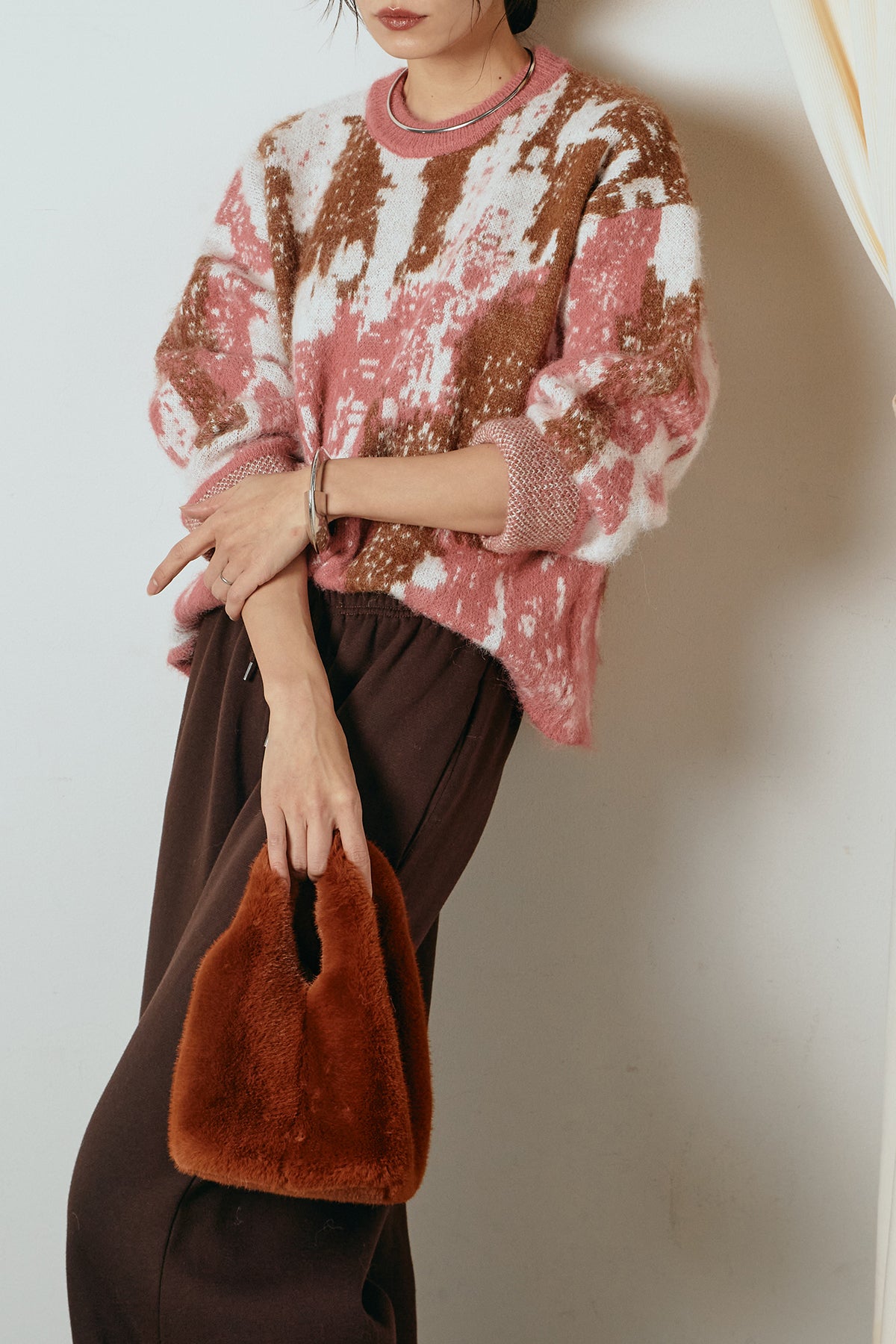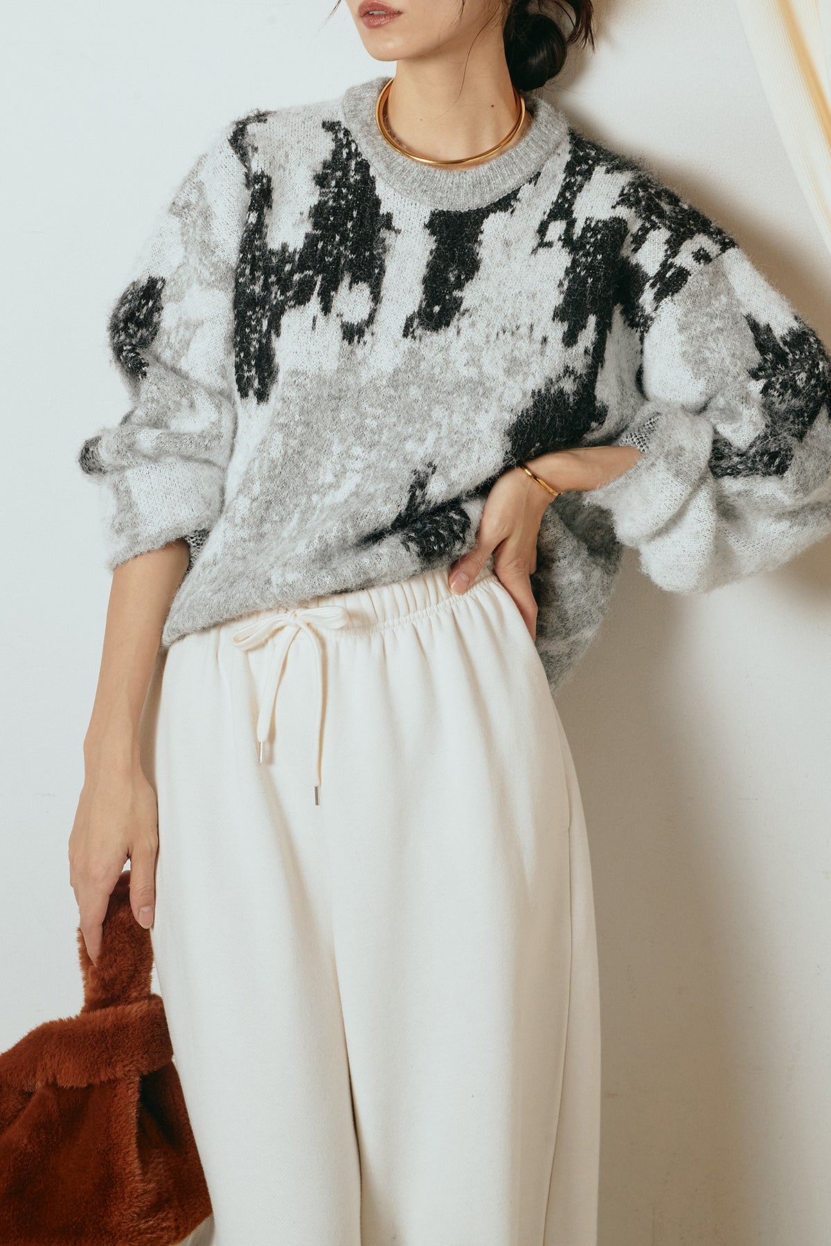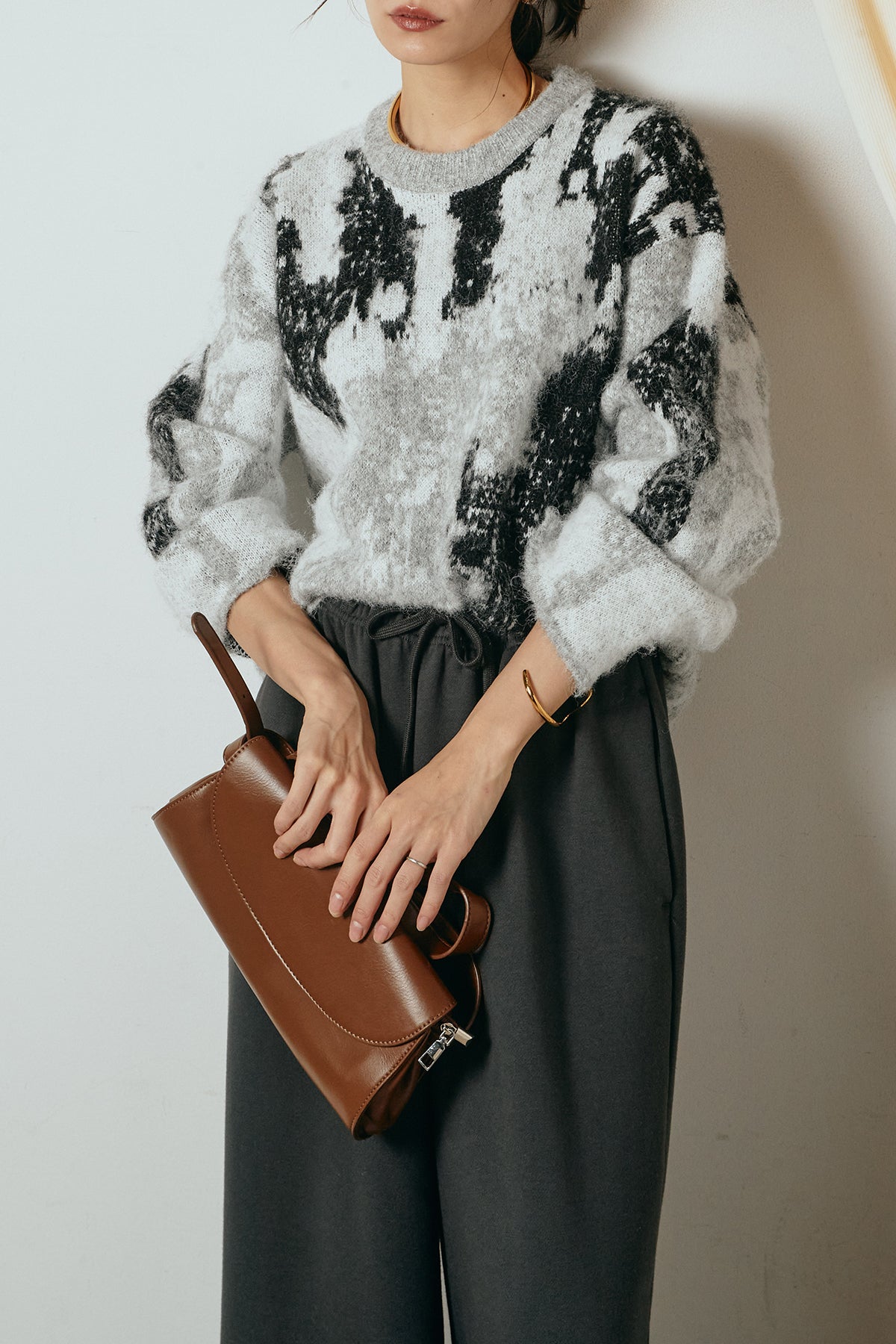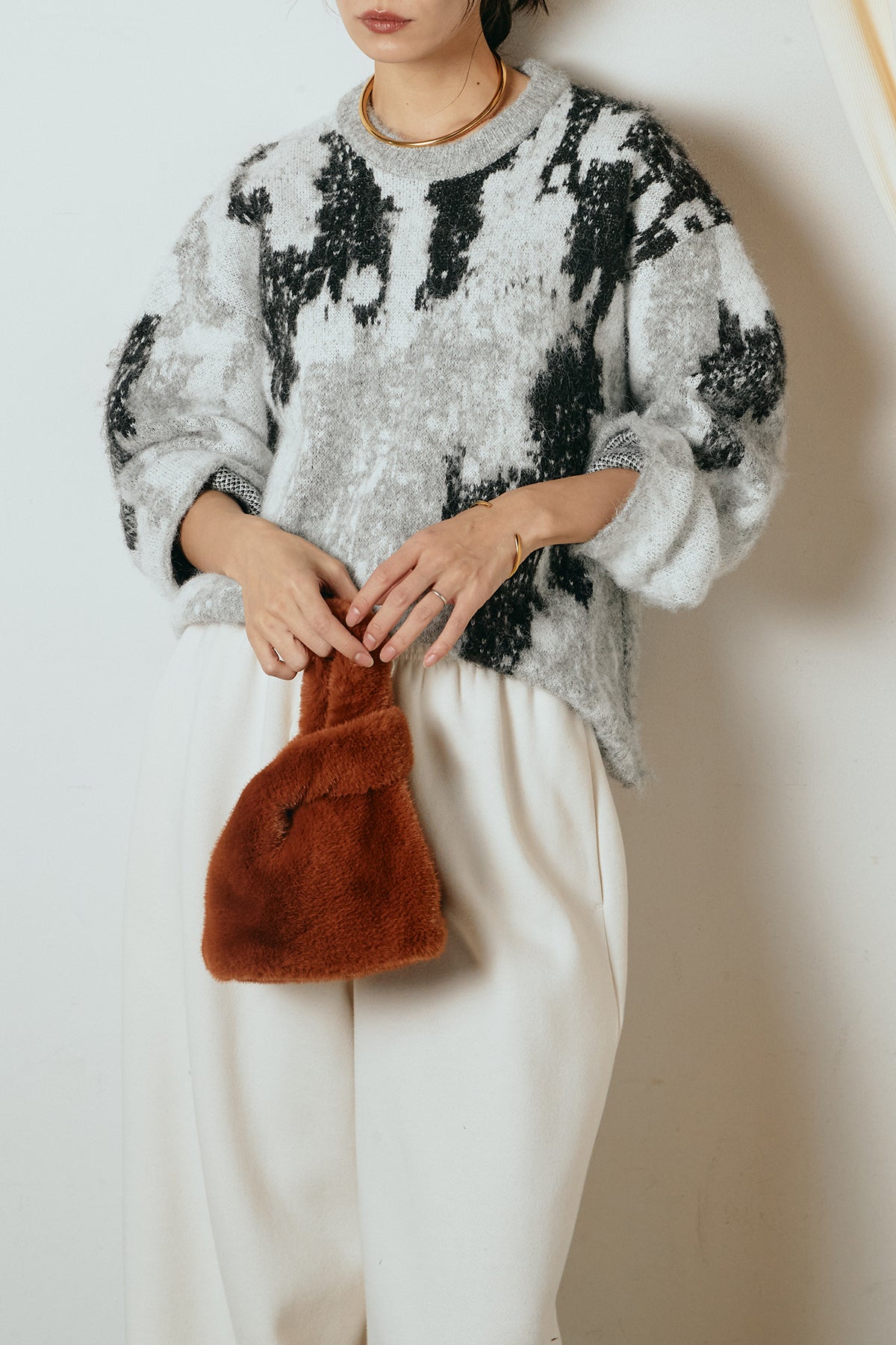 起毛感のある柔らかなニットに、ニュアンス柄をのせたデザイン性の高いプルオーバー。ランダムな柄の表情がシンプルなスタイリングに奥行きを与え、1枚で存在感のある着こなしが完成します。程よくゆとりのあるシルエットでリラックス感がありながら、バランスよくまとまるのも魅力。パンツにもスカートにも合わせやすく、季節感を取り入れたコーディネートが楽しめる一枚です。