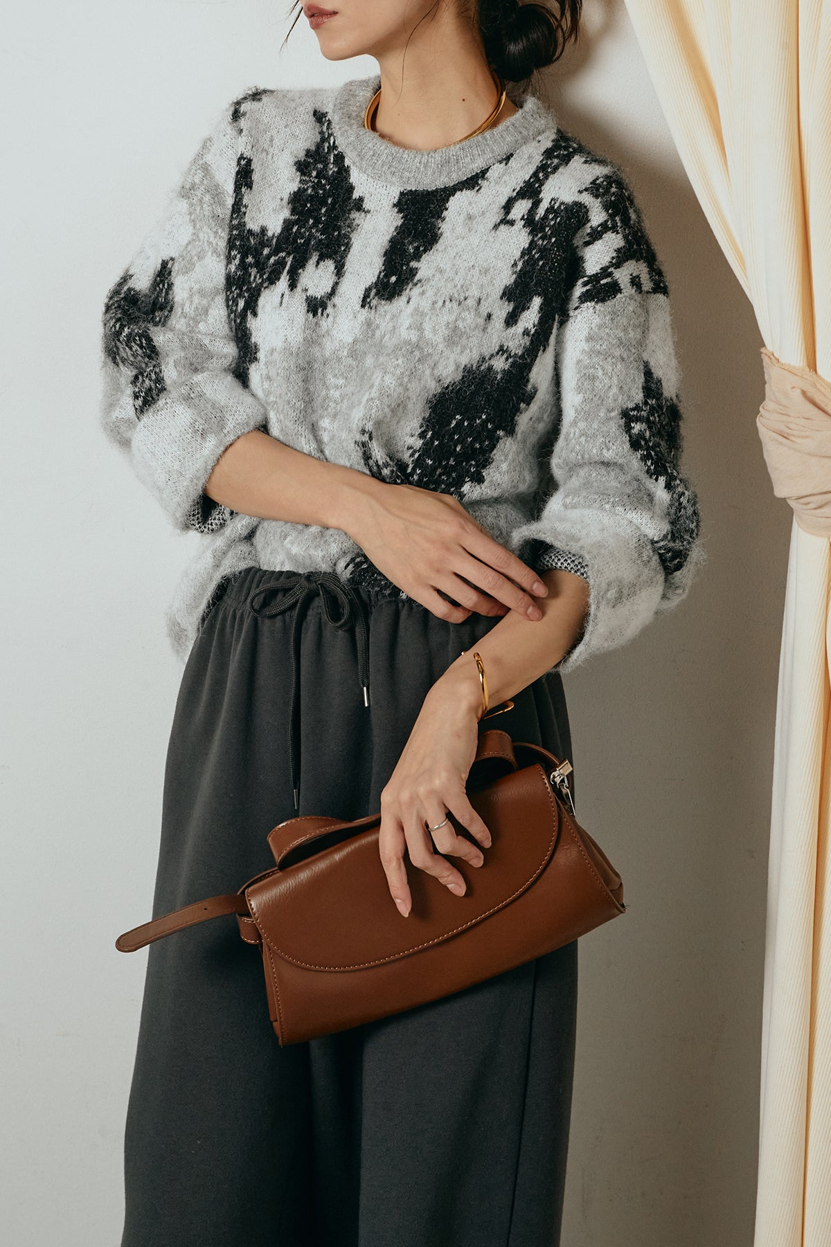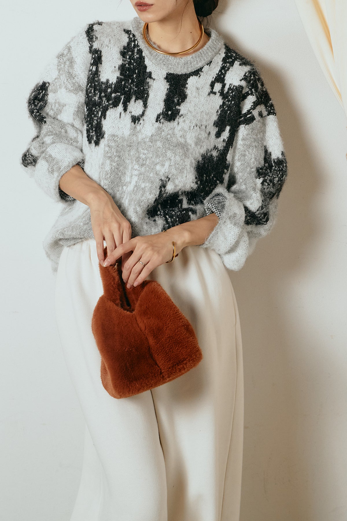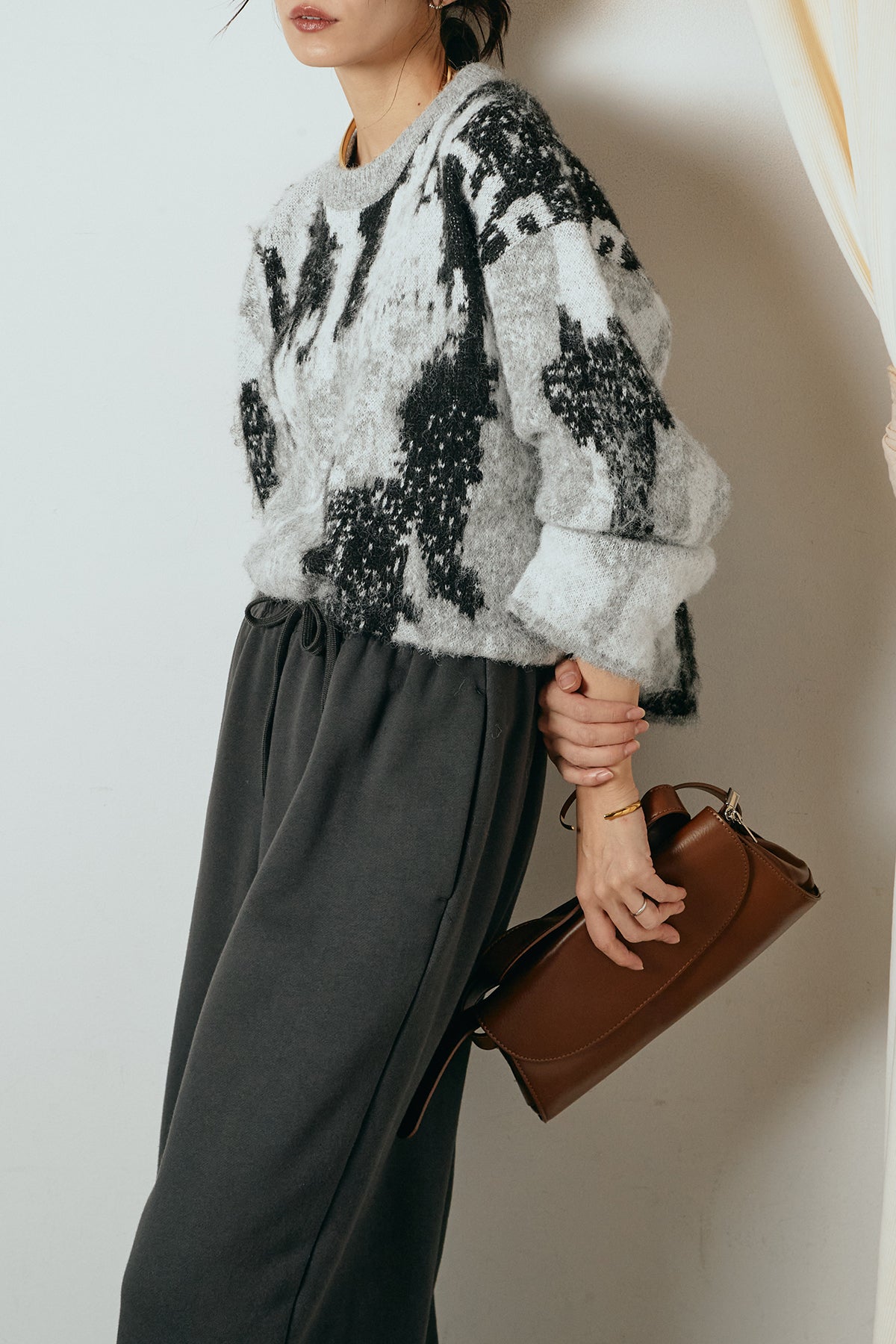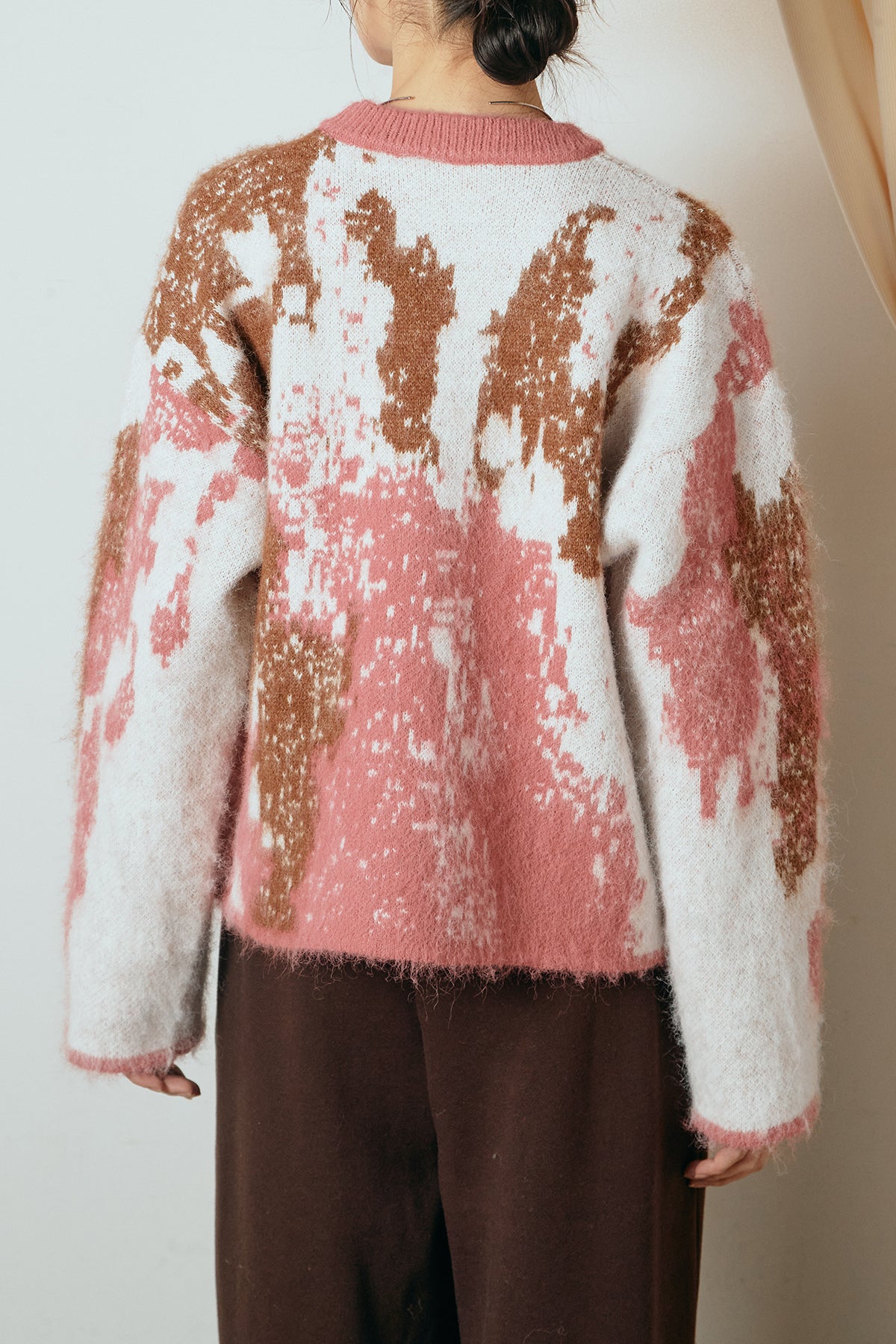 起毛感のある柔らかなニットに、ニュアンス柄をのせたデザイン性の高いプルオーバー。ランダムな柄の表情がシンプルなスタイリングに奥行きを与え、1枚で存在感のある着こなしが完成します。程よくゆとりのあるシルエットでリラックス感がありながら、バランスよくまとまるのも魅力。パンツにもスカートにも合わせやすく、季節感を取り入れたコーディネートが楽しめる一枚です。
