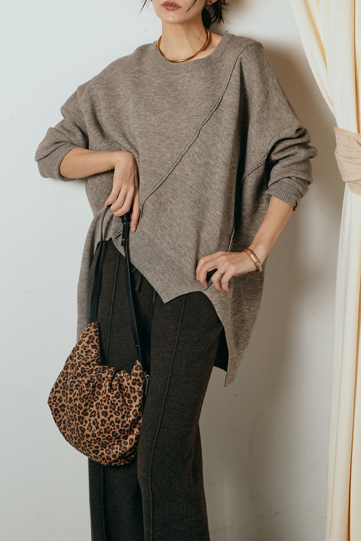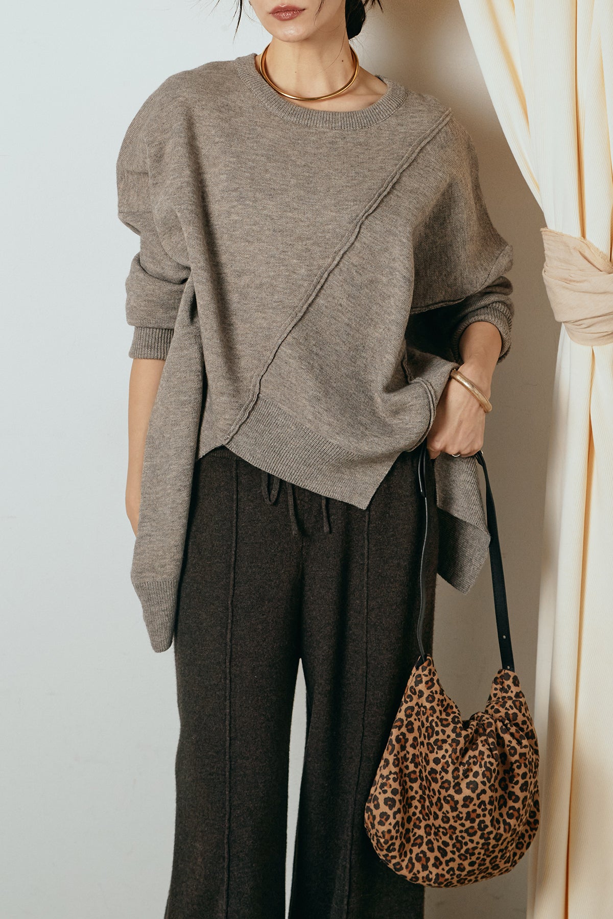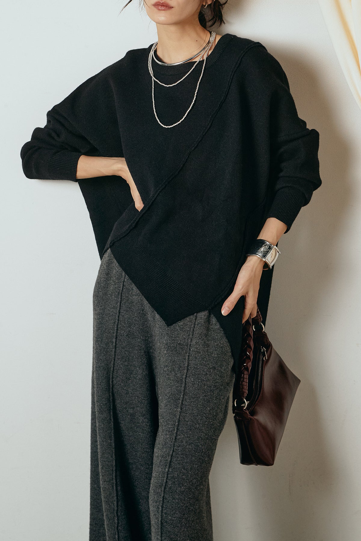 アシンメトリーな切り替えデザインが、さりげない個性を添えるニットトップス。斜めに入ったラインが動きを生み、シンプルな中にも立体感のある表情を演出します。程よくゆとりのあるシルエットで、リラックス感がありながらもすっきりとした印象に。パンツにもスカートにも合わせやすく、デイリーに取り入れやすい一枚です。