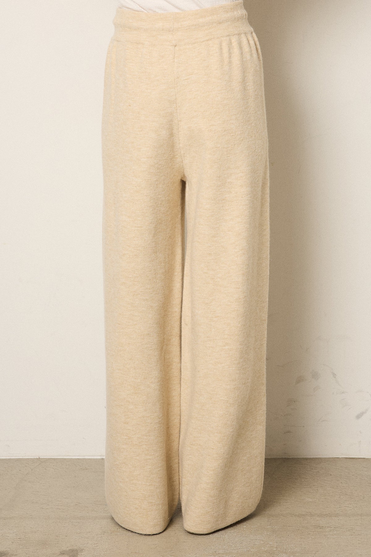 センターラインが入ったニット素材のパンツ。 縦のラインが強調され、すっきりとした印象で着用できます。 ウエストは紐仕様で、リラックス感がありつつ調整しやすいデザイン。 シンプルなトップス合わせでバランスが取りやすく、日常使いに活躍します。