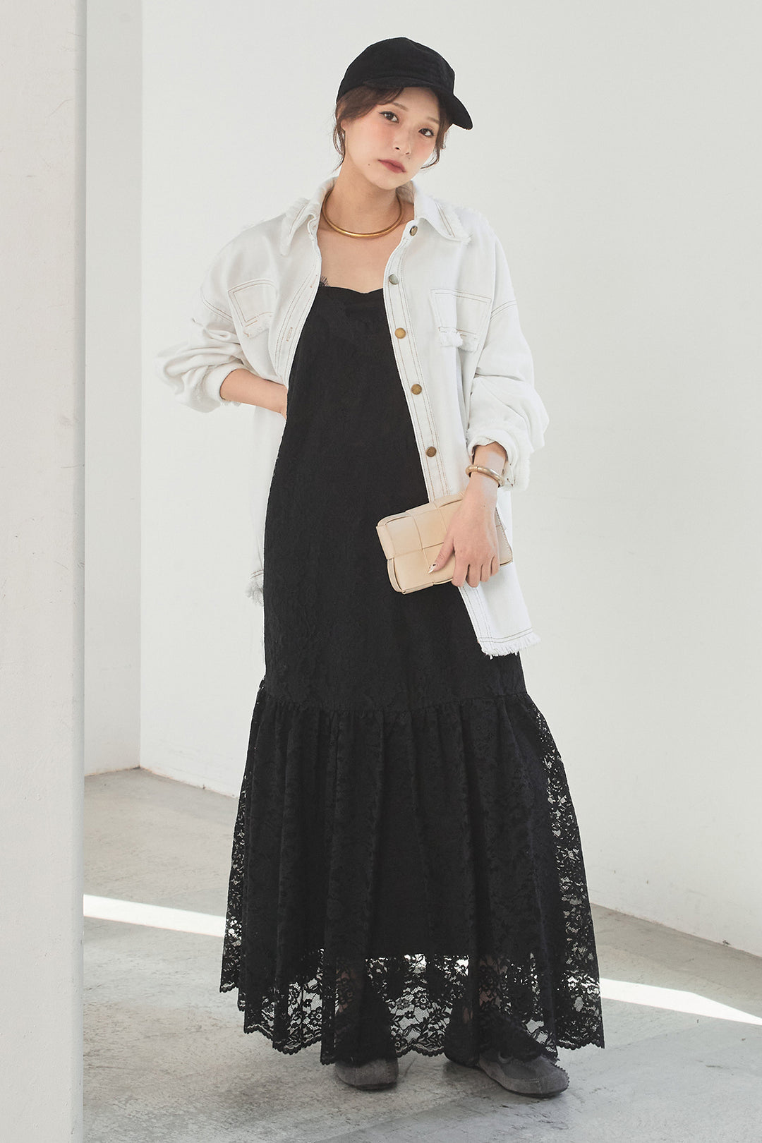 [SET]フリンジデニムジャケット+レース刺繍フレアキャミワンピース(2set)