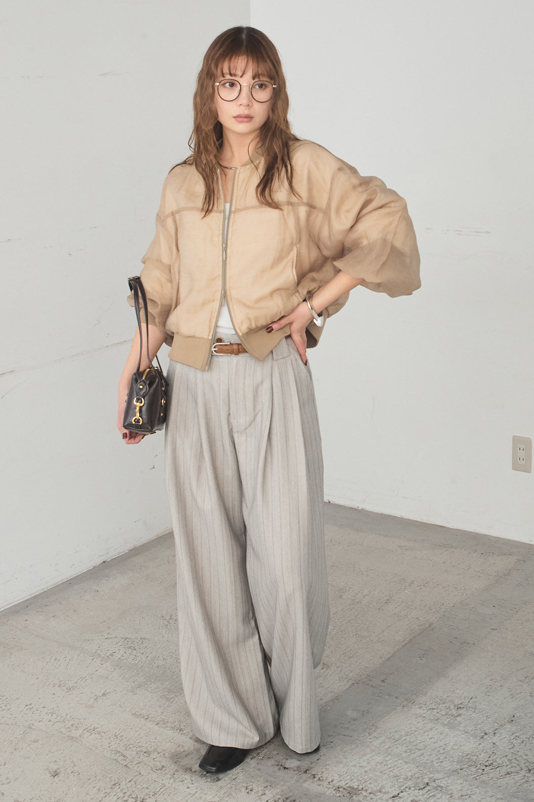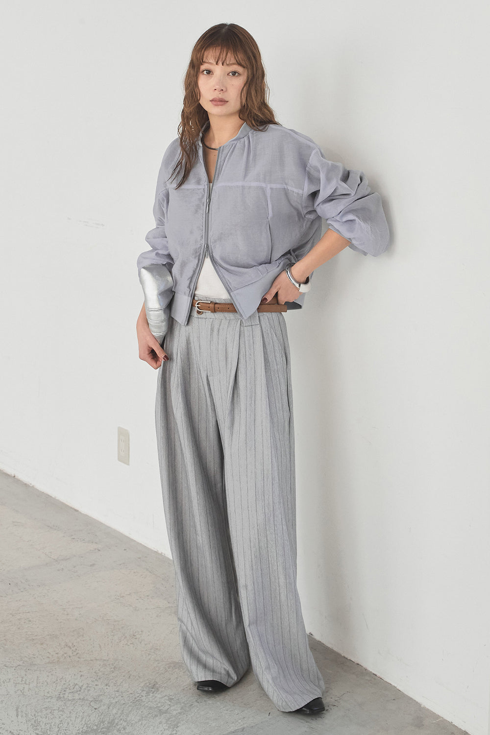 [SET]シアー×ポンチブルゾン+細ベルト付きピンストライプワイドパンツ(2set)