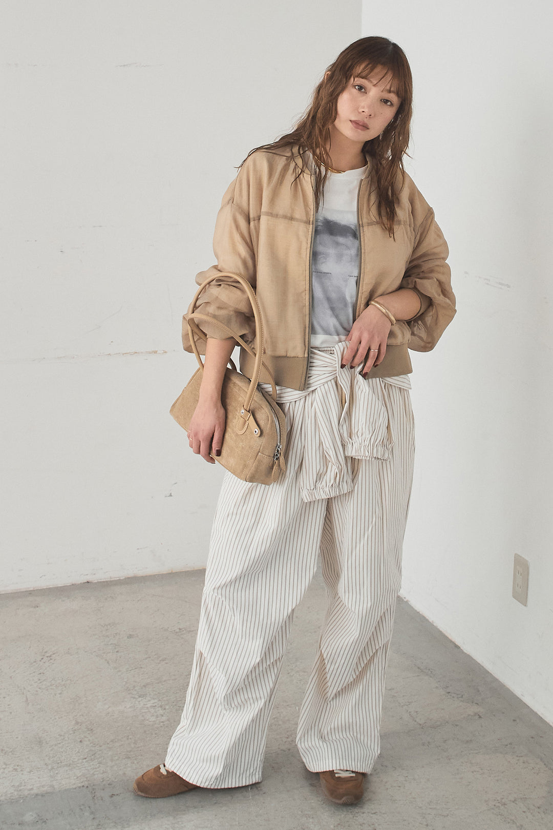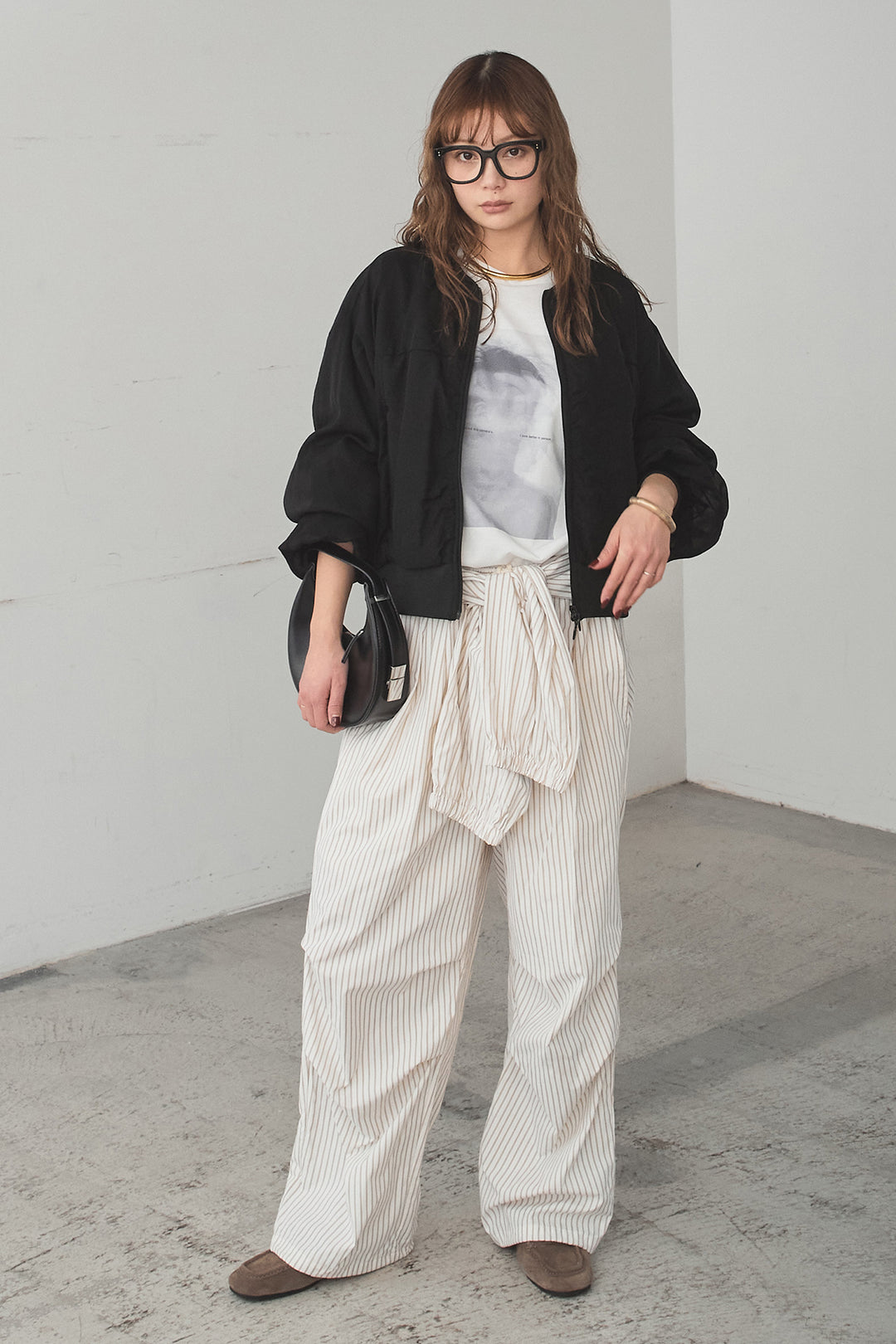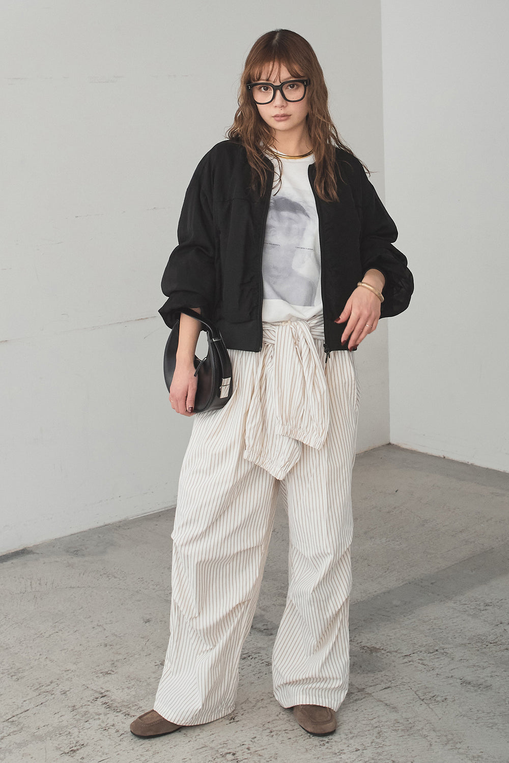 [SET]シアー×ポンチブルゾン+ストライプウエスト巻きジョガーパンツ+長袖アソートフォトTシャツ(3set)