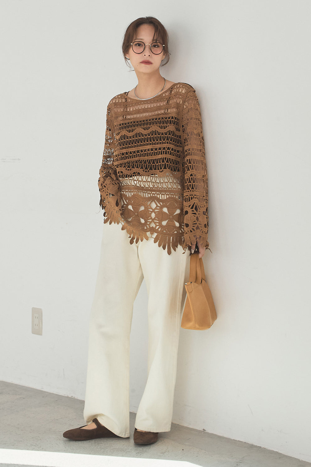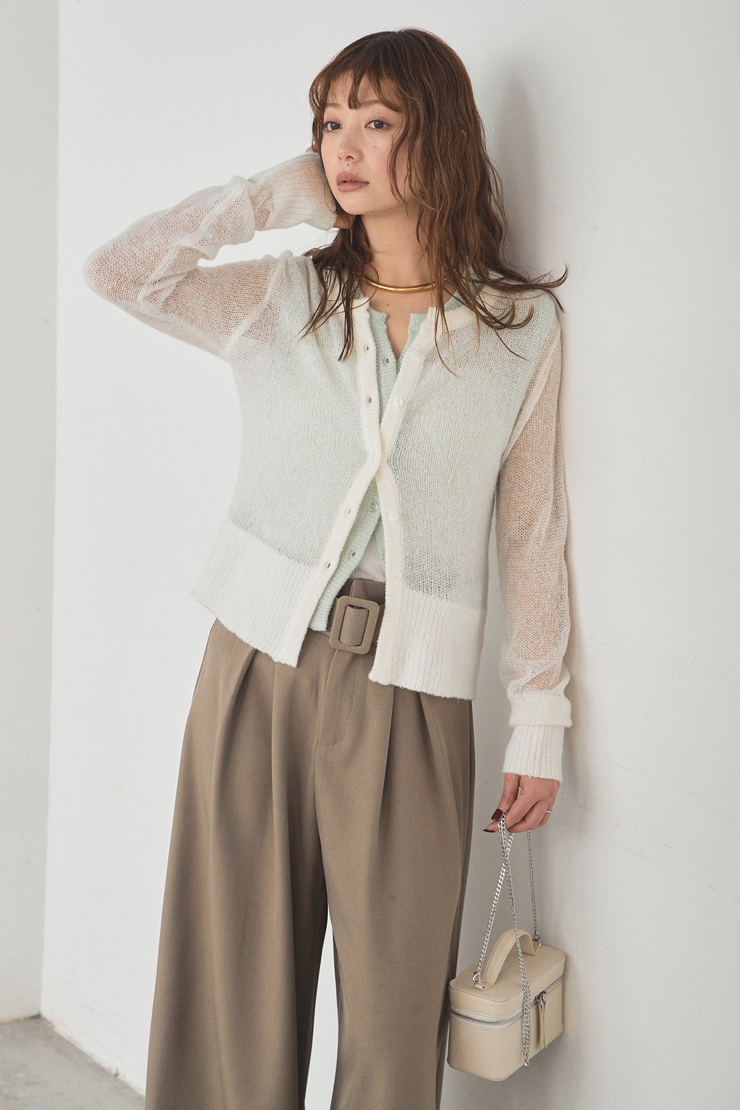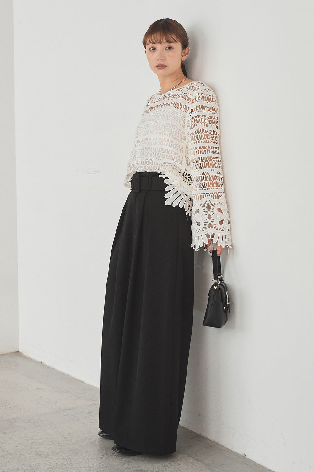 [SET]モヘア透かし編みレイヤードアンサンブルセット+ベルト付きツータックワイドパンツ(2set)