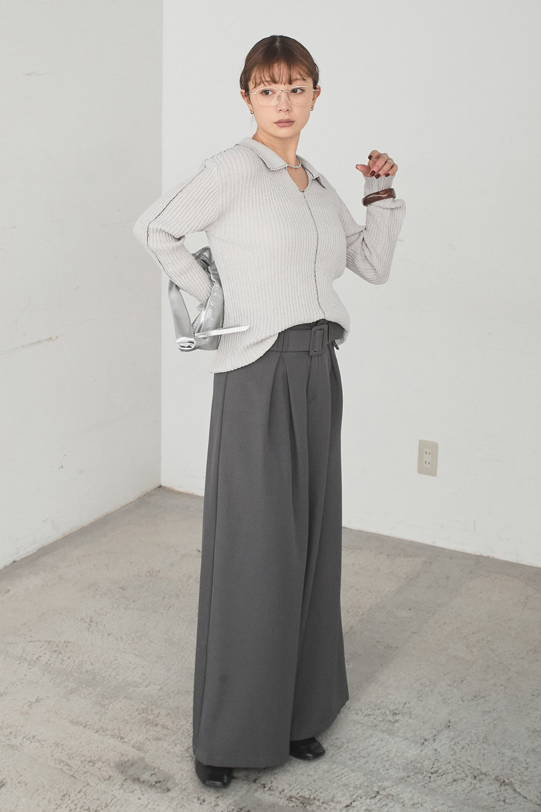[SET]衿付きニットプルオーバー+ベルト付きツータックワイドパンツ(2set)