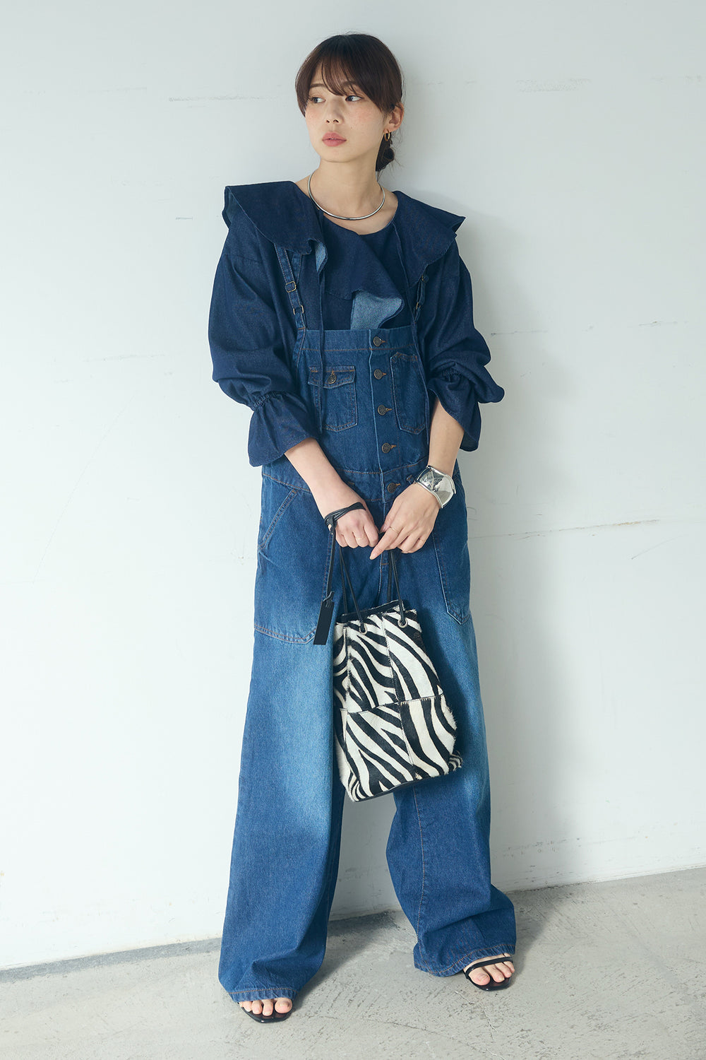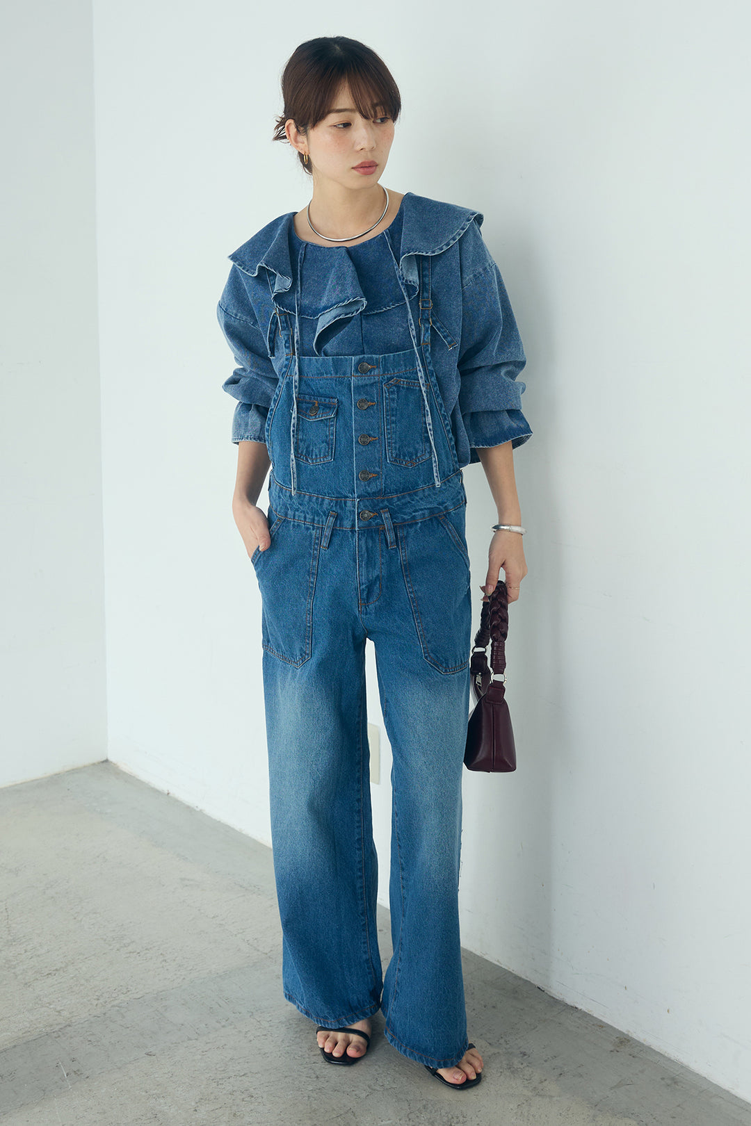 [SET]デニムフリルブラウス+デニムサロペットワイドパンツ(2set)