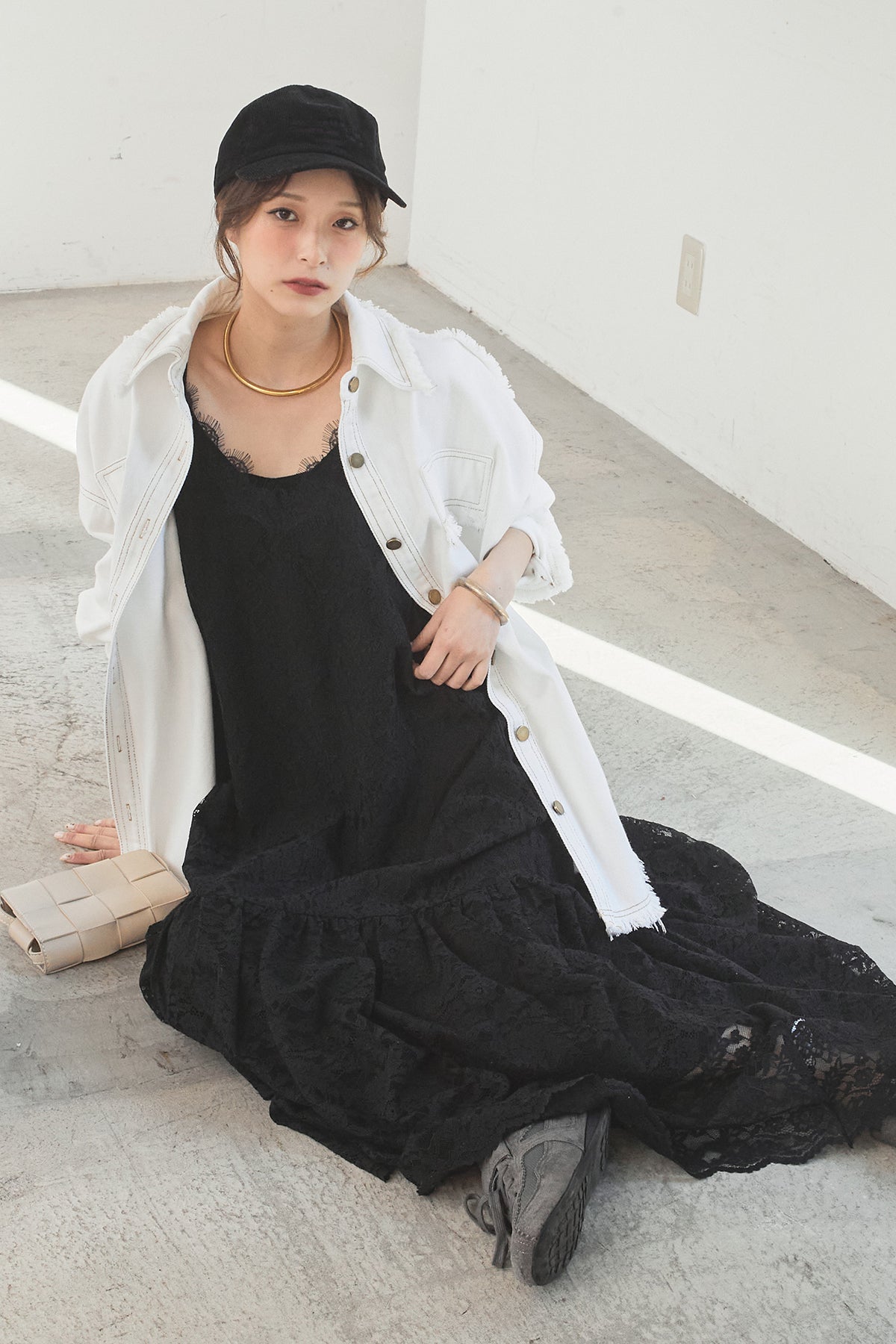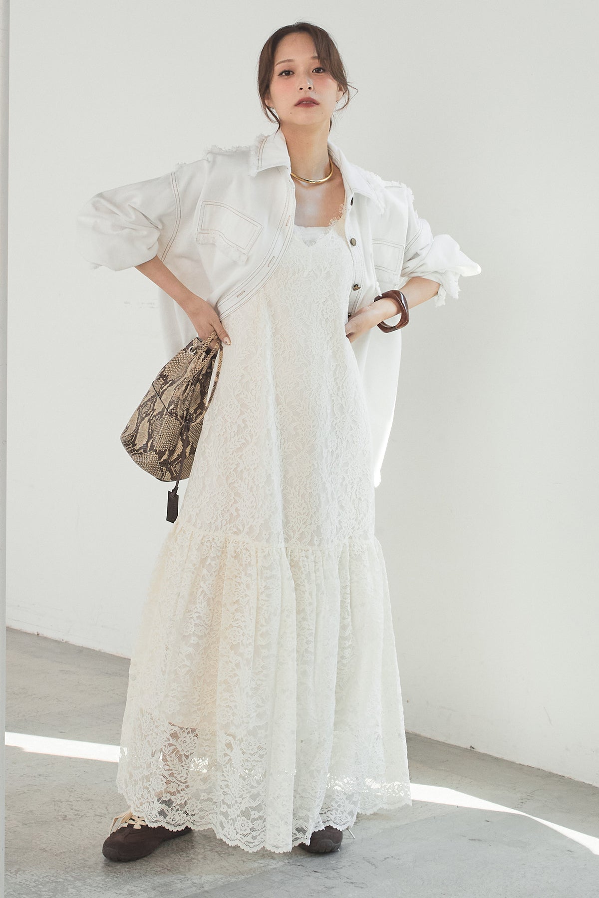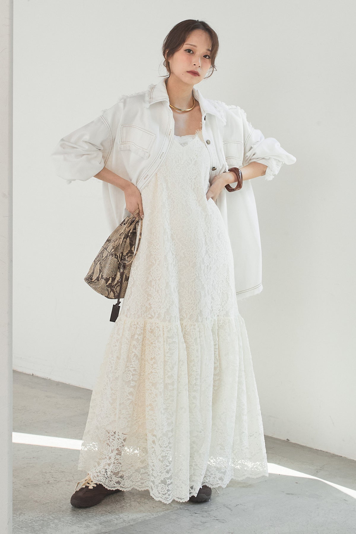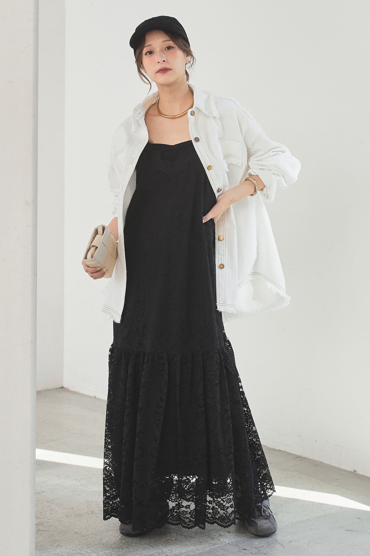 [SET]フリンジデニムジャケット+レース刺繍フレアキャミワンピース(2set)