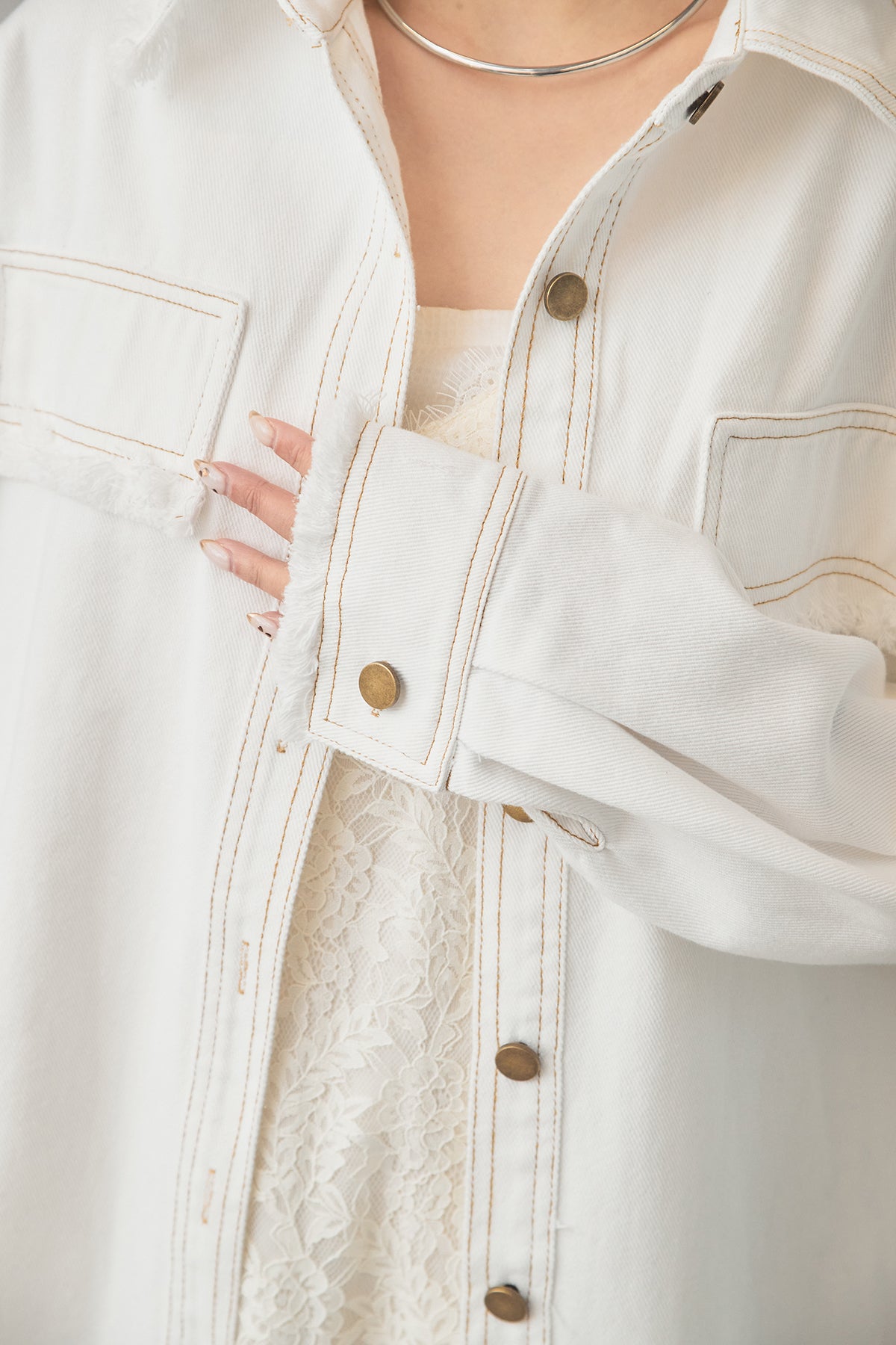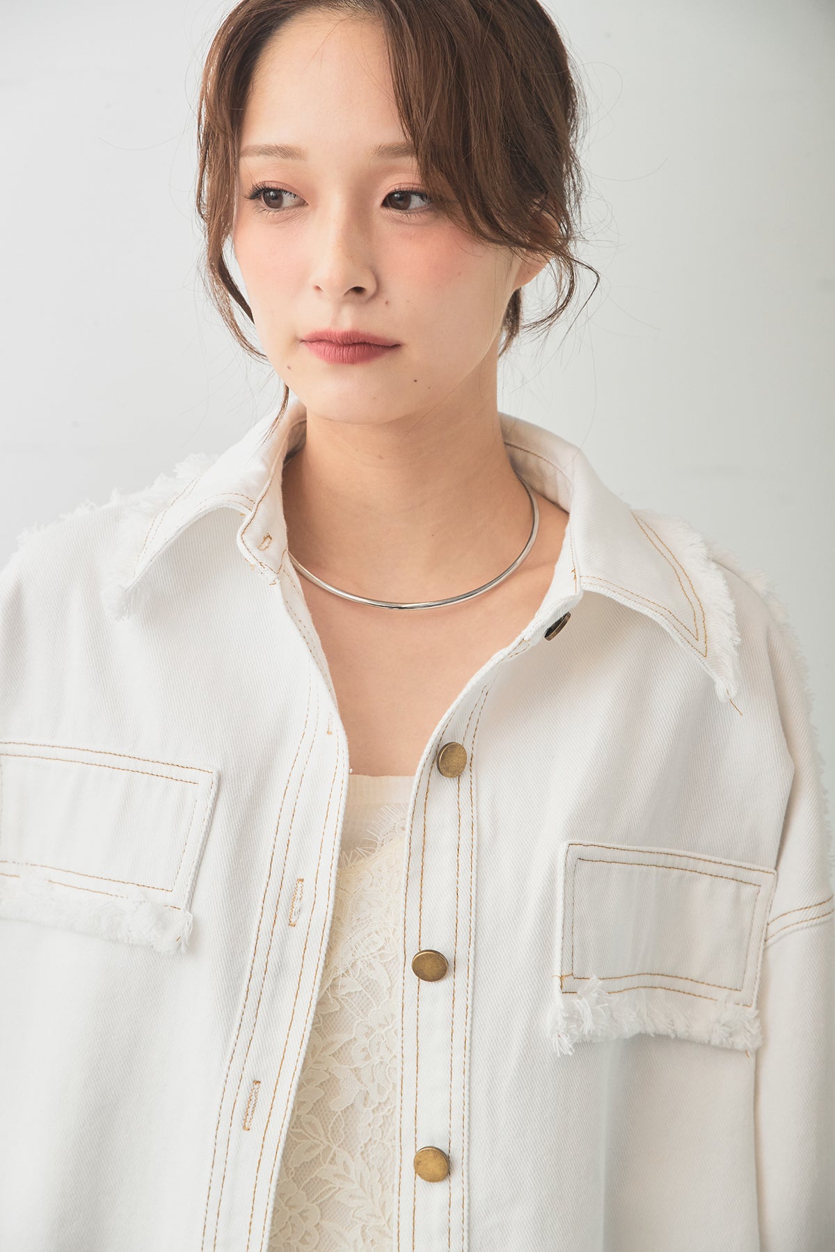 フリンジディテールがアクセントになったデニムジャケット。程よくハリのある素材感に、切りっぱなしのデザインを加えることで、ラフさの中に表情のある仕上がりに。ゆとりのあるシルエットで羽織りやすく、レイヤードスタイルにも自然に馴染みます。カジュアルながらも女性らしさを感じさせ、スタイリングに程よい抜け感をプラスしてくれる一着です。