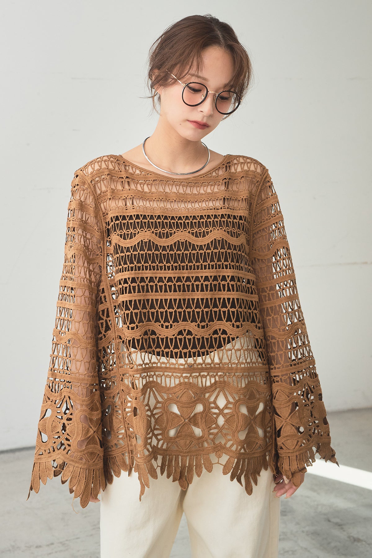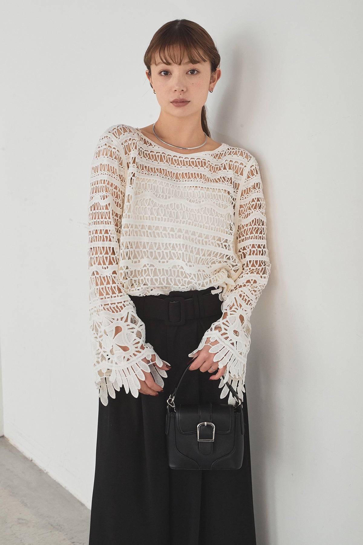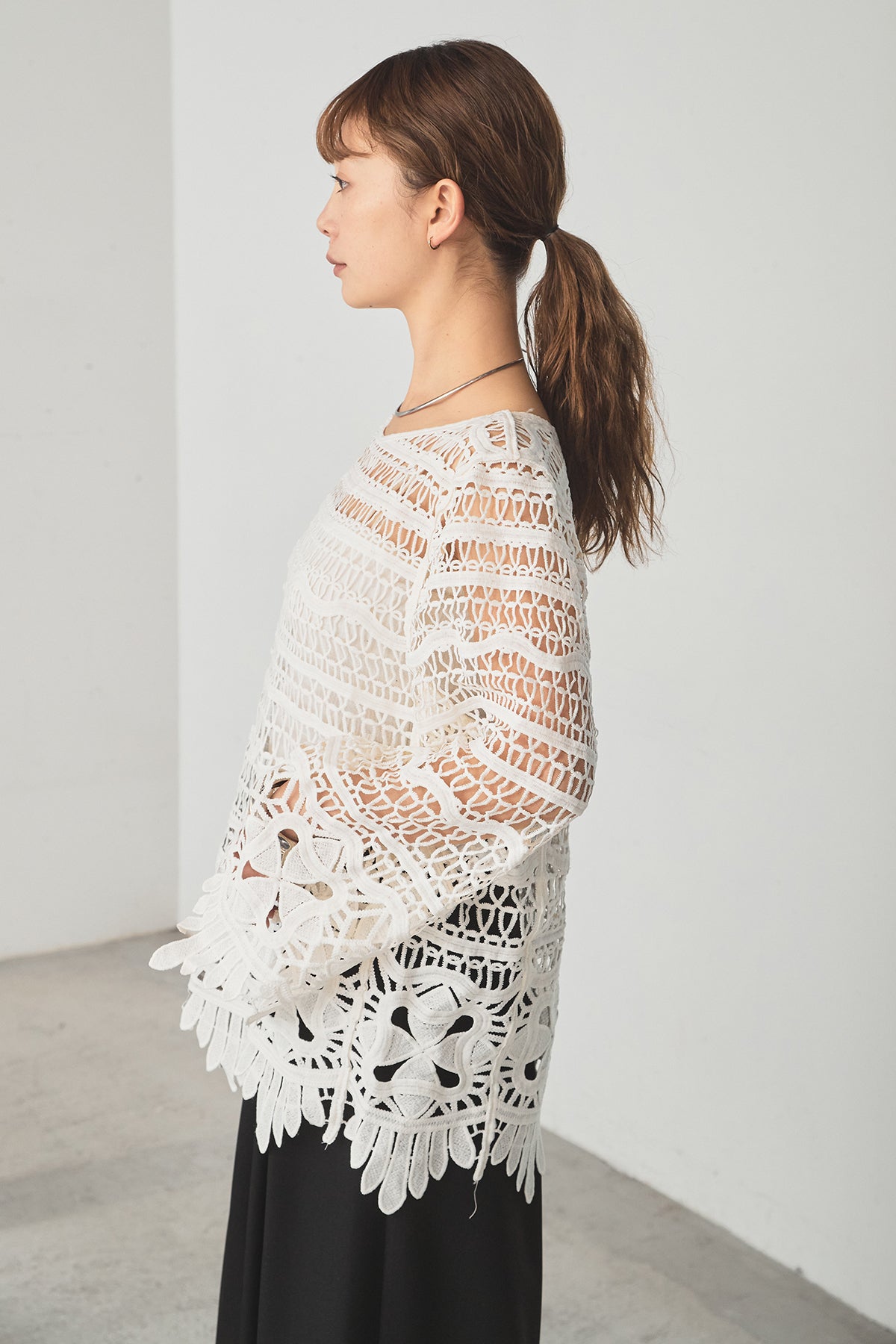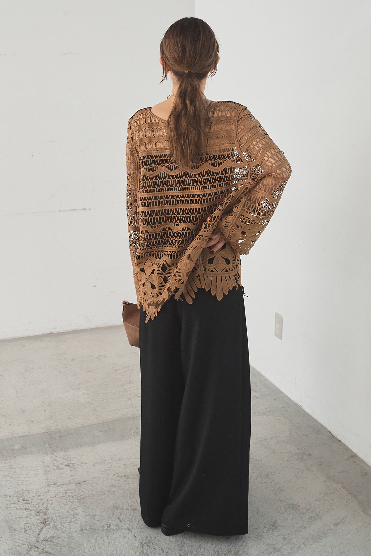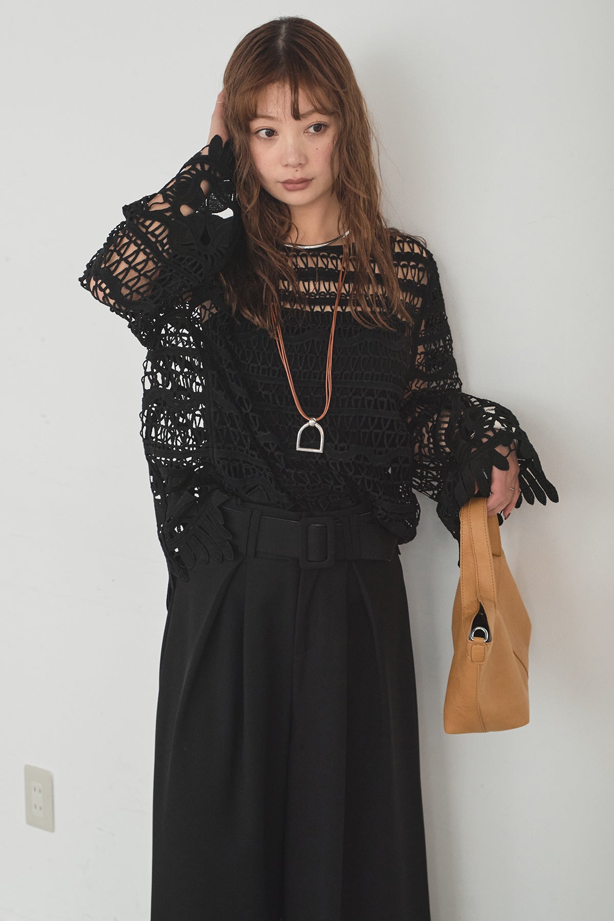 繊細なメッシュ素材に、裾のデザインを効かせたプルオーバー。透け感のある編み地が軽やかな印象を与え、スタイリングに抜け感と奥行きをプラスします。裾部分の切り替えデザインがさりげないアクセントとなり、一枚で着映えする仕上がりに。インナーとのレイヤードを楽しみながら、パンツにもスカートにも合わせやすいアイテムです。
