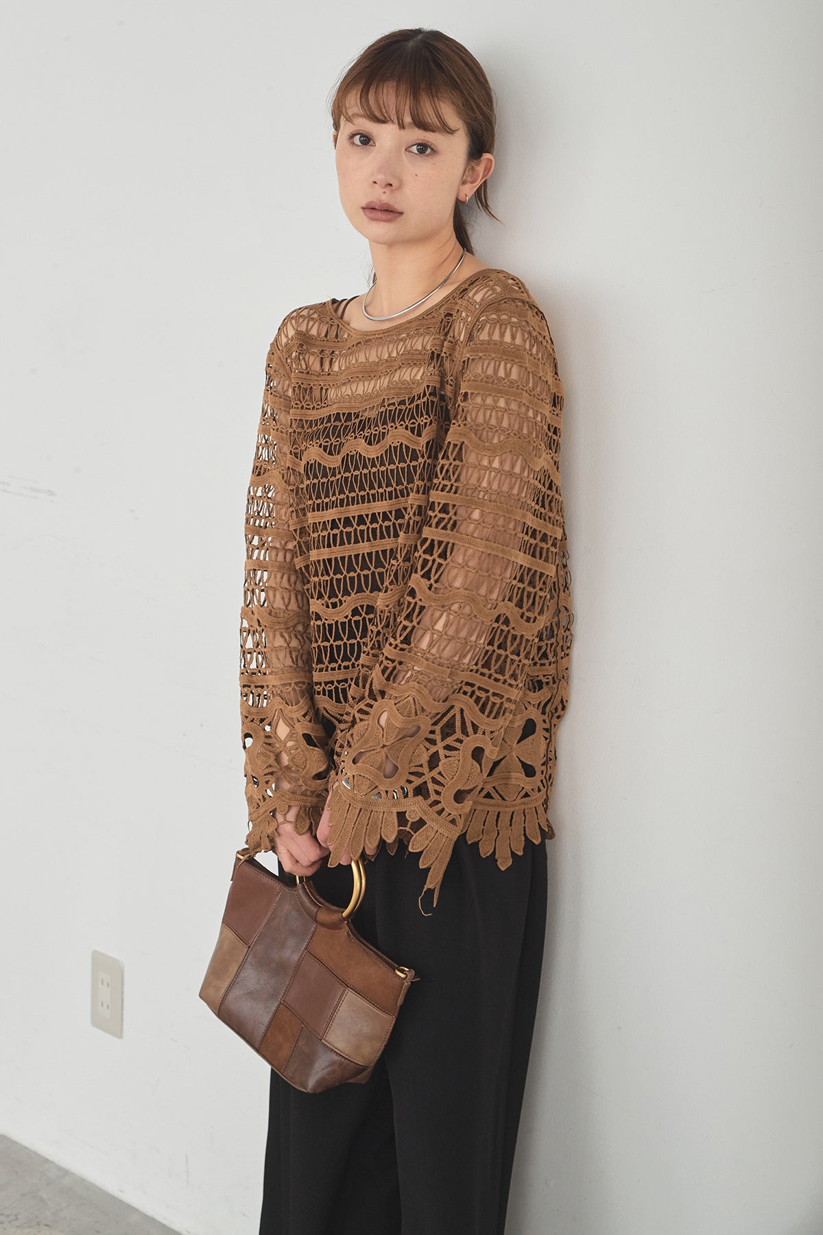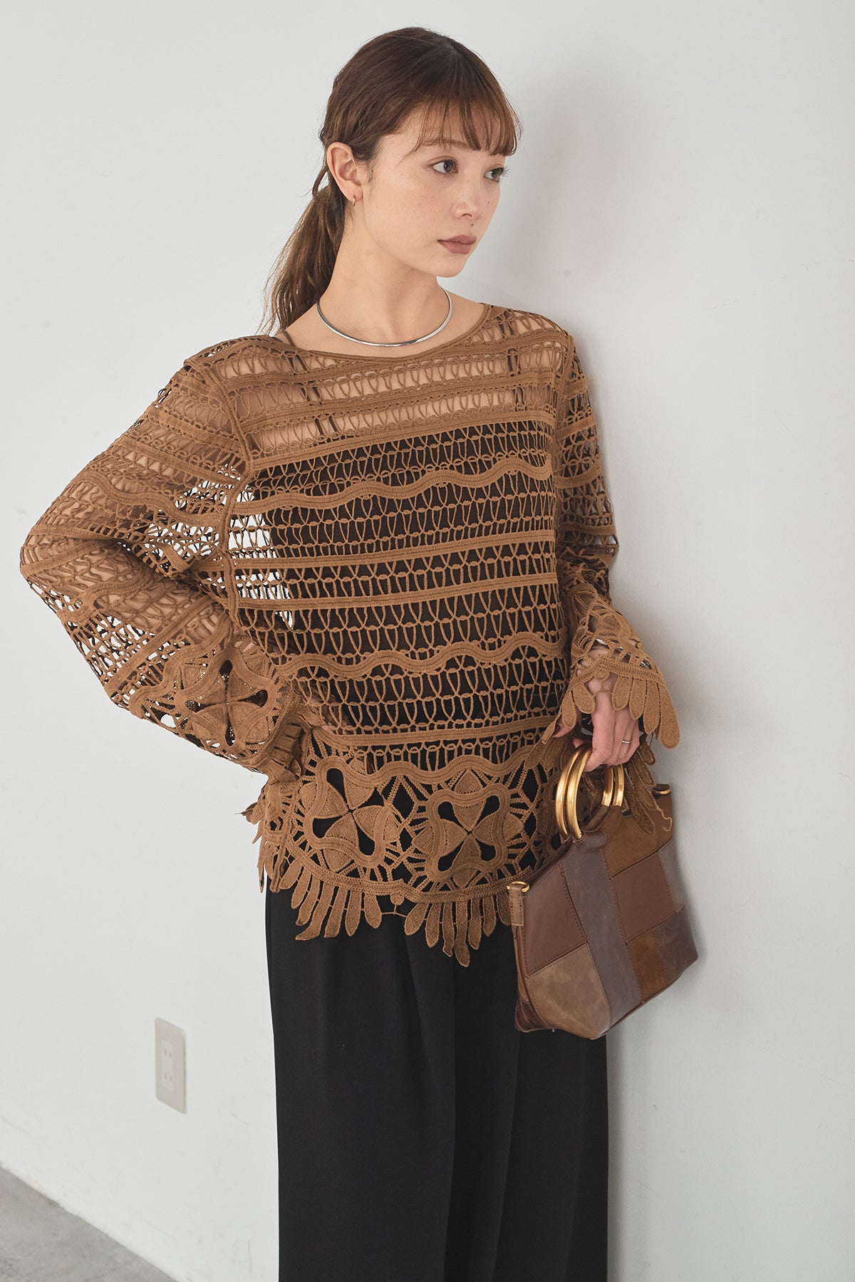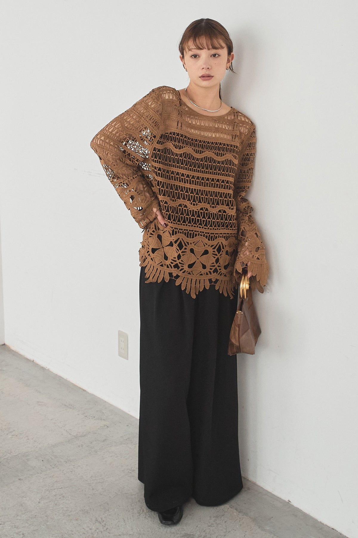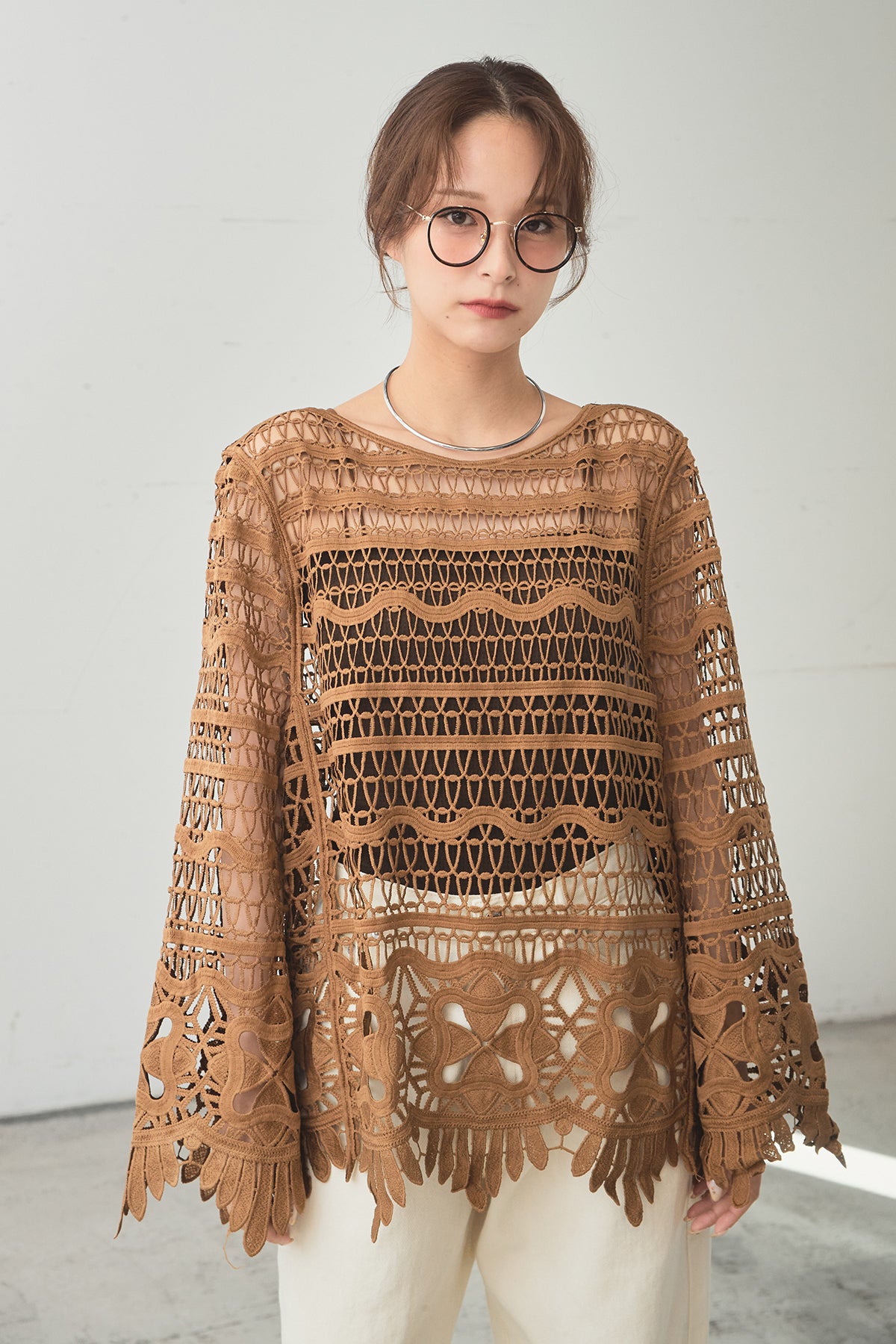 繊細なメッシュ素材に、裾のデザインを効かせたプルオーバー。透け感のある編み地が軽やかな印象を与え、スタイリングに抜け感と奥行きをプラスします。裾部分の切り替えデザインがさりげないアクセントとなり、一枚で着映えする仕上がりに。インナーとのレイヤードを楽しみながら、パンツにもスカートにも合わせやすいアイテムです。
