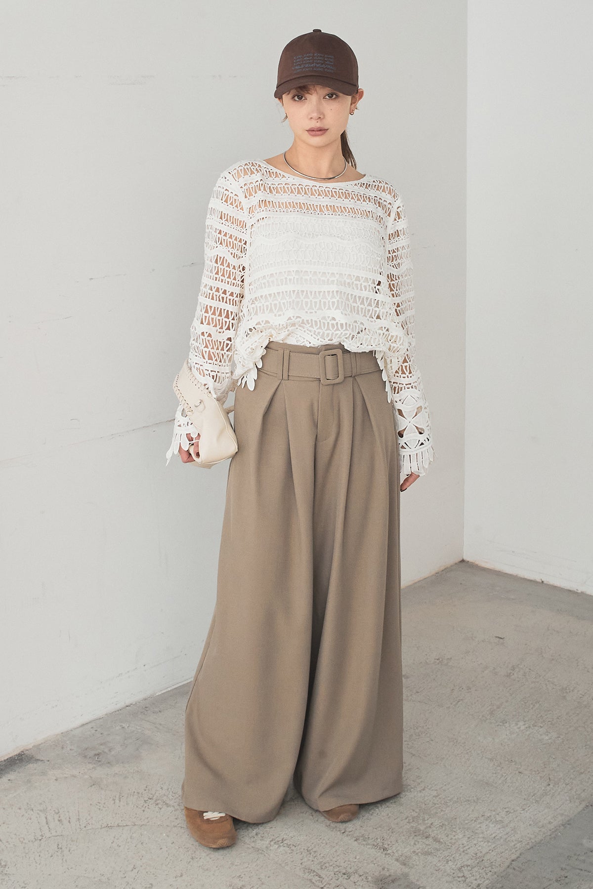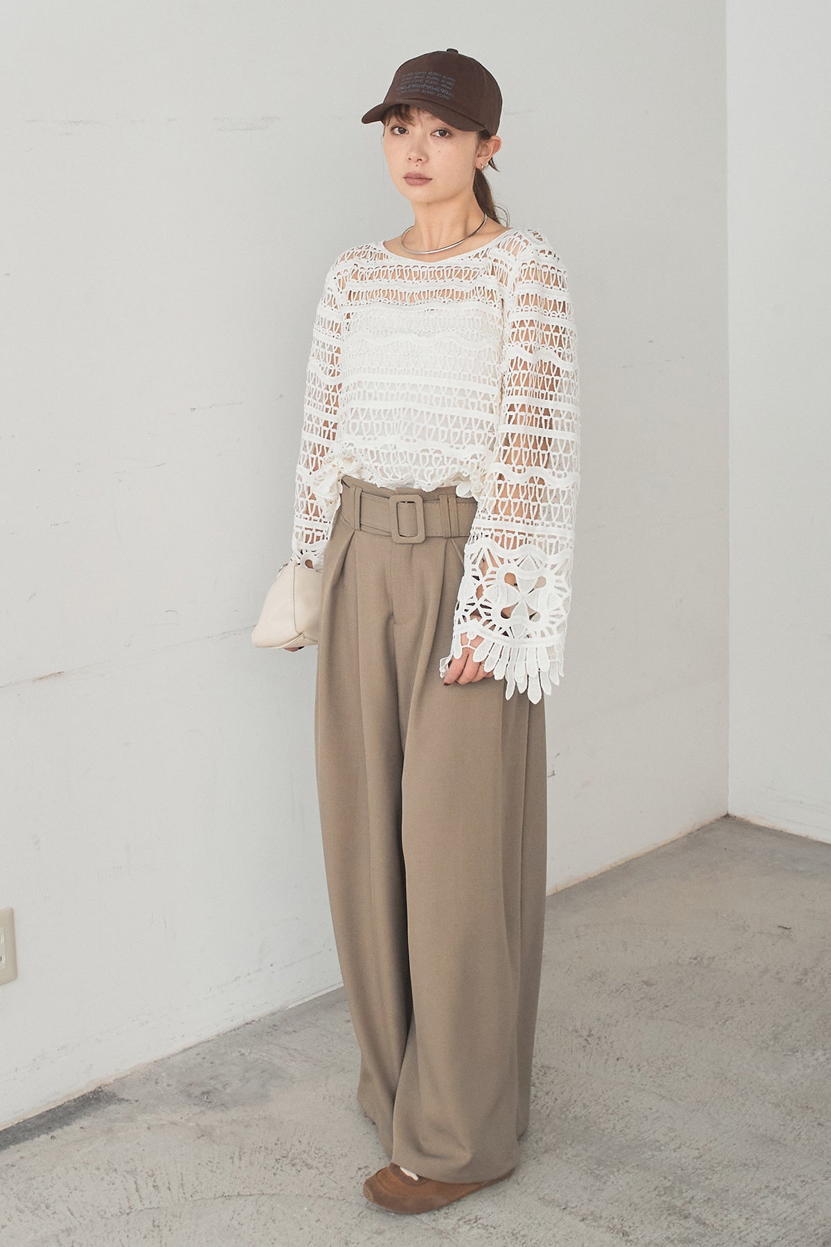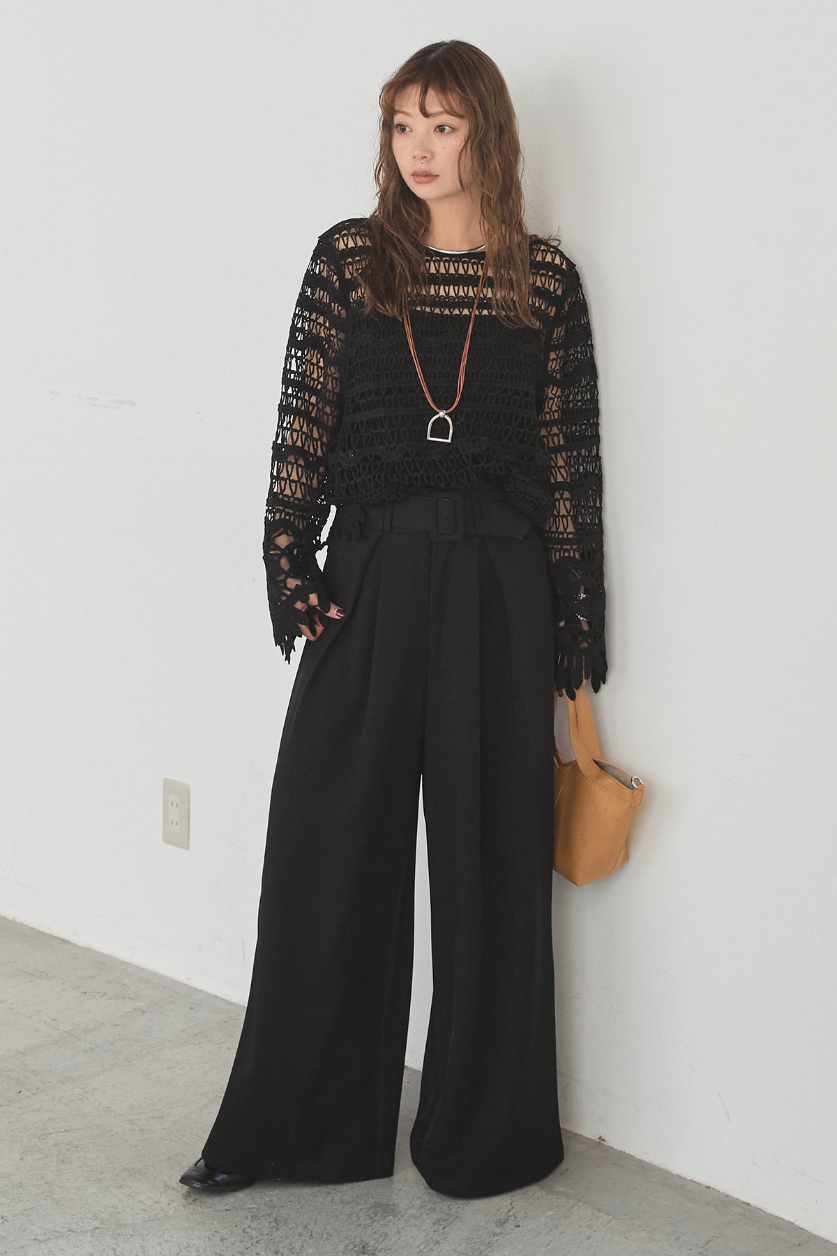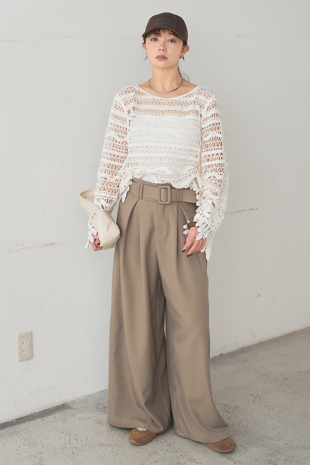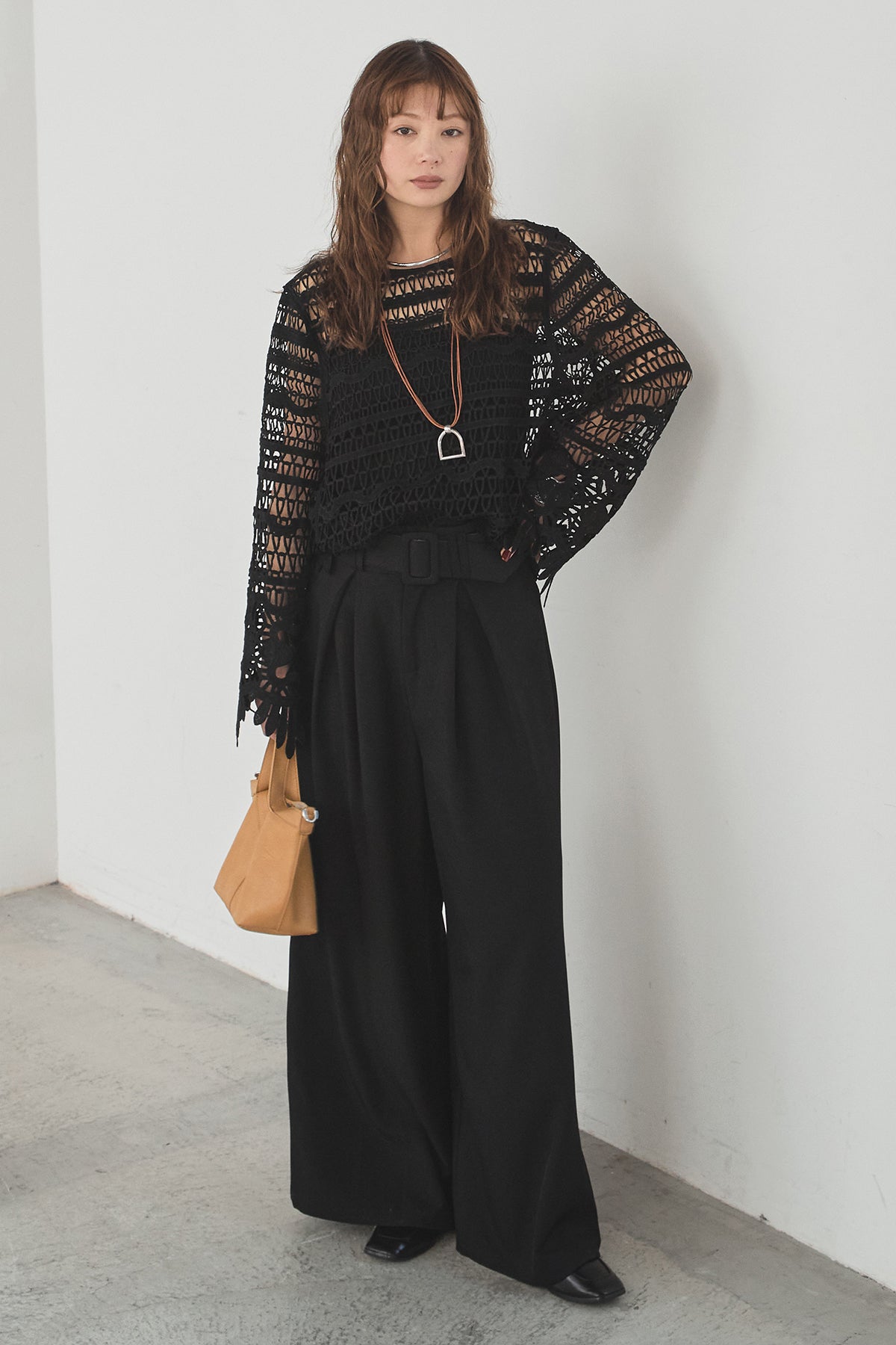 [SET]裾デザインメッシュプルオーバー+ベルト付きツータックワイドパンツ(2set)