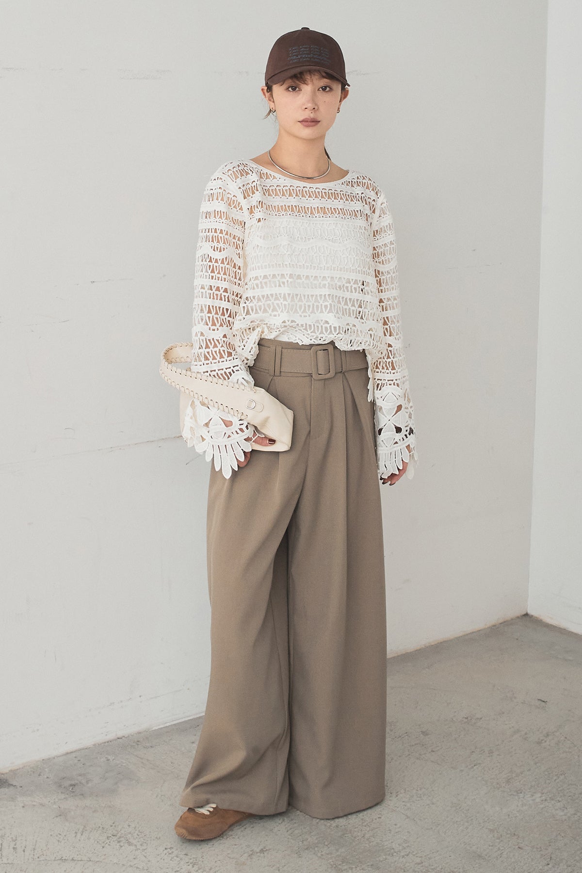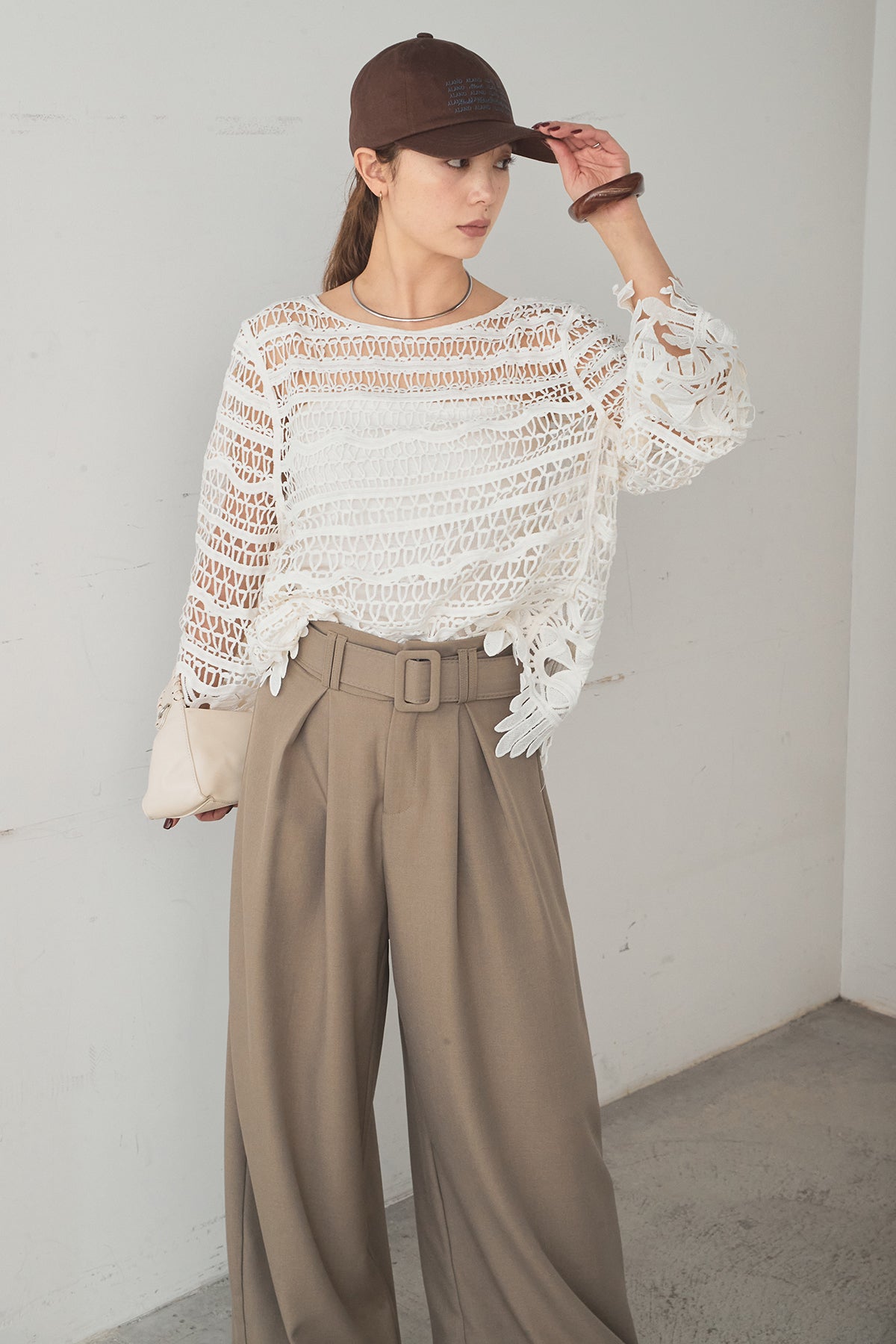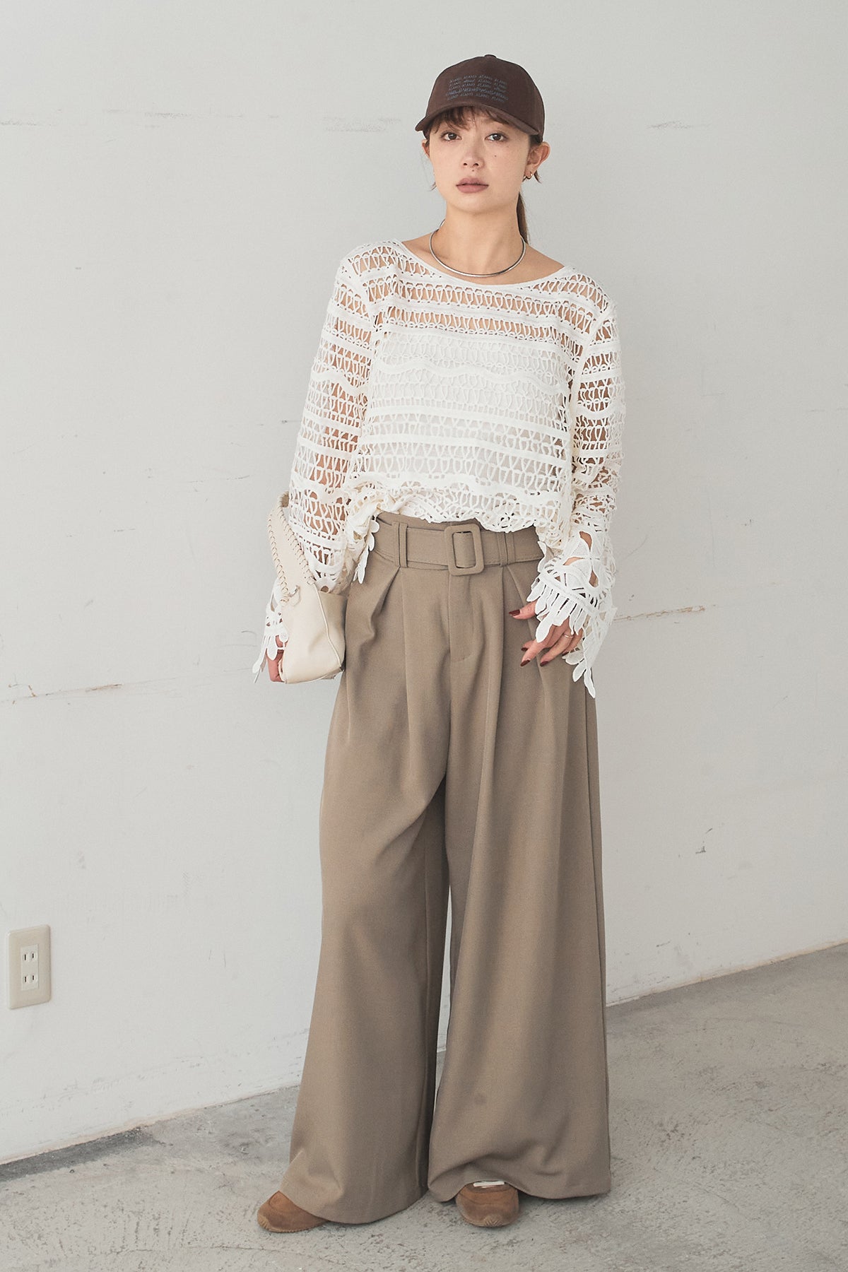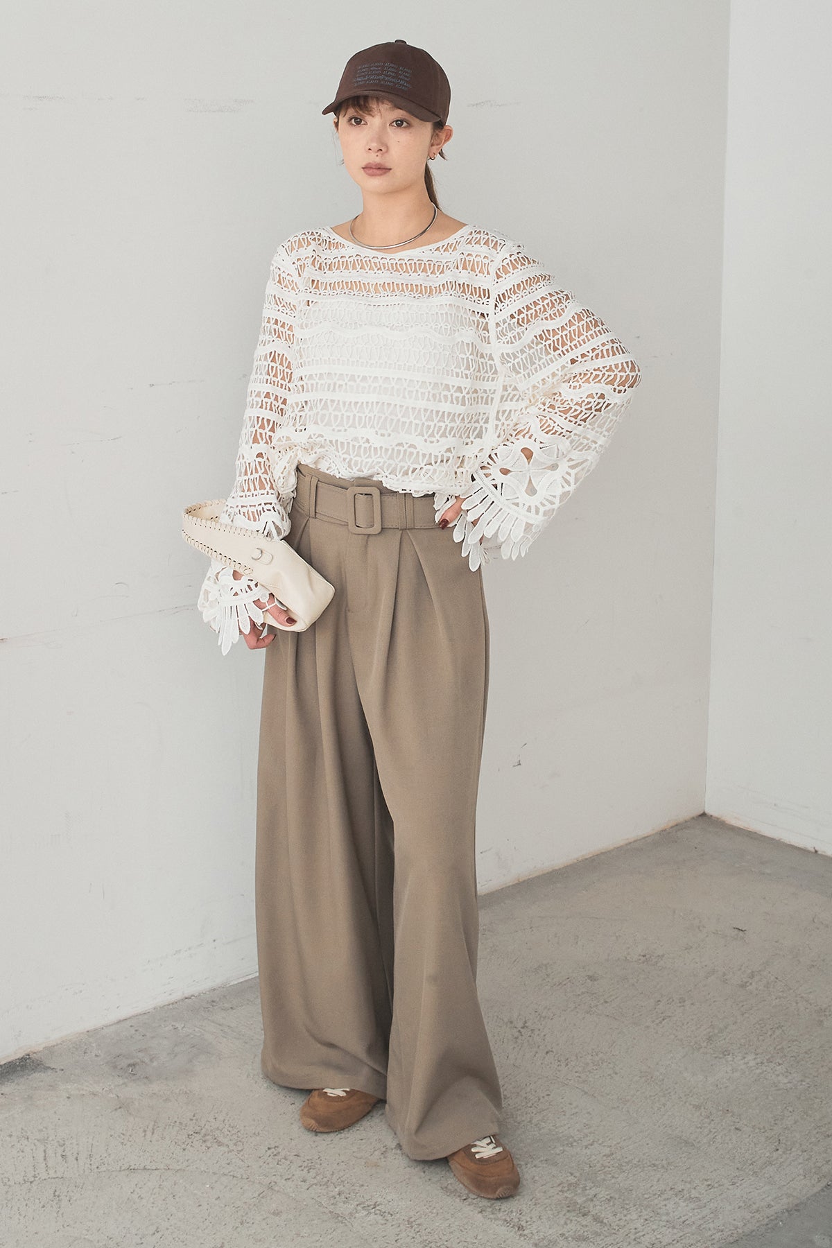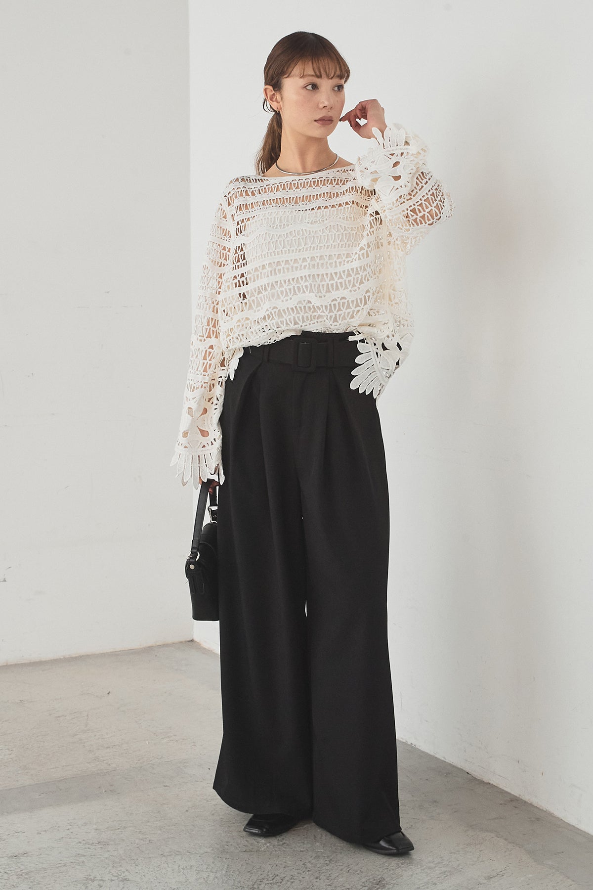[SET]裾デザインメッシュプルオーバー+ベルト付きツータックワイドパンツ(2set)