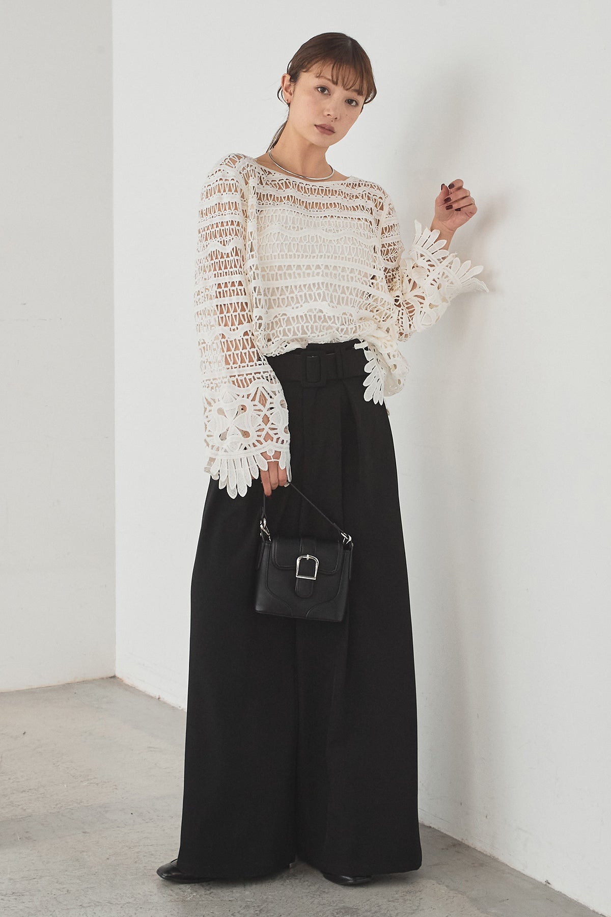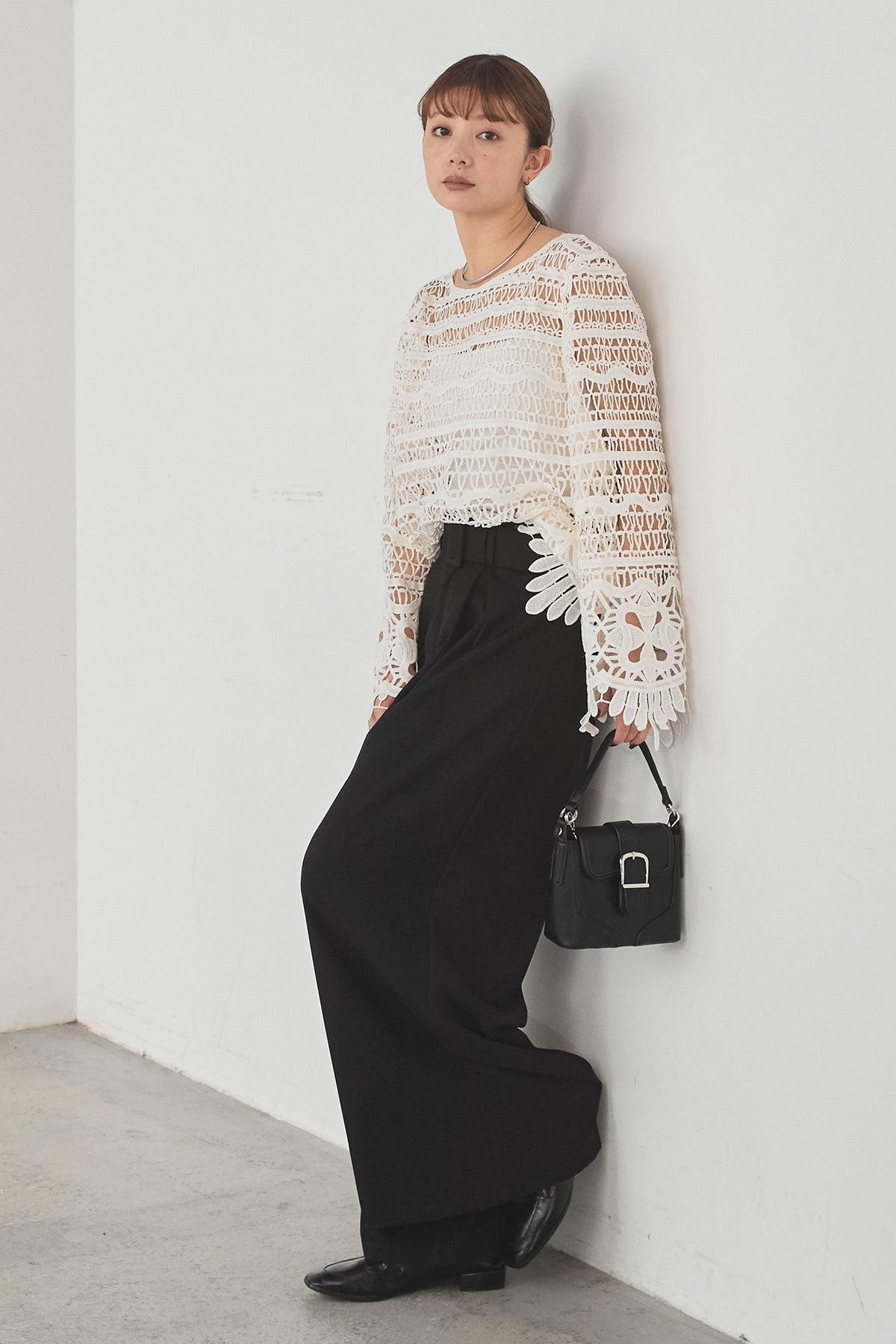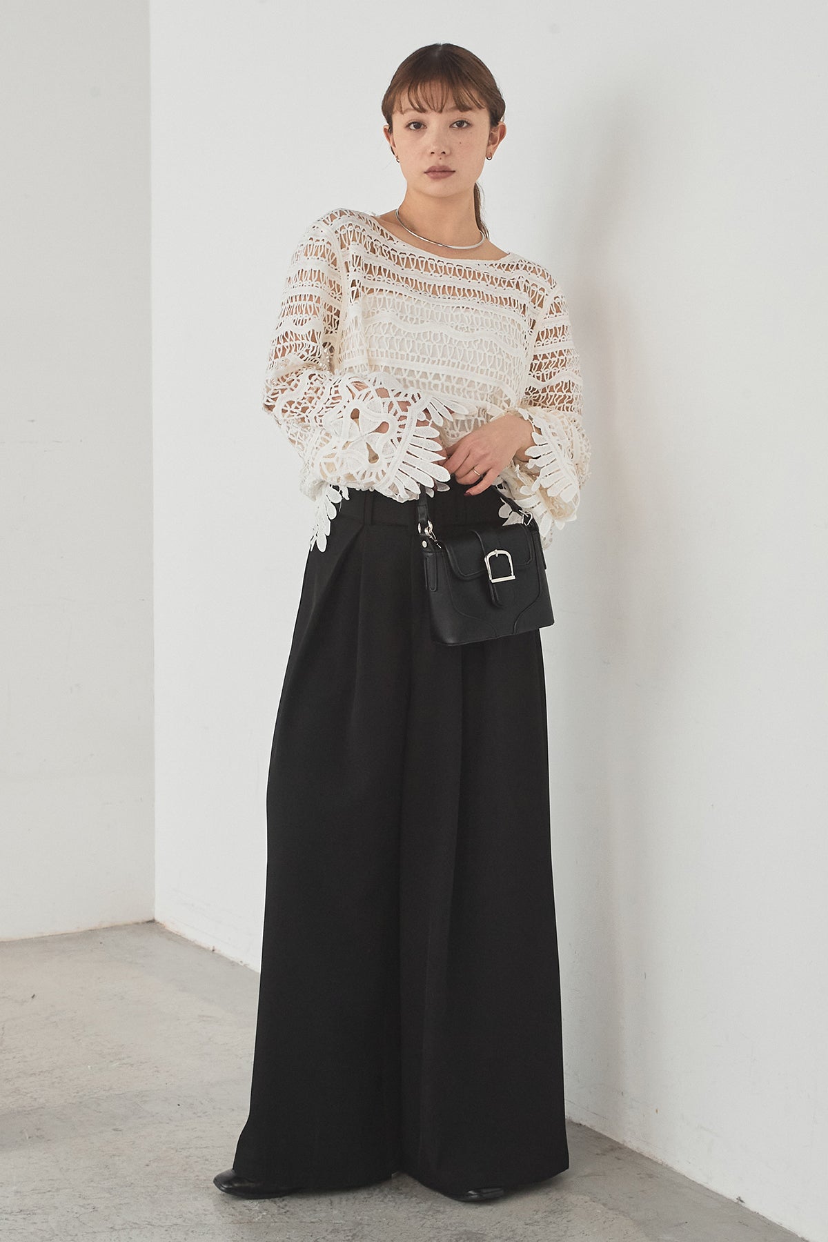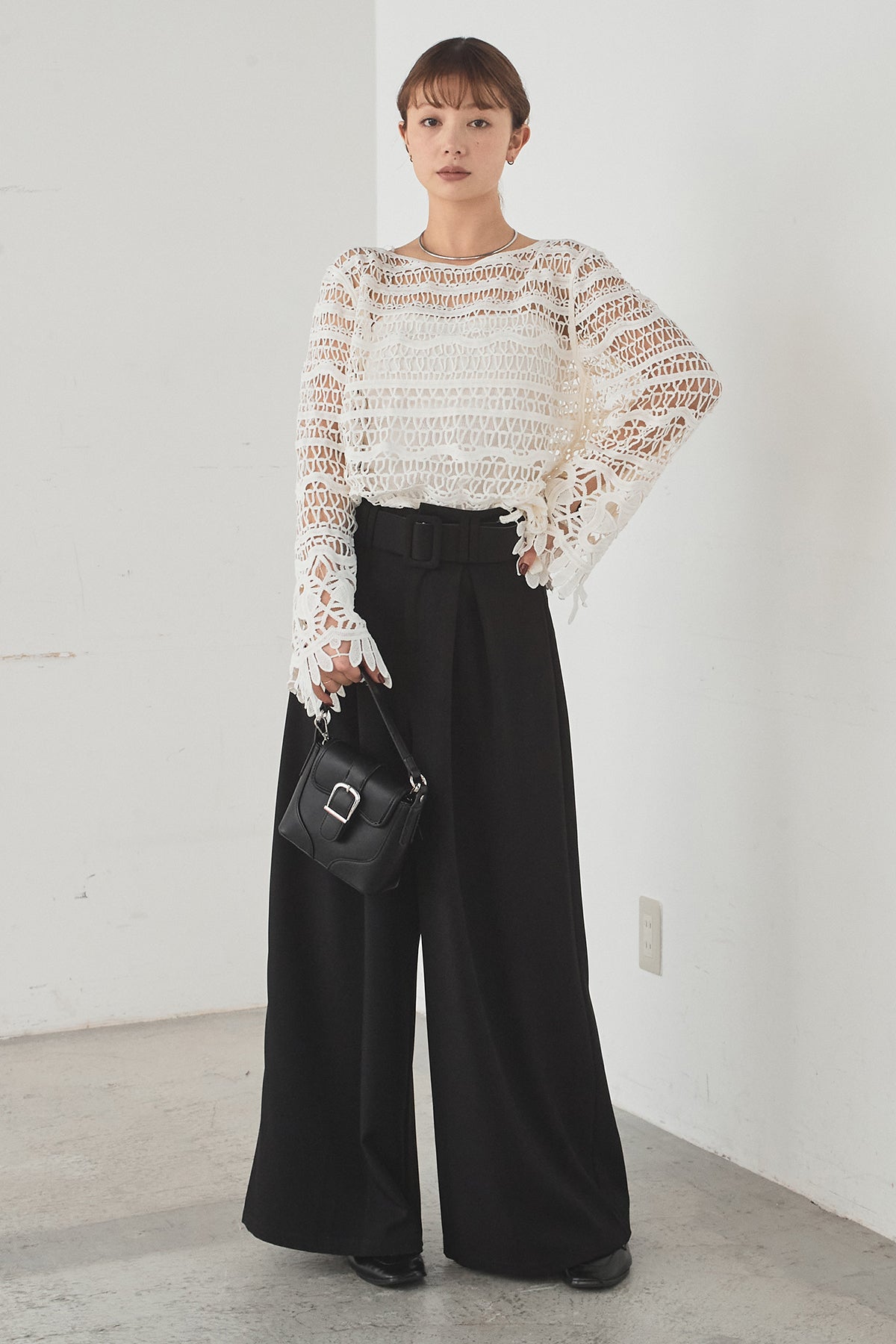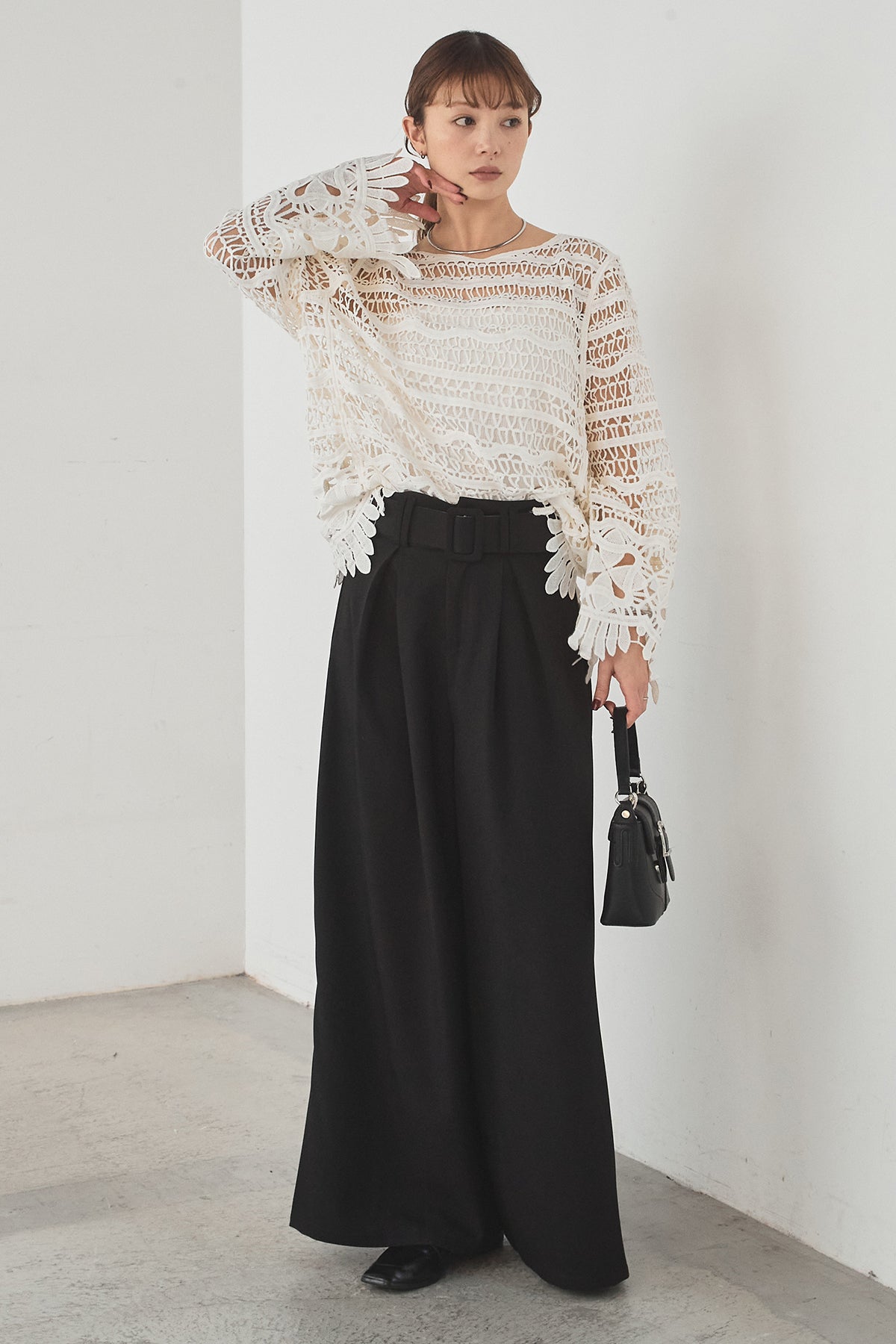 [SET]裾デザインメッシュプルオーバー+ベルト付きツータックワイドパンツ(2set)