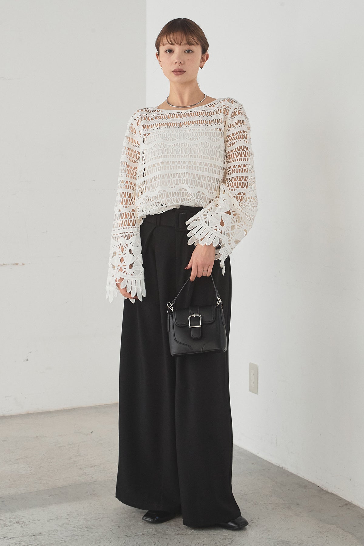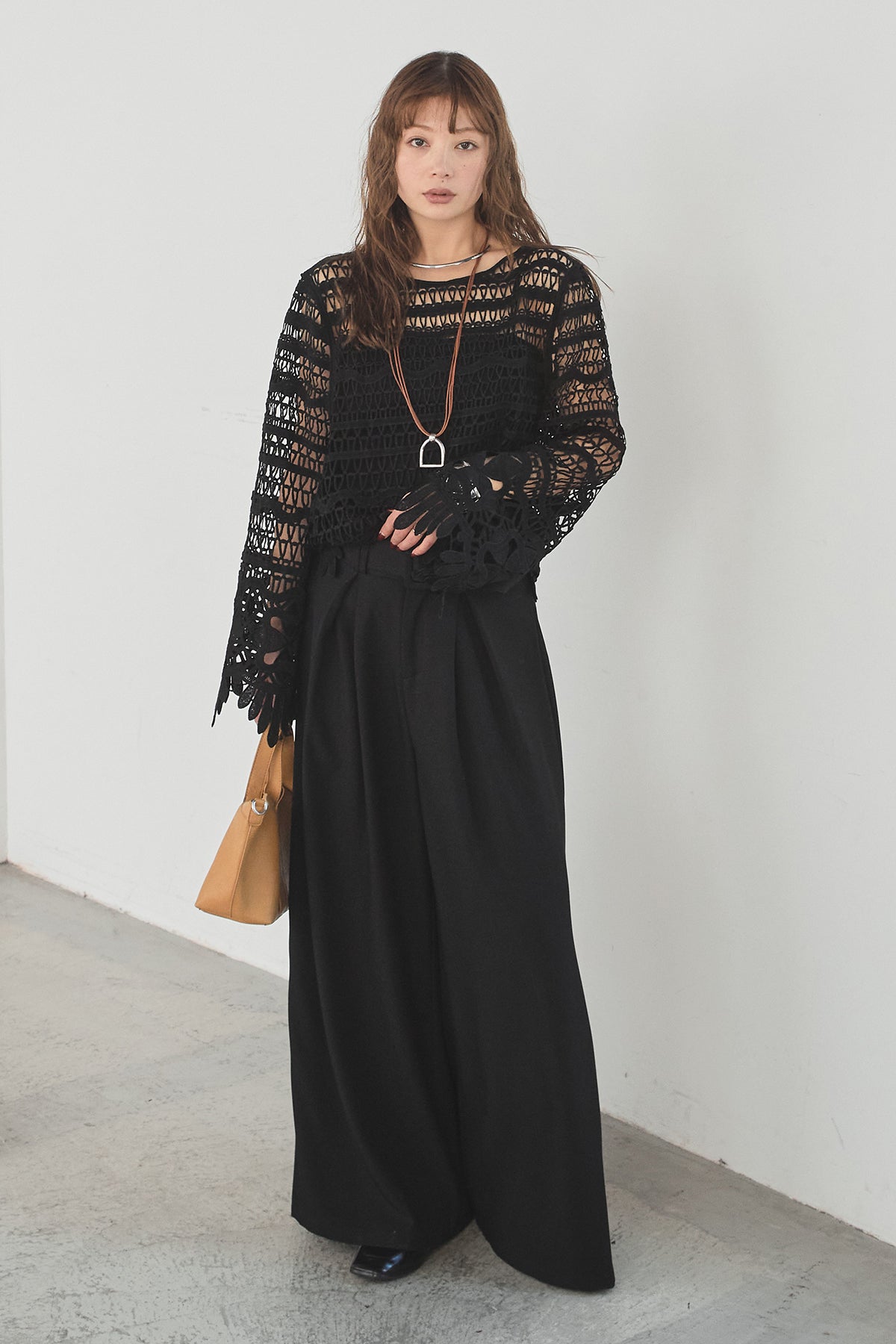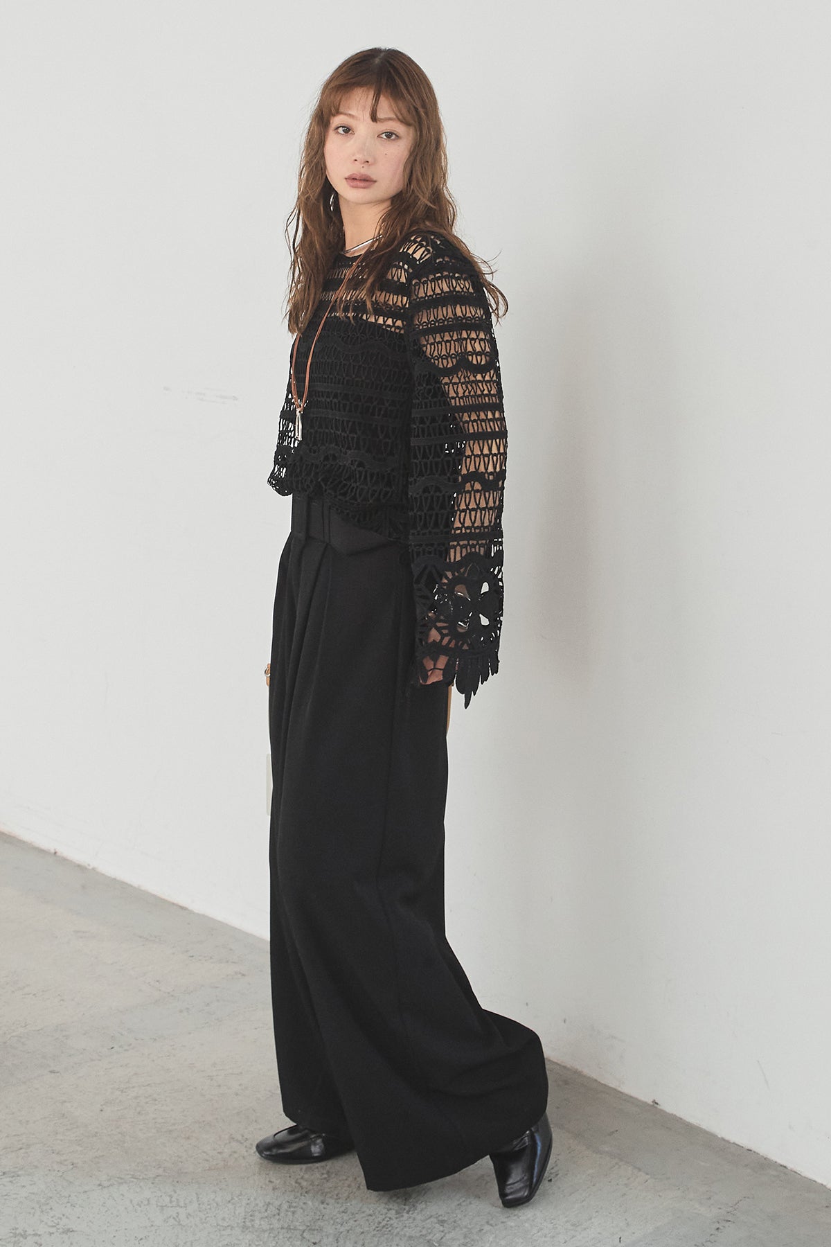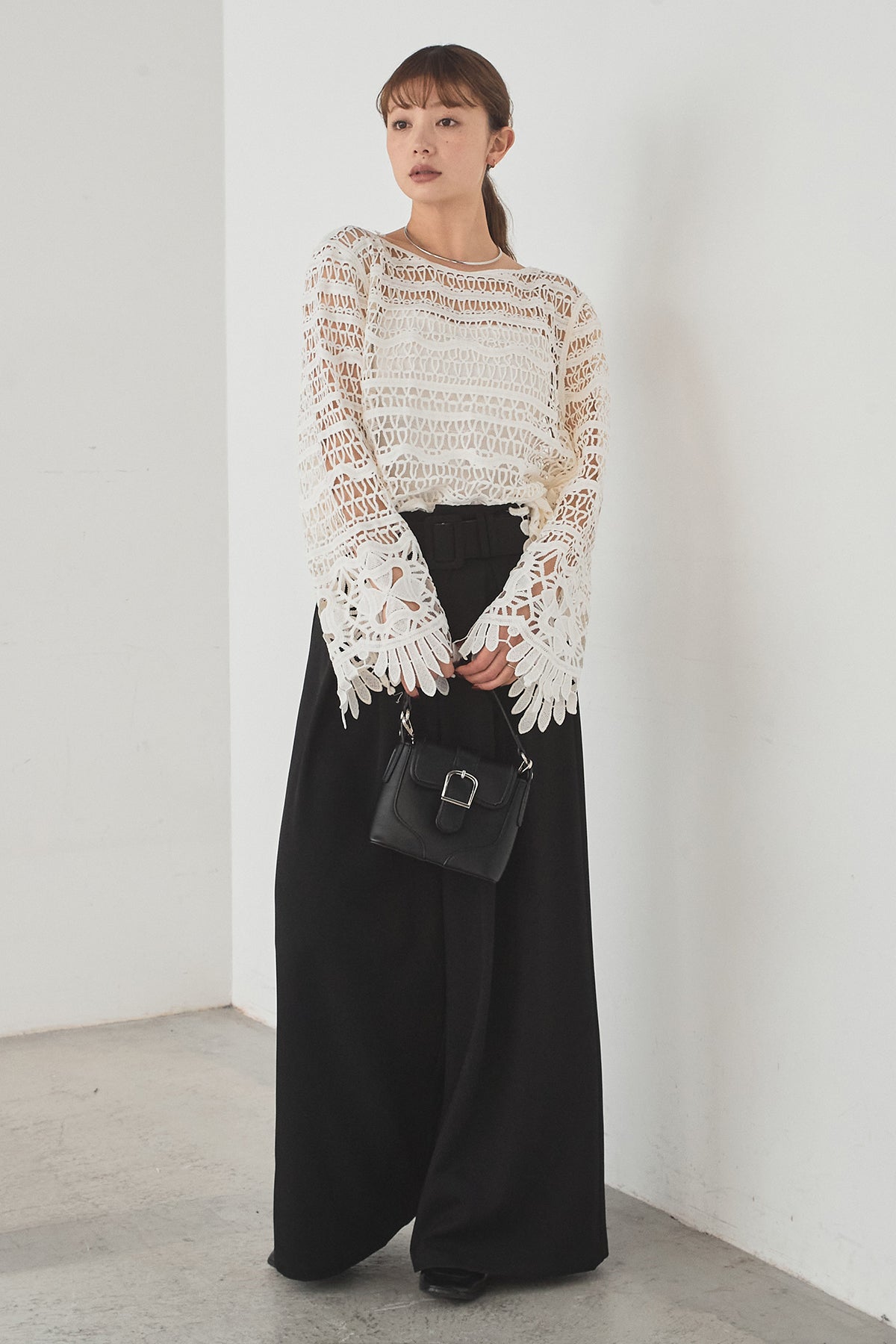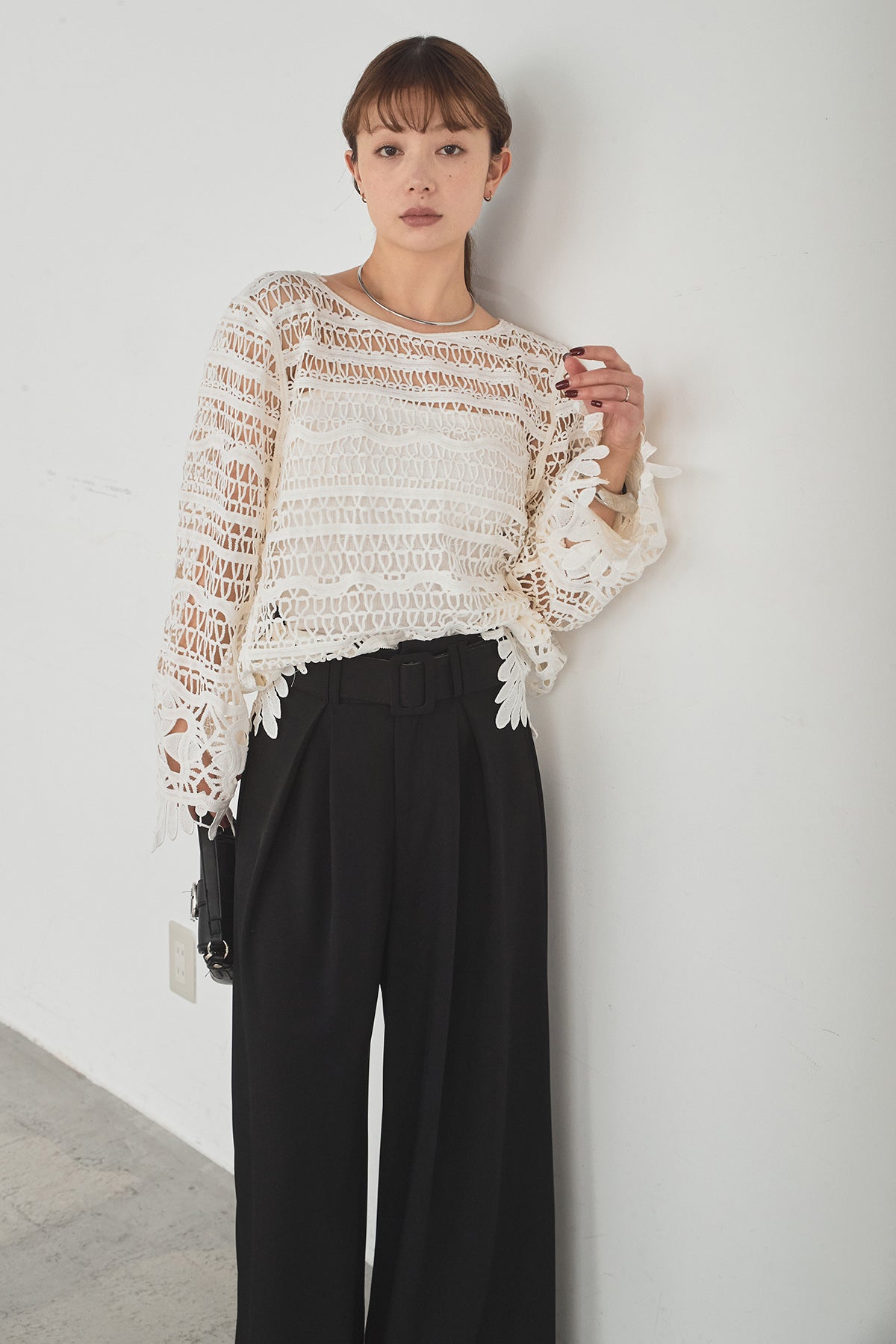 [SET]裾デザインメッシュプルオーバー+ベルト付きツータックワイドパンツ(2set)
