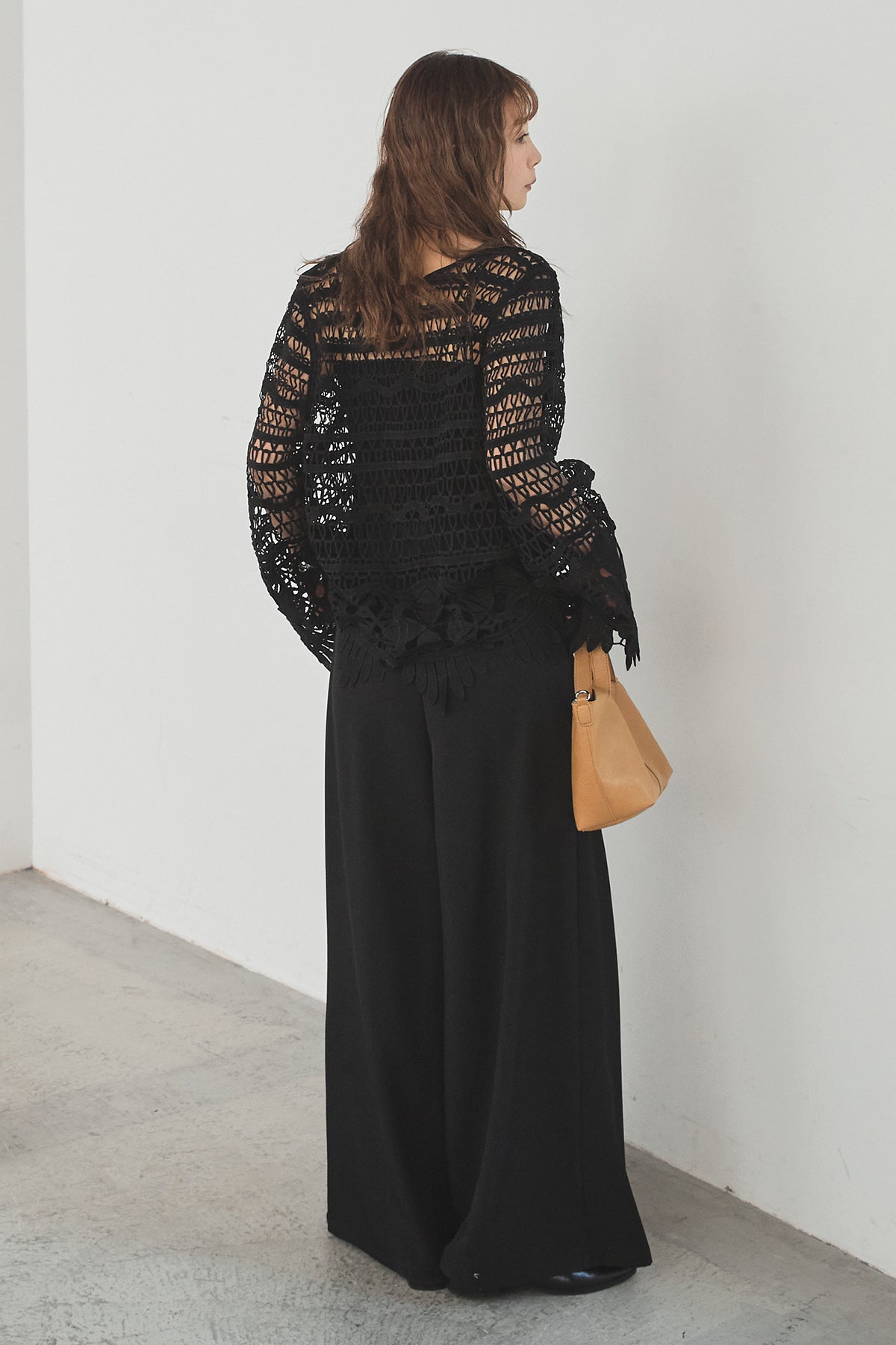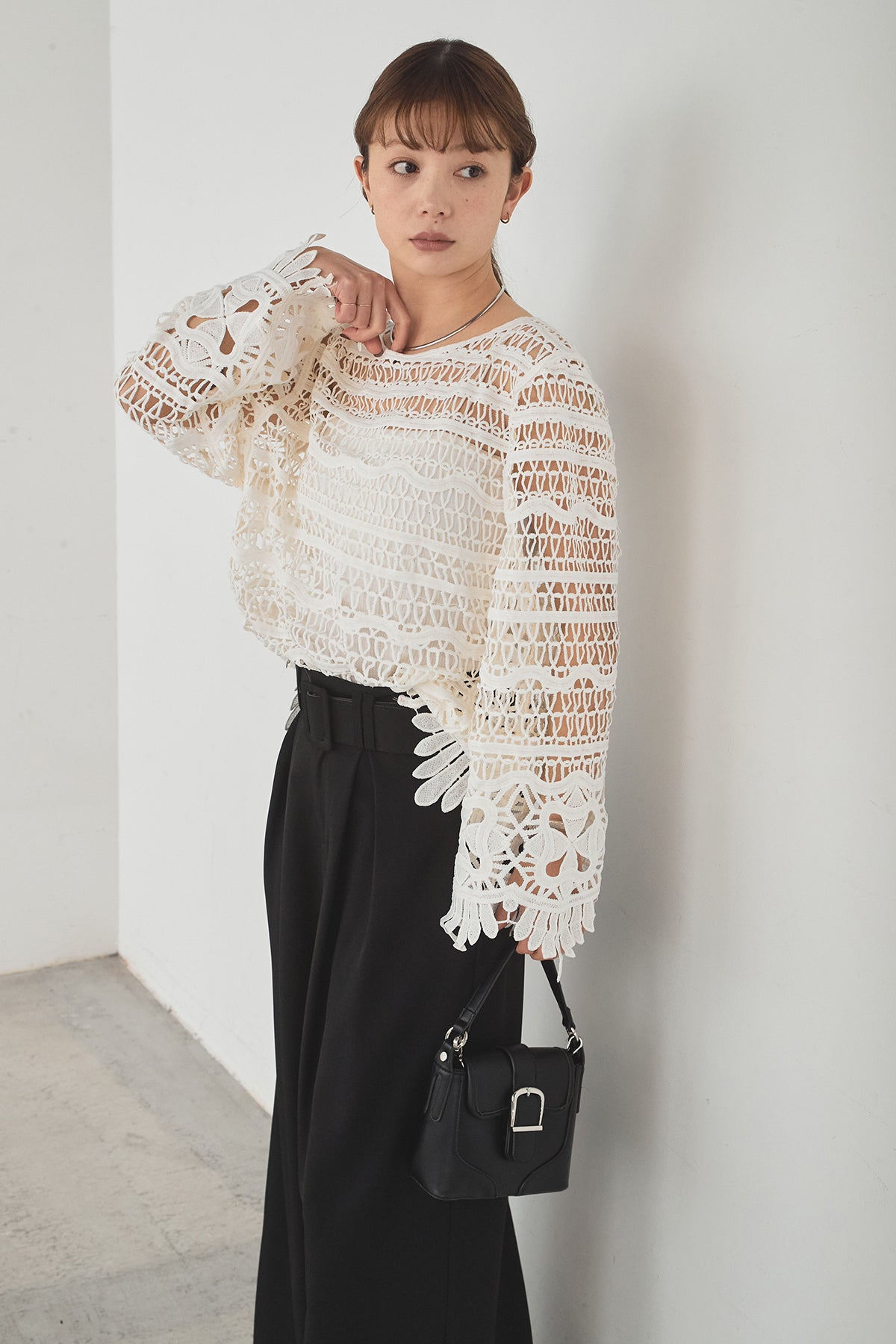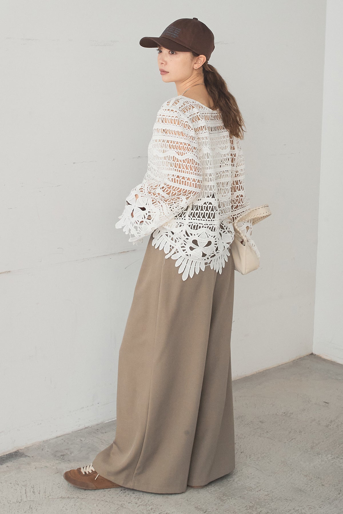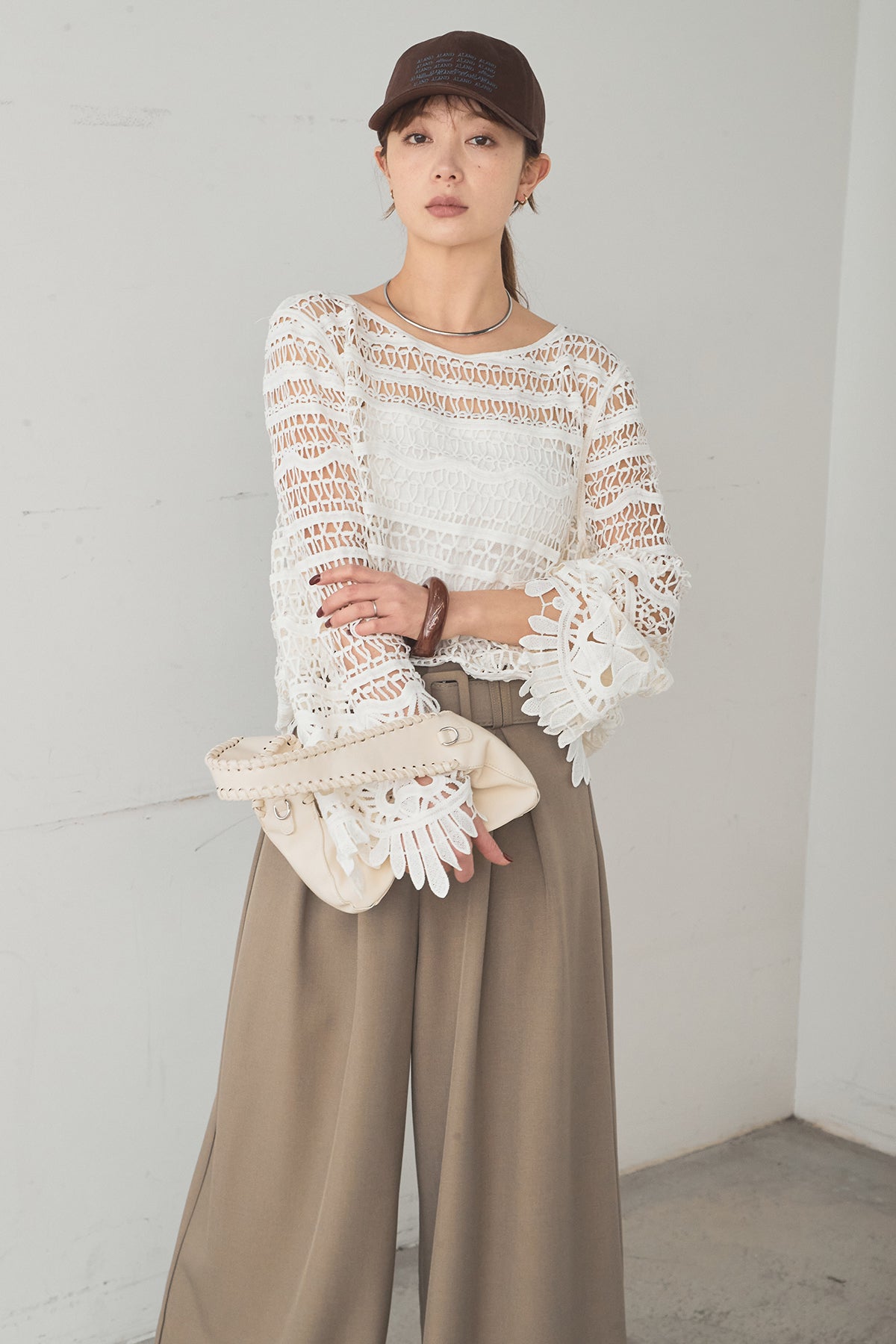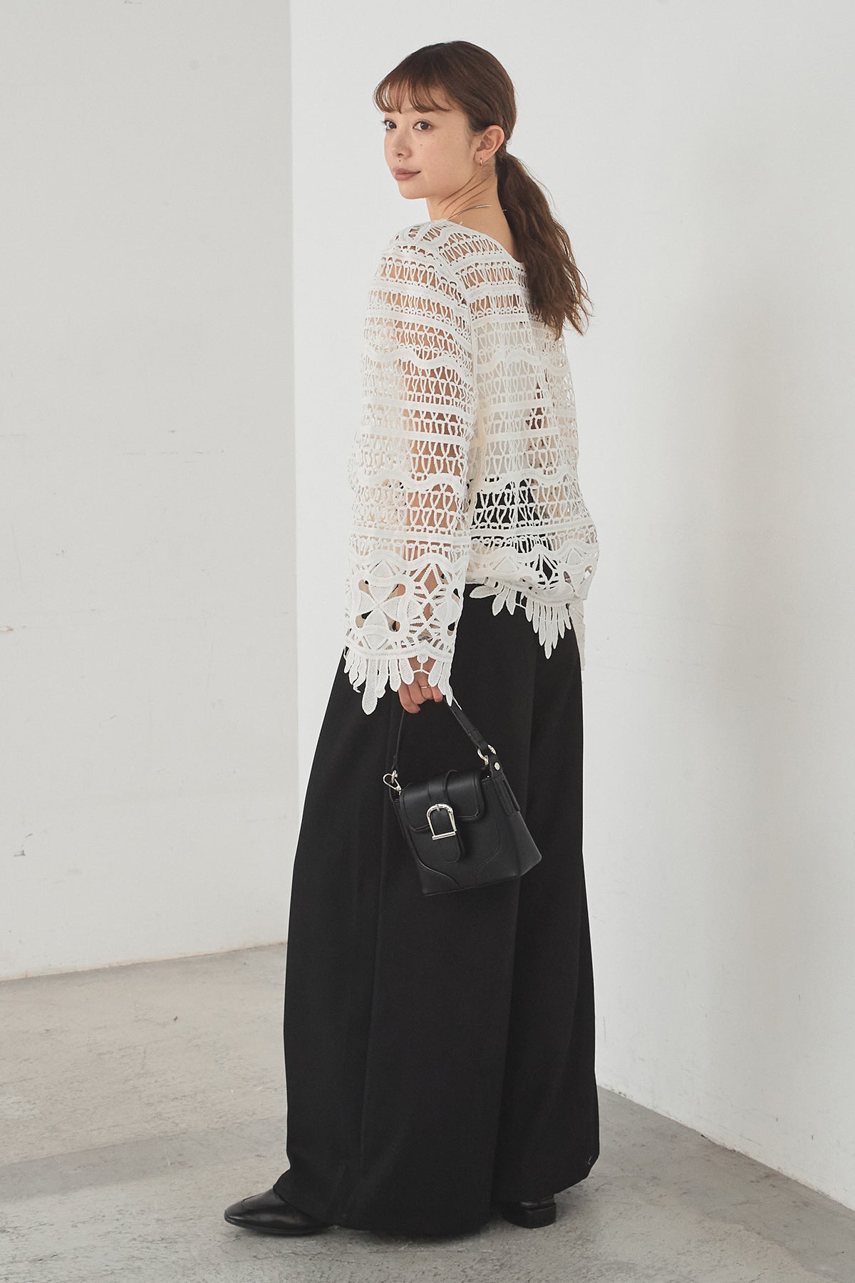 [SET]裾デザインメッシュプルオーバー+ベルト付きツータックワイドパンツ(2set)